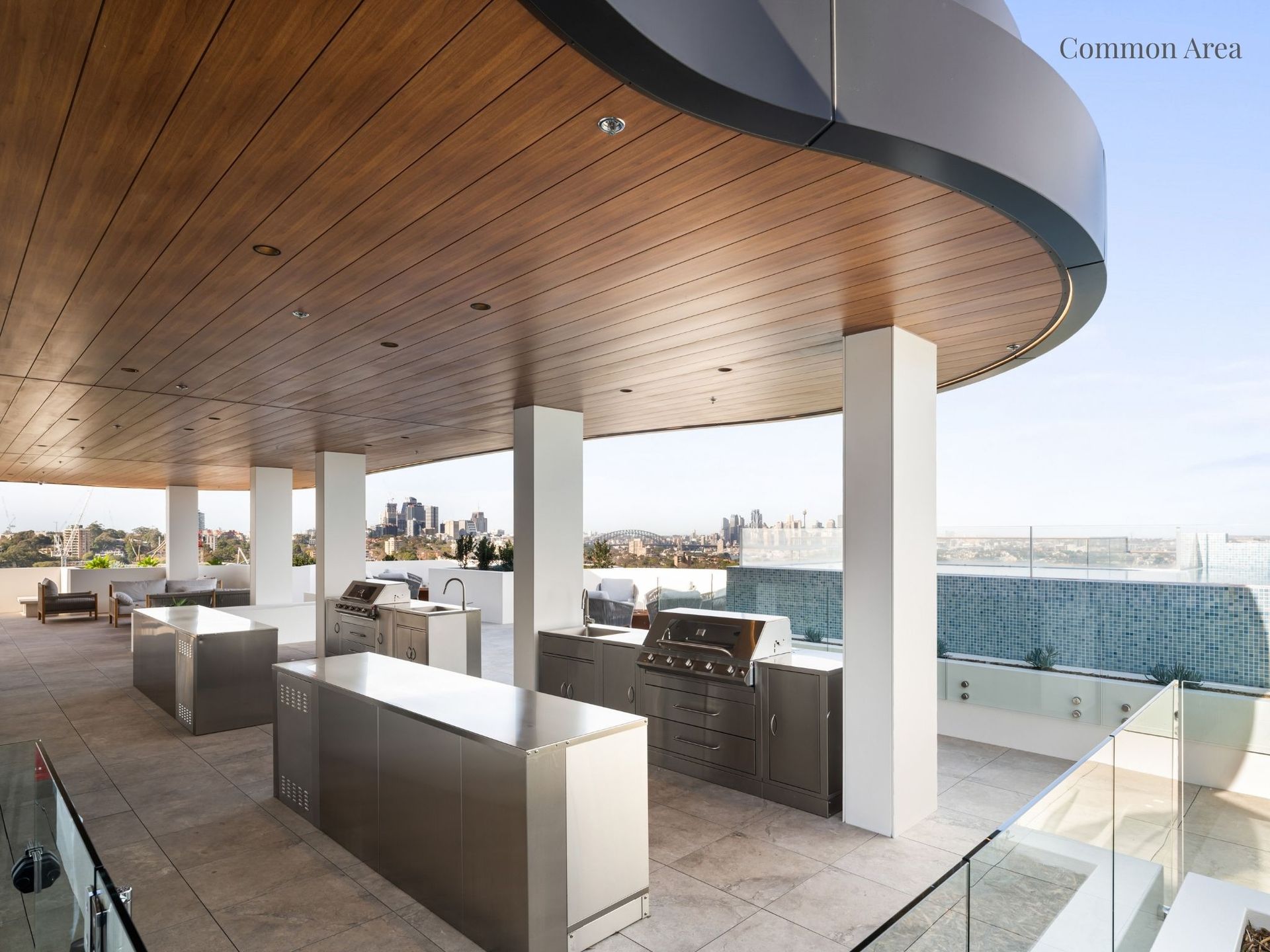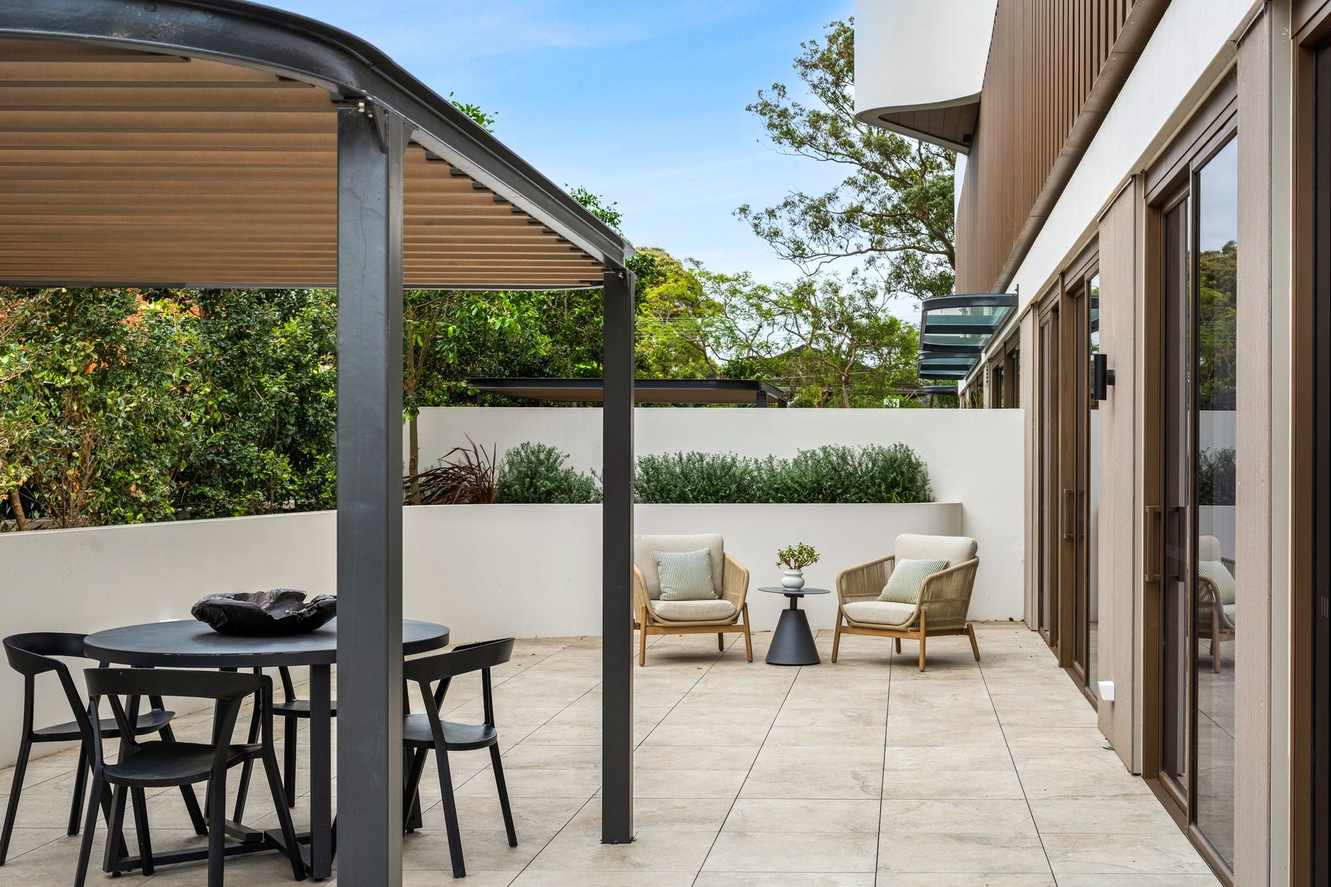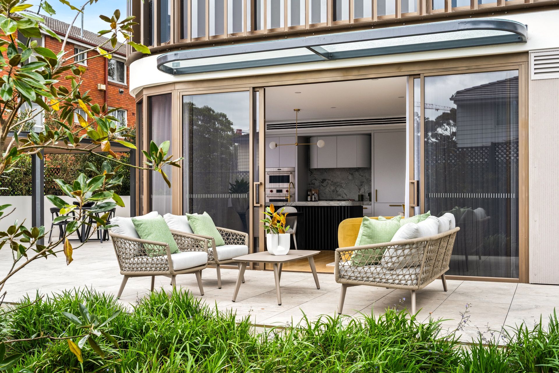 Holding an impressive 366sqm on title, the open plan concept and all three bedrooms seamlessly spill out to the wraparound courtyard. Landscaped to create multiple outdoor living spaces, including a designated barbeque area with a stylish awning, and glimpses of Sydney CBD Skyline and the Harbour Bridge. Enjoying a dual aspect, floor to ceiling glass walls maximise natural light and enhance flow to the great outdoors.