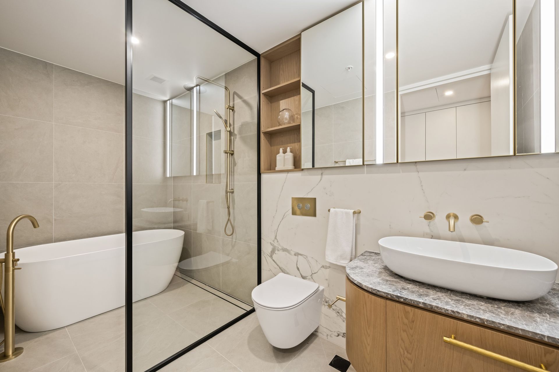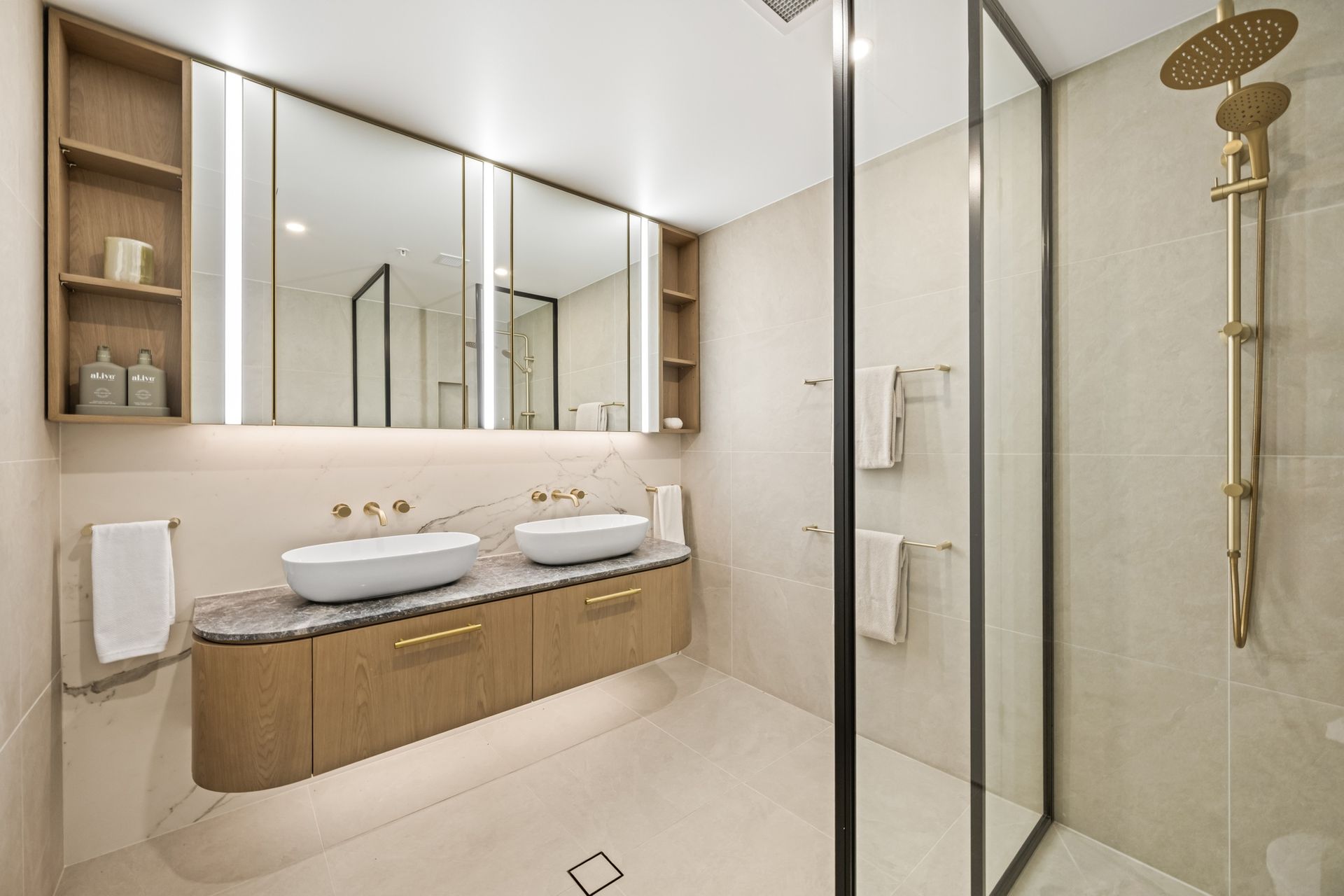 • Vanity and face level storage, brass tapware
