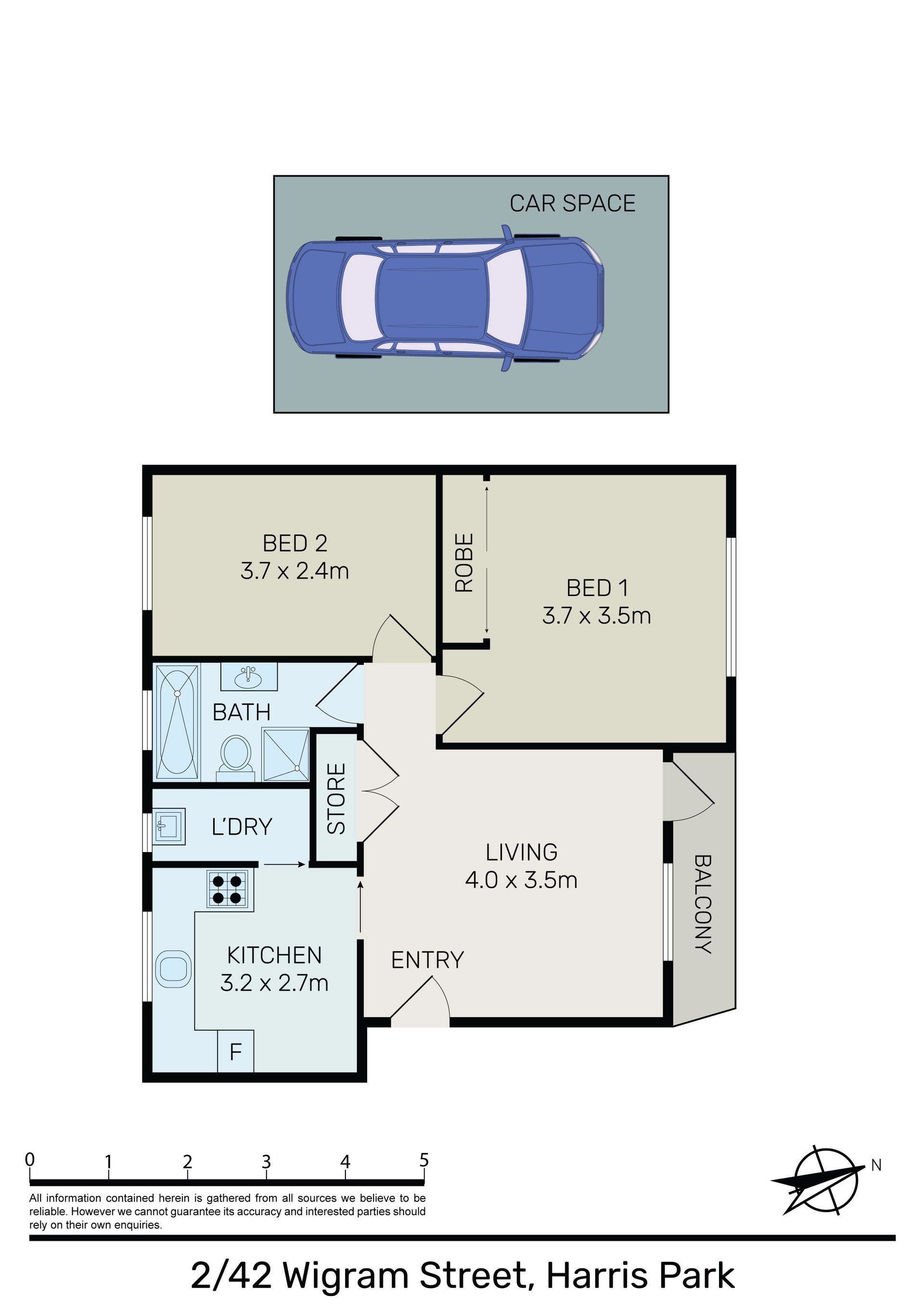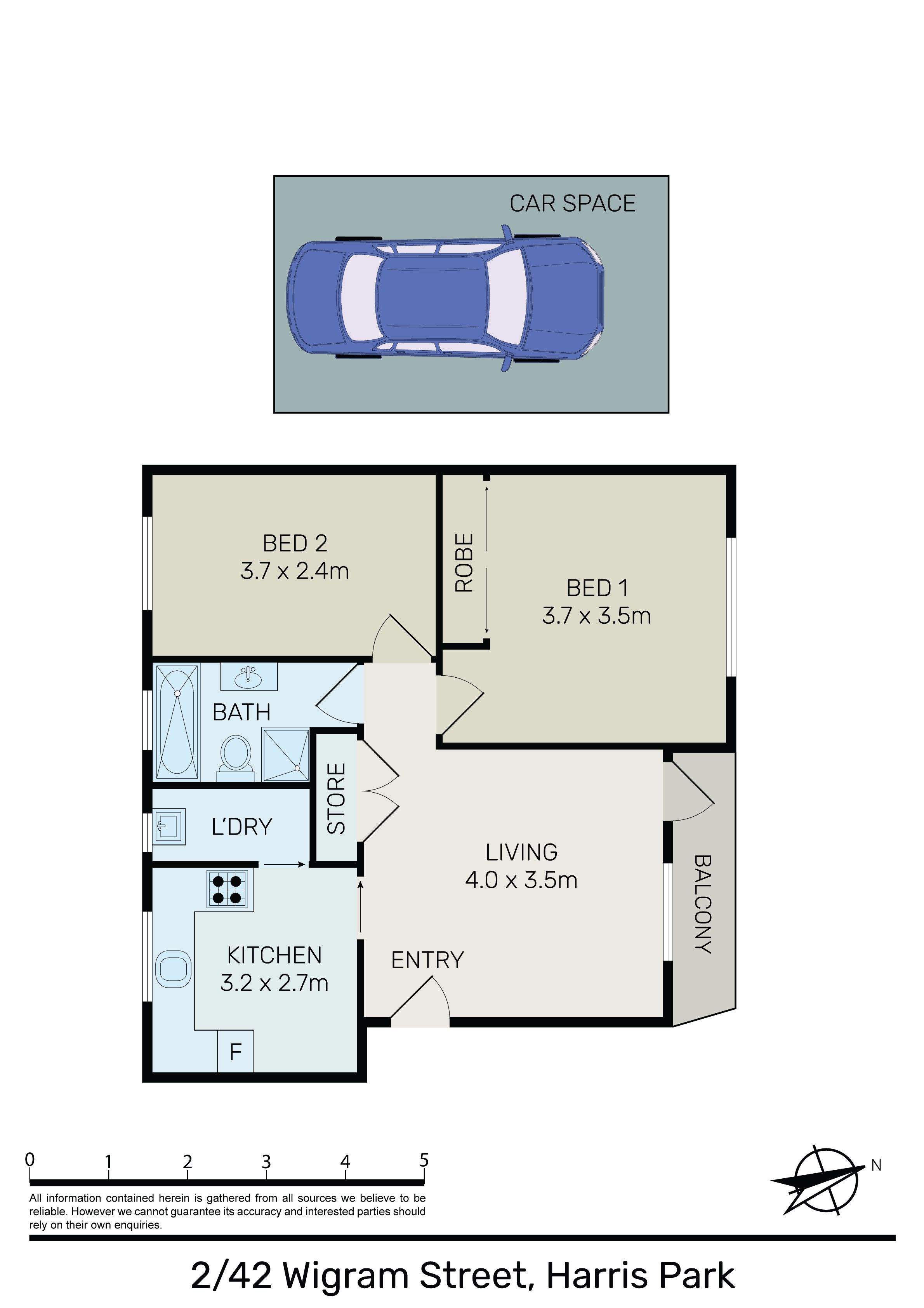 - Lounge room with access to north facing balcony - Two bedrooms main with built-in wardrobe & ceiling fan - Spacious eat-in Kitchen with electric stove - Full size bathroom with shower & bathtub - Floating floorboards throughout - Generous separate laundry - Car space at the rear of the building