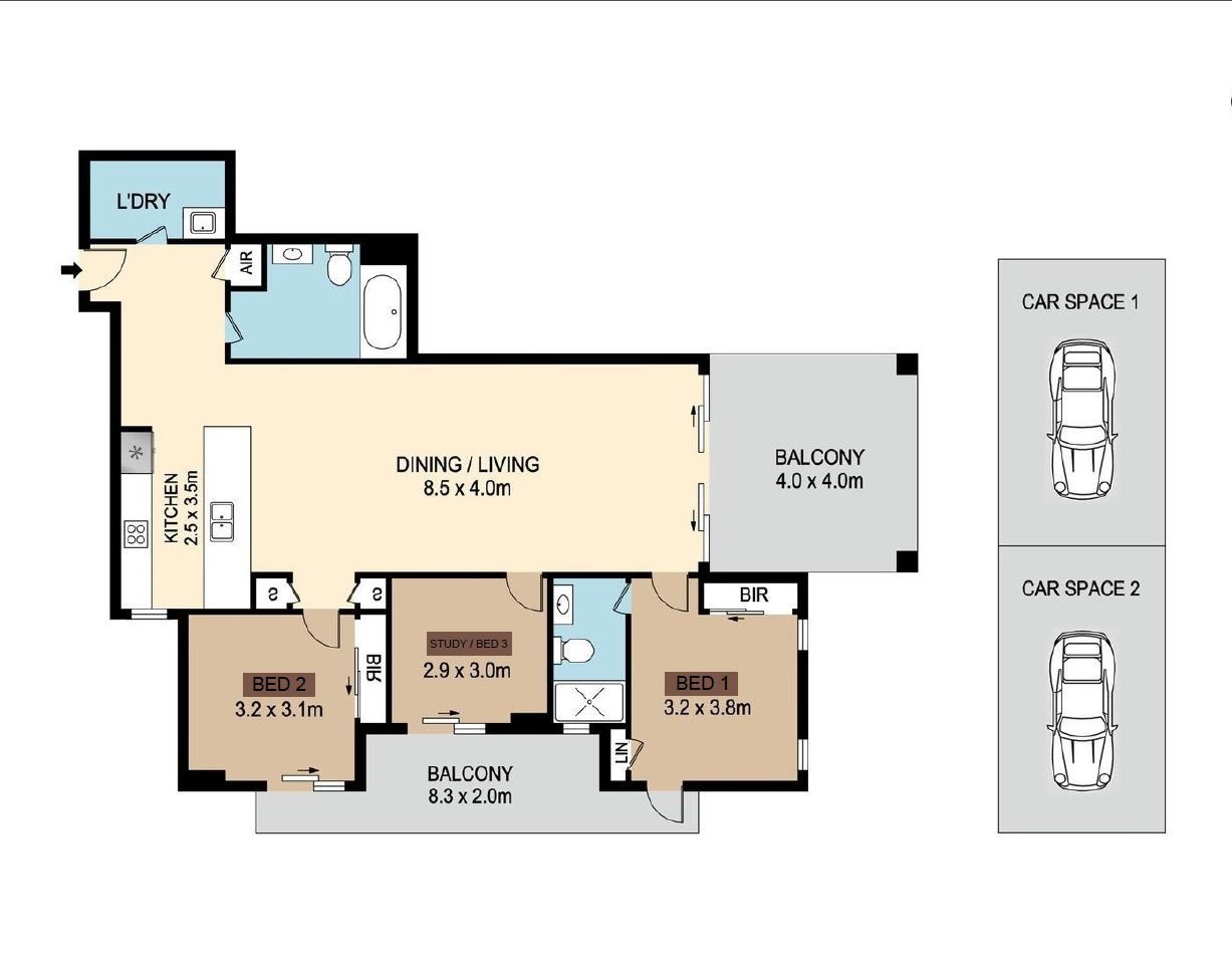 Features Include: - Expansive living and dining spaces adorned with exquisite tiling - Two generously sized bedrooms main with ensuite, each providing access to a balcony that extends your living space to the outdoors. - An additional study room that can effortlessly transform into a third bedroom, adapting to your needs. - Modern kitchen boasting stainless steel appliances, gas cooking, and a stone bench top. - Contemporary bathroom with bathtub - Experience optimal comfort with central ducted reverse cycle air conditioning - Dual spacious balconies, ideal for relaxation or entertaining - Internal laundry - 2 secure car spaces - Security building - 154m2 Total area
