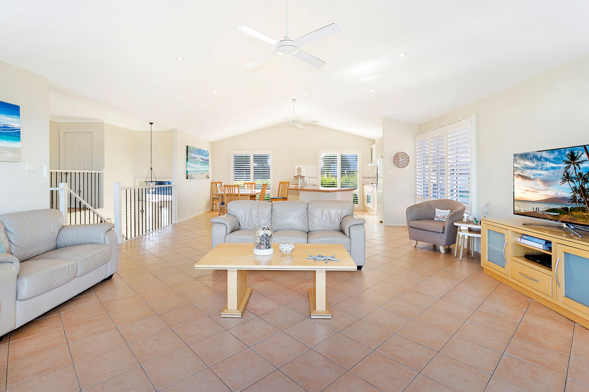 Downstairs features another two bedrooms, main bathroom, and a 2nd TV room opening to the outdoor fully fenced grassed yard.
