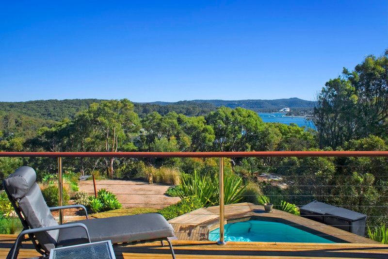 This 3 bedroom, 2 bathroom residence is totally unique to this area. Set on landscaped gardens incorporating a resort style pool and open bar, boules court and separate retreat areas. Internal space includes the formal dining room and spacious sun filled living area opening to the entertaining balcony with sweeping 270 degree views of Brisbane Water, Palm Beach and beyond. The kitchen complete with Bosch appliances and breakfast nook leads down to the outdoor areas for ease of entertaining. Sitting room , dining for 8, LCD TV, DVD, foxtel, microwave, dishwasher, air-conditioning. BBQ, outdoor furniture and paths throughout for exploring. Not suitable for young children. Maximum 4 adults only. Short drive to cafes and restaurants of exclusive Hardys Bay, minutes to Killcare Beach. Two king size beds and one single bed. Available Christmas holidays only.