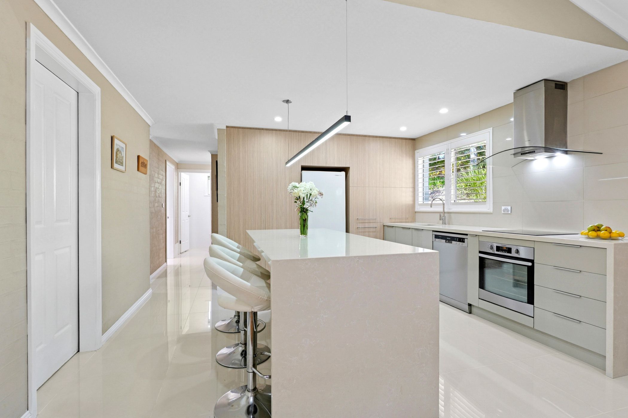 • Sleek, modern kitchen with stone benchtops, Westinghouse oven, dishwasher & electric cooktop