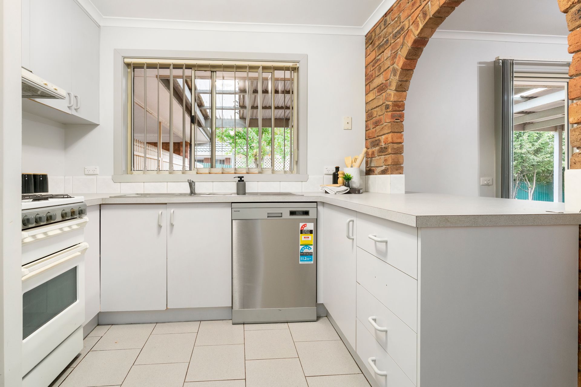 The practical kitchen includes white cabinets and pantry, a gas cooktop, an oven and a dishwasher, and a lovely breakfast bar with a beautiful brick arch diving it from the meals/living area. This area is filled with natural light coming through the sliding doors that lead outside.