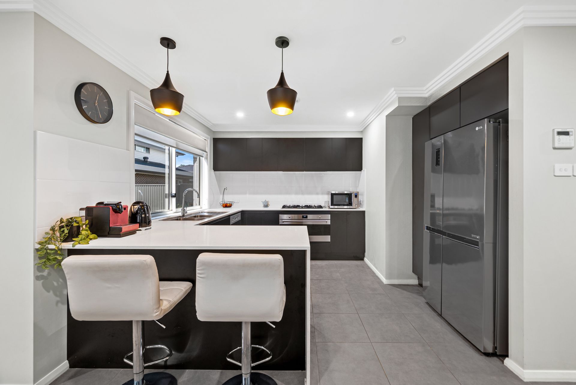 The generous kitchen is a chef's delight, overlooking the living spaces and equipped with stone benchtops, gas cooking facilities, and ample storage, ensuring both practicality and aesthetic appeal.