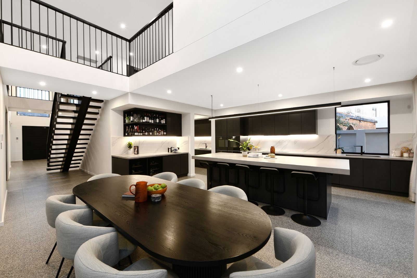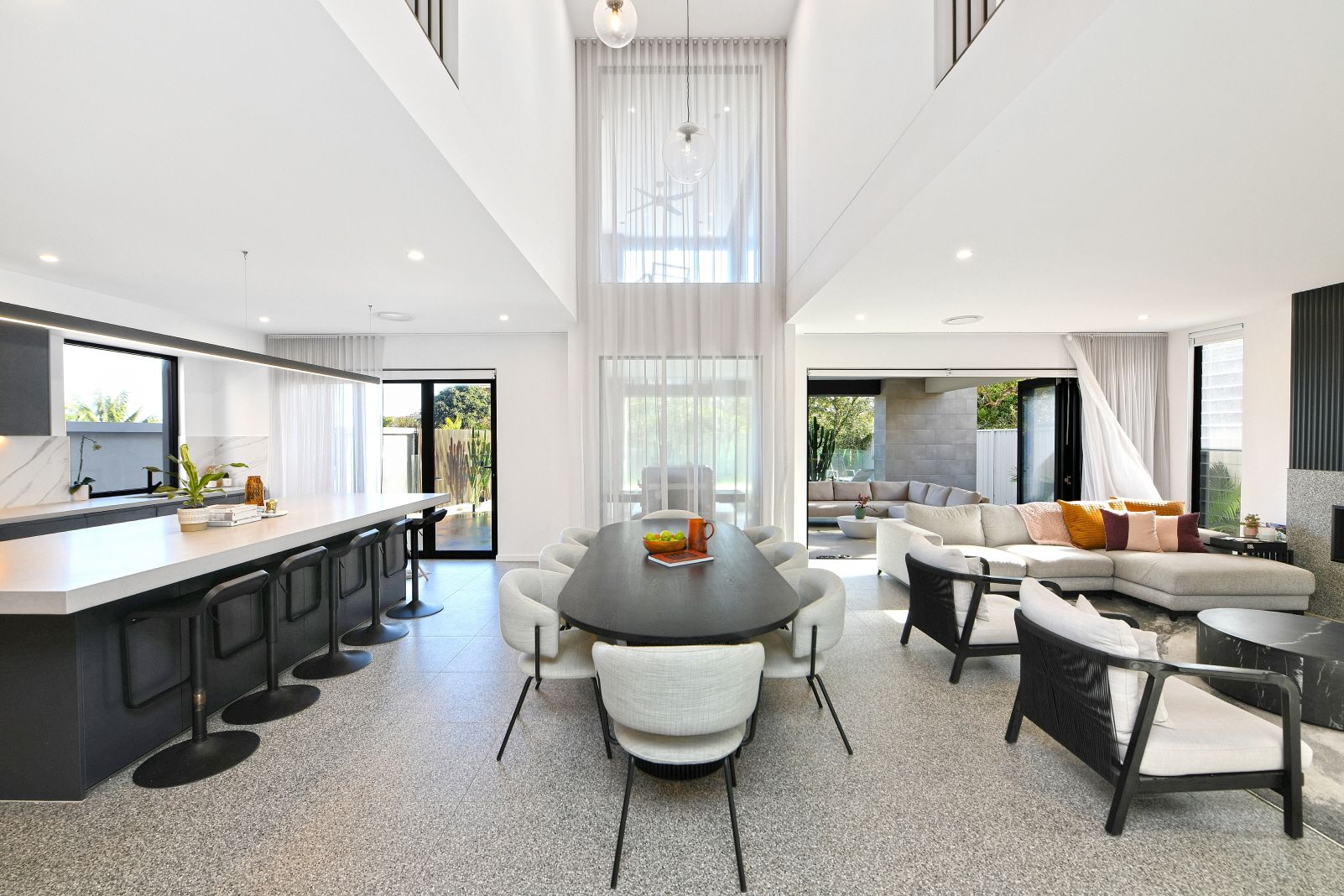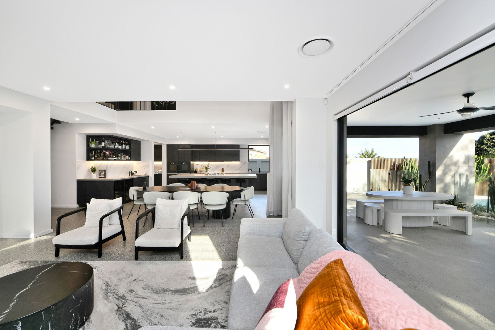 - Chef's kitchen with 3.3m stone island and a Butler's pantry - Zip HydroTap, premium Gaggenau appliances, wine fridges - Vast living area includes a cocktail bar and Escea fireplace - Moody palette incorporates Terrazzo and concrete accents - Seamless transitions to the outdoor room and pool zone - Sunny landscaped gardens fringed by cacti and succulents - All bedrooms feature an ensuite, four include walk-in robes - Hotel-style master with standalone bath and dressing room - Bathrooms with heated floors, powder room, laundry chute - 3 car garage, keyless access, alarm, CCTV, home automation