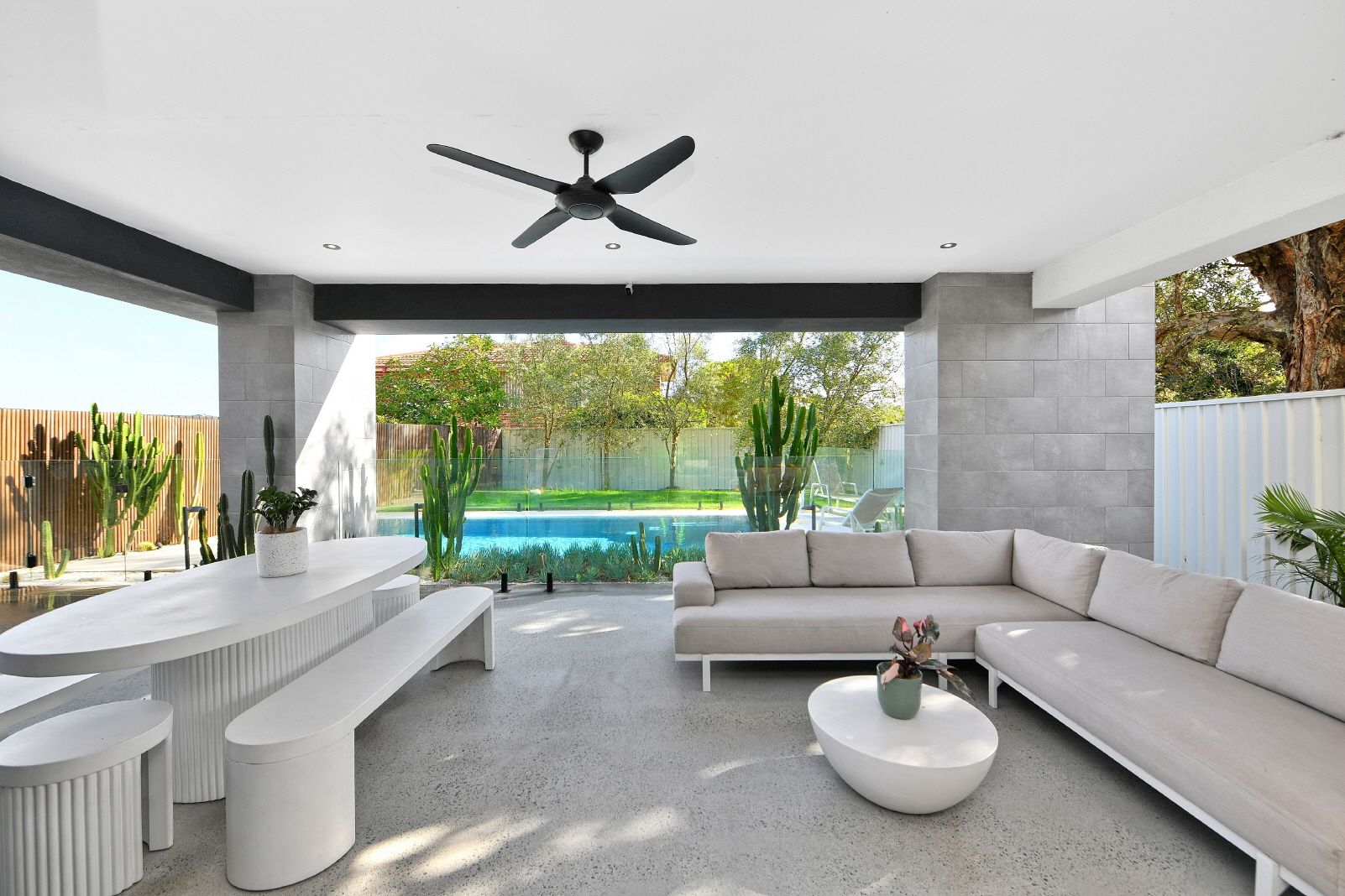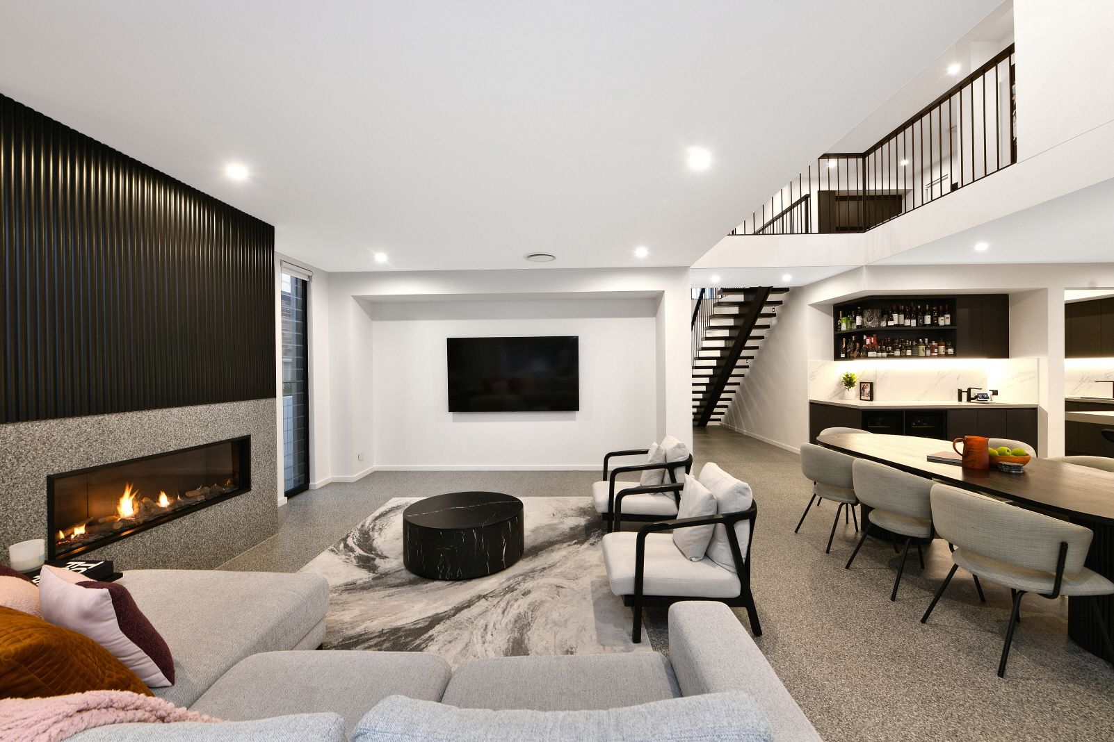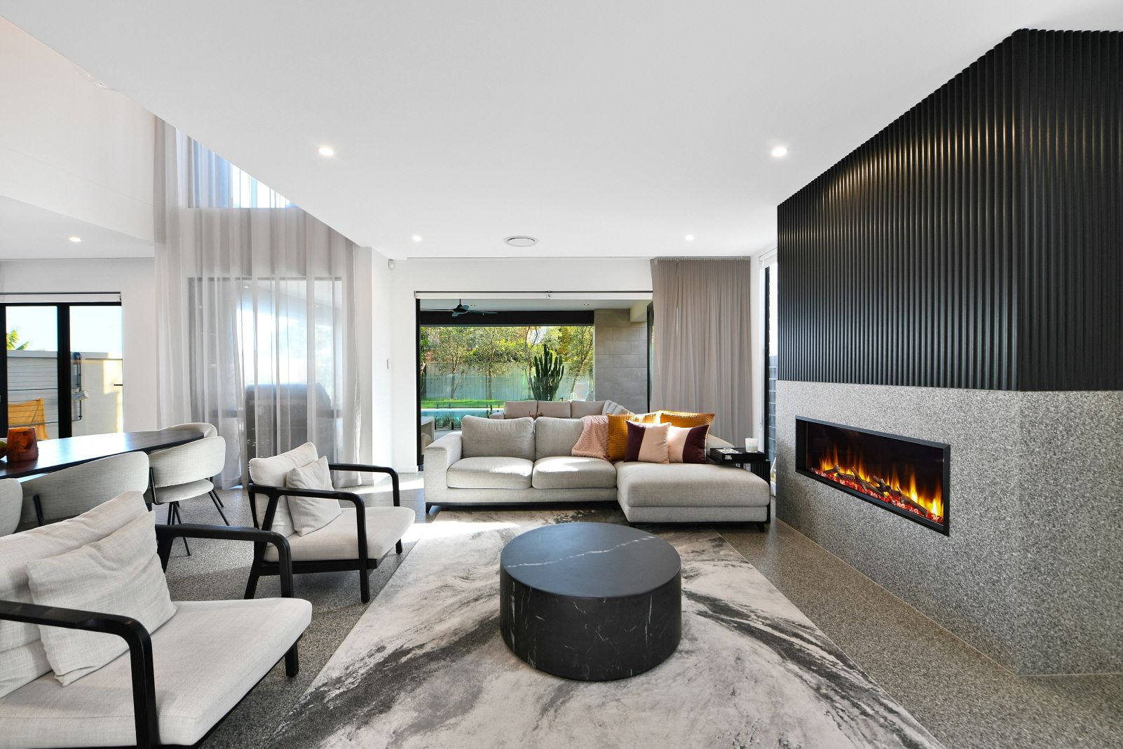 - Chef's kitchen with 3.3m stone island and a Butler's pantry - Zip HydroTap, premium Gaggenau appliances, wine fridges - Vast living area includes a cocktail bar and Escea fireplace - Moody palette incorporates Terrazzo and concrete accents - Seamless transitions to the outdoor room and pool zone - Sunny landscaped gardens fringed by cacti and succulents - All bedrooms feature an ensuite, four include walk-in robes - Hotel-style master with standalone bath and dressing room - Bathrooms with heated floors, powder room, laundry chute - 3 car garage, keyless access, alarm, CCTV, home automation