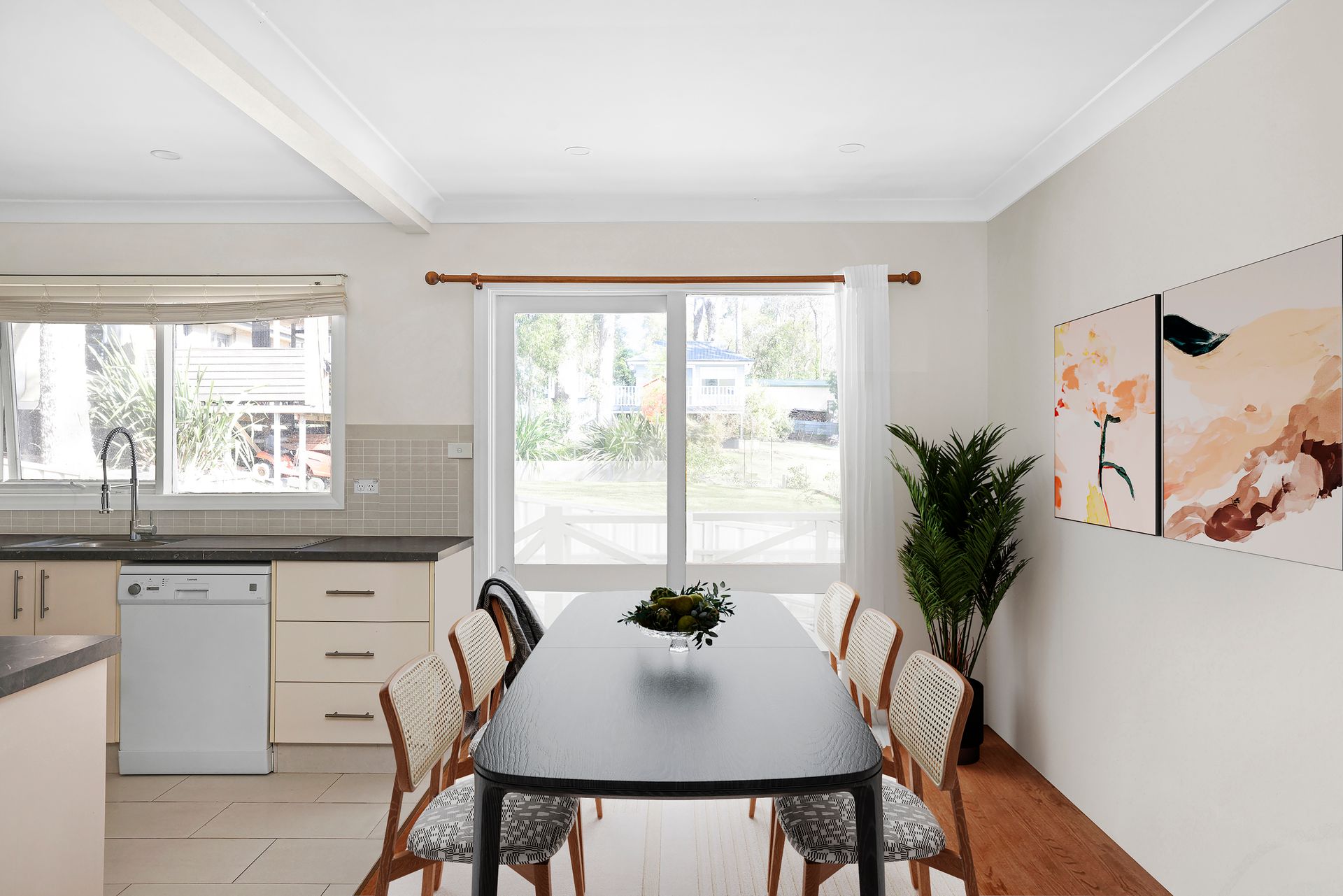 The spacious kitchen offers rear yard views, and also cleverly includes a hidden laundry area, complete with space for a washer and dryer.