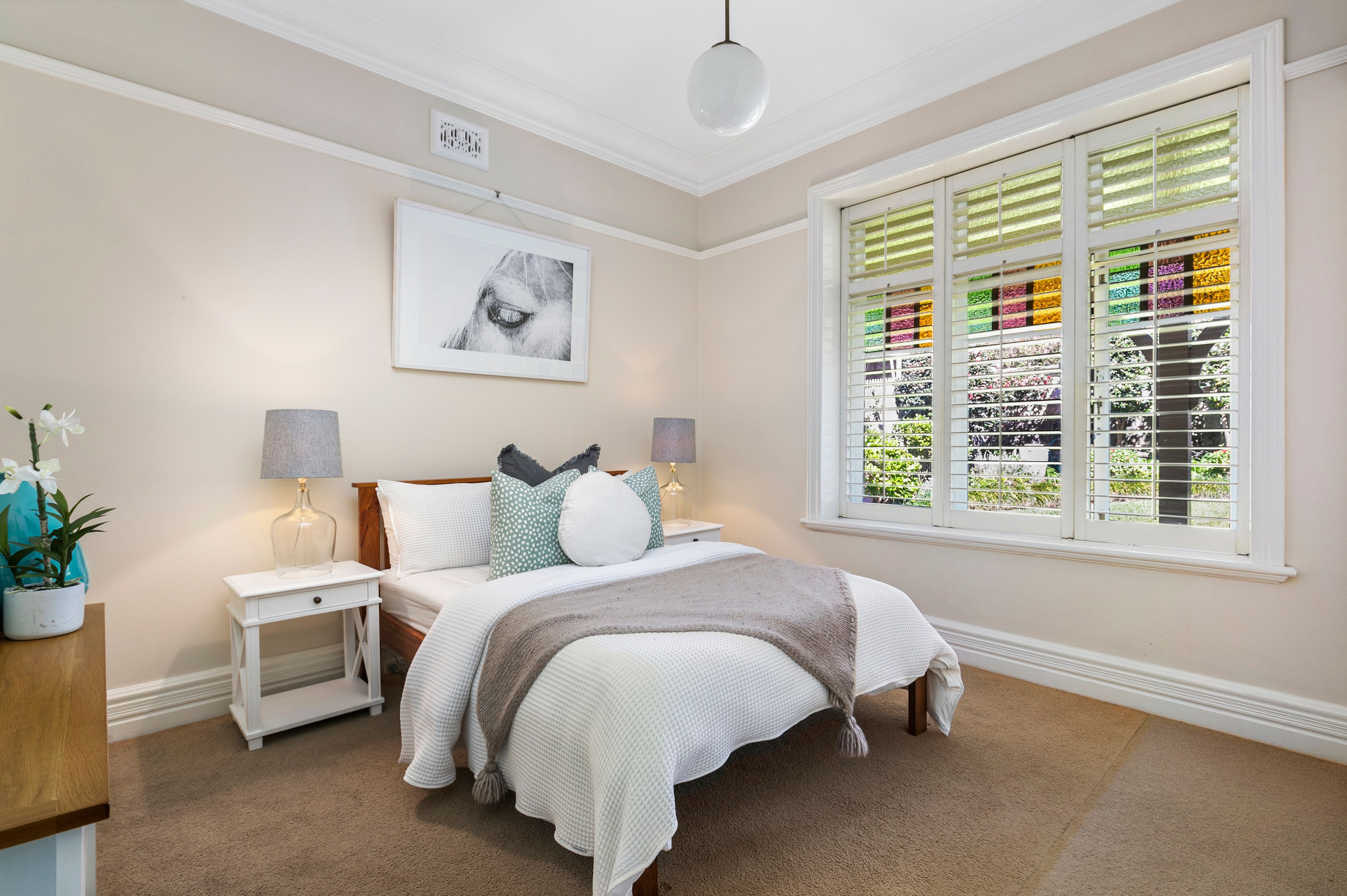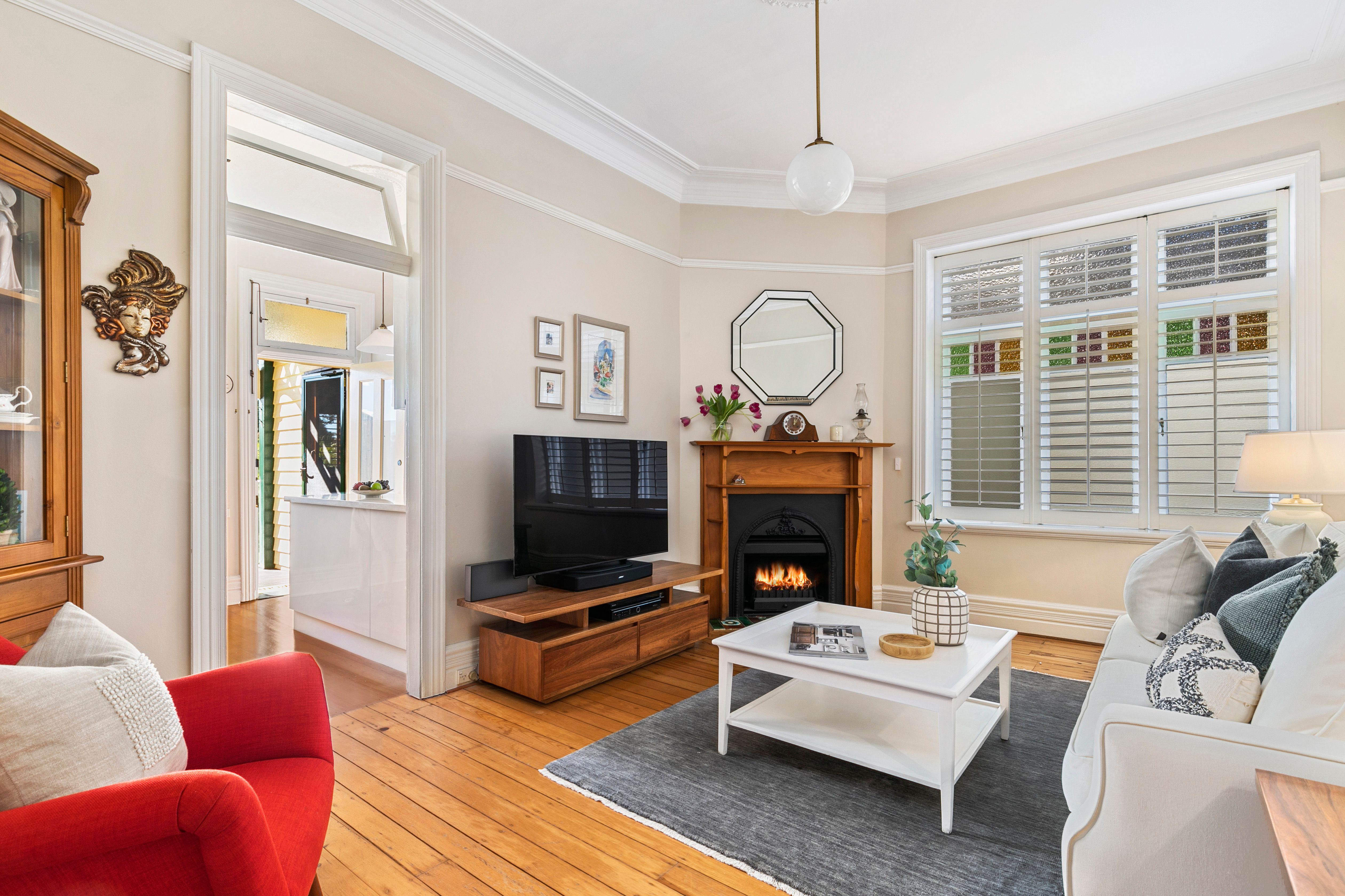- Elegant lounge room plus a versatile TV and an upper level study - Open-plan pendant lit dining room alongside the renovated kitchen - Stunning original brick chimney and mantle housing the Smeg gas cooker - Kitchen joinery topped in timeless Caesarstone, integrated dishwasher - Warmed by a gas fireplace, three other gas bayonets on entry level - Filtered Middle Harbour views from the master bedroom balcony - Built-in robes feature in all four bedrooms, additional roofline storage - Family bathroom updated with brass tapware, separate powder room - Second bathroom with traditional tiling and a striking clawfoot bath tub - Original timber floorboards, ornate archway and multiple ceiling roses - White plantation shutters dressing the traditional stained glass windows - Lofty proportions, high skirting boards, detailed cornicing, picture rails - Large linen press, air-conditioning and a sub-floor ventilation system - Tessellated tile front veranda adorned with intricate timber fretwork - Walk to Middle Harbour Public School and Northern Nursery School - Short drive into the CBD avoiding the traffic challenges of Military Road - 700m walk to Bridgepoint's cafes and shops, 260m to Countess Park - Park down the road - Congewoi Road.