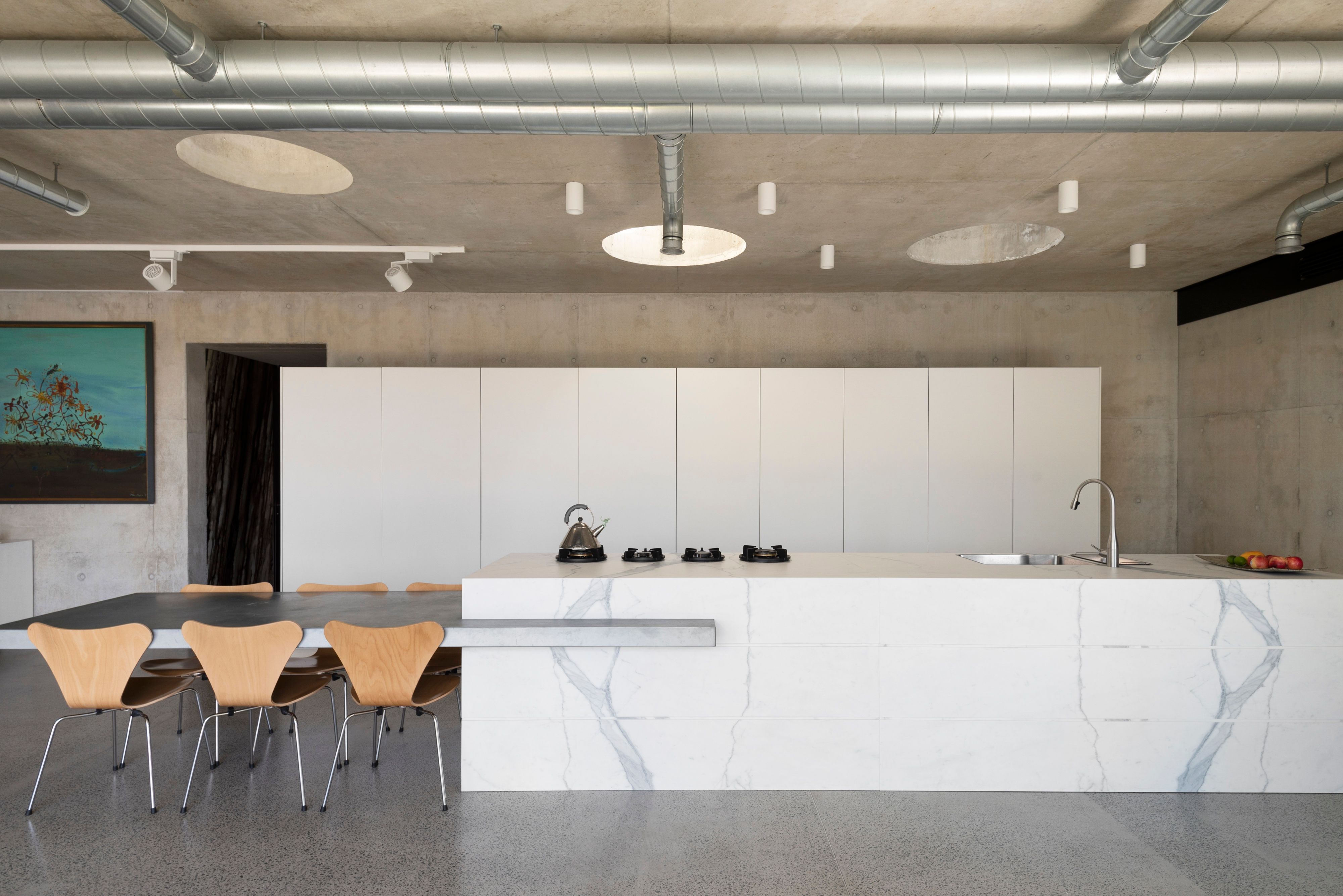 Personalised by a series of hand-picked marble walls, the natural and tactile nature of the stone spectacularly complements the artisan brass wall panels featuring throughout. Three sculptural light wells sit above the streamlined chef's kitchen complete with fully integrated Liebherr and Gaggenau appliances in addition to a butlers' pantry and glass enclosed wine cellar.