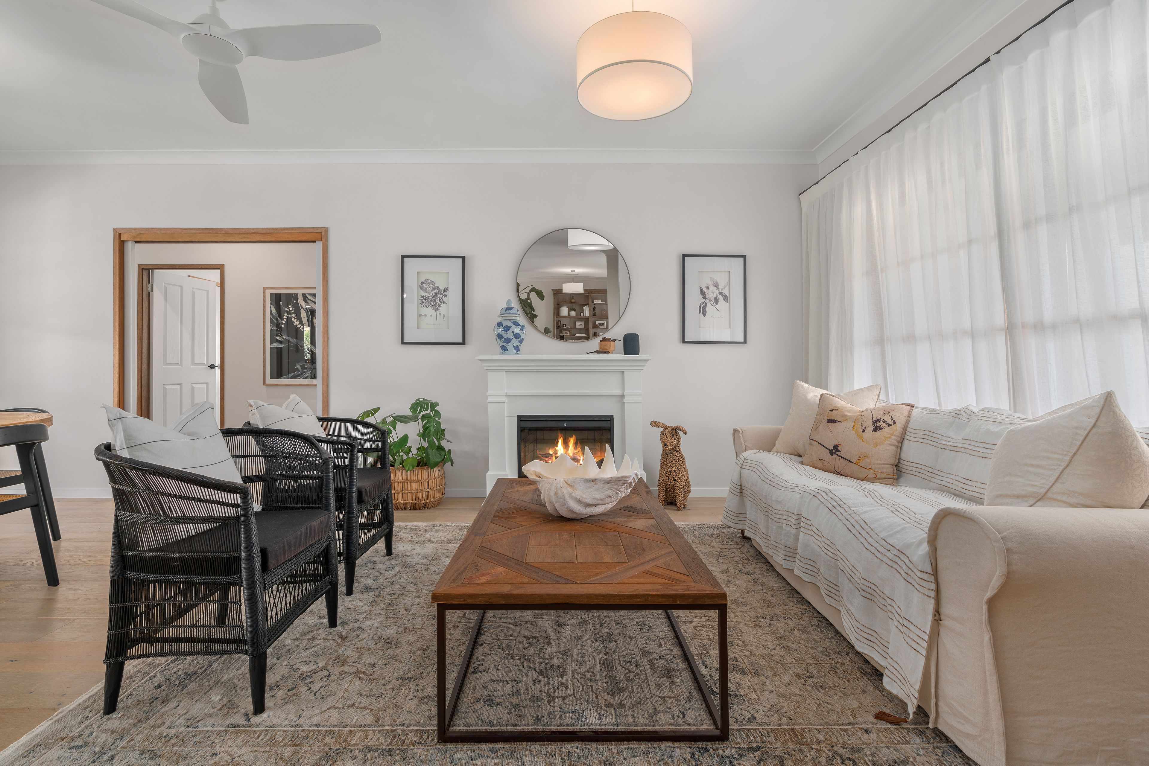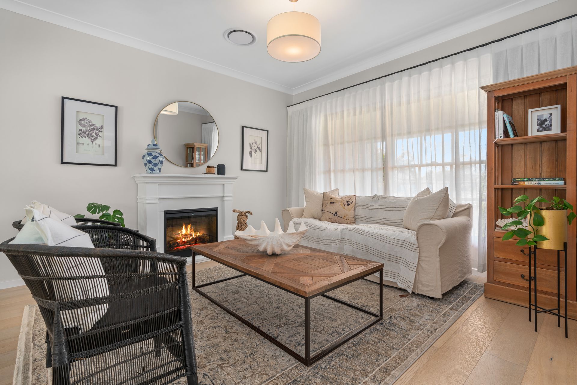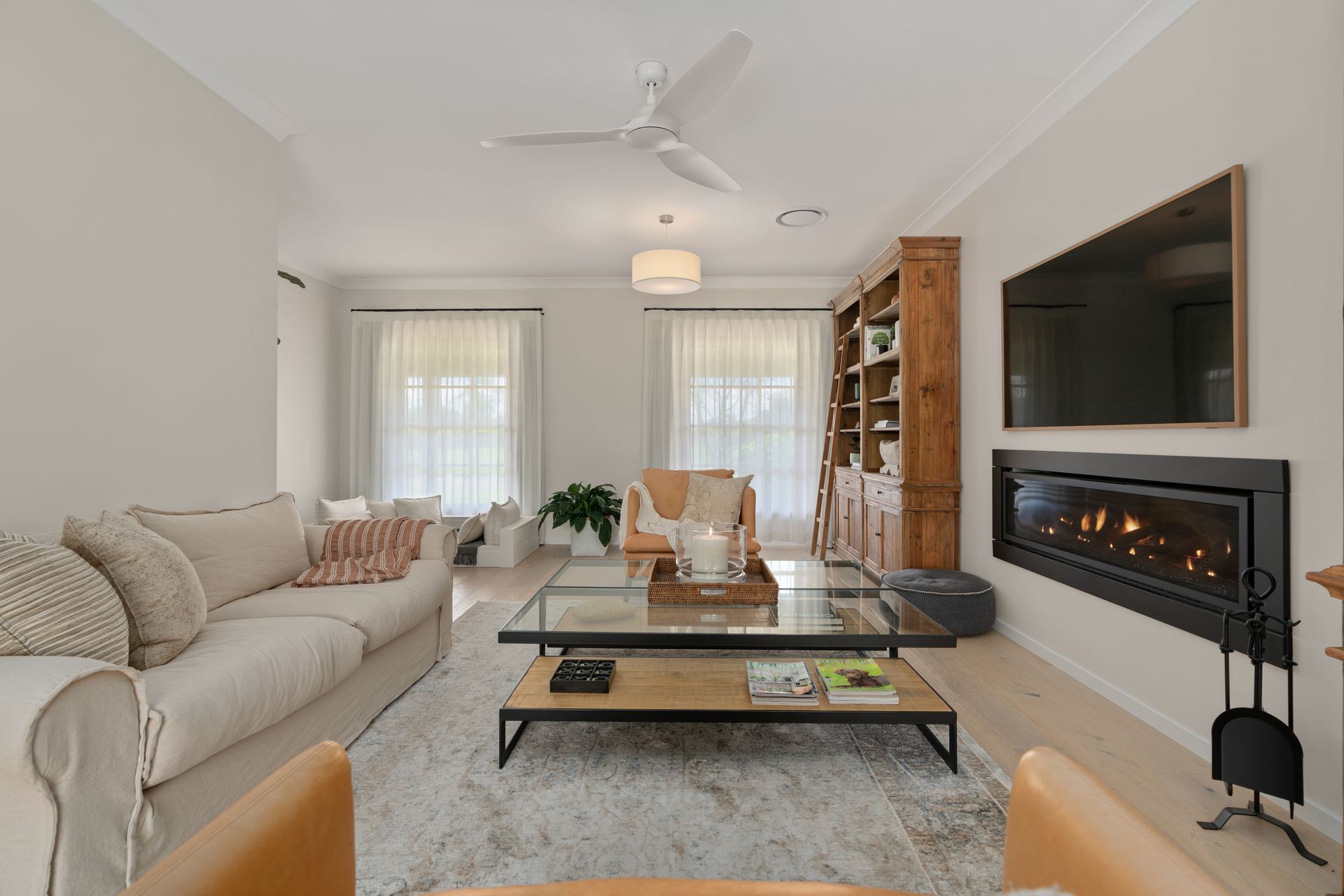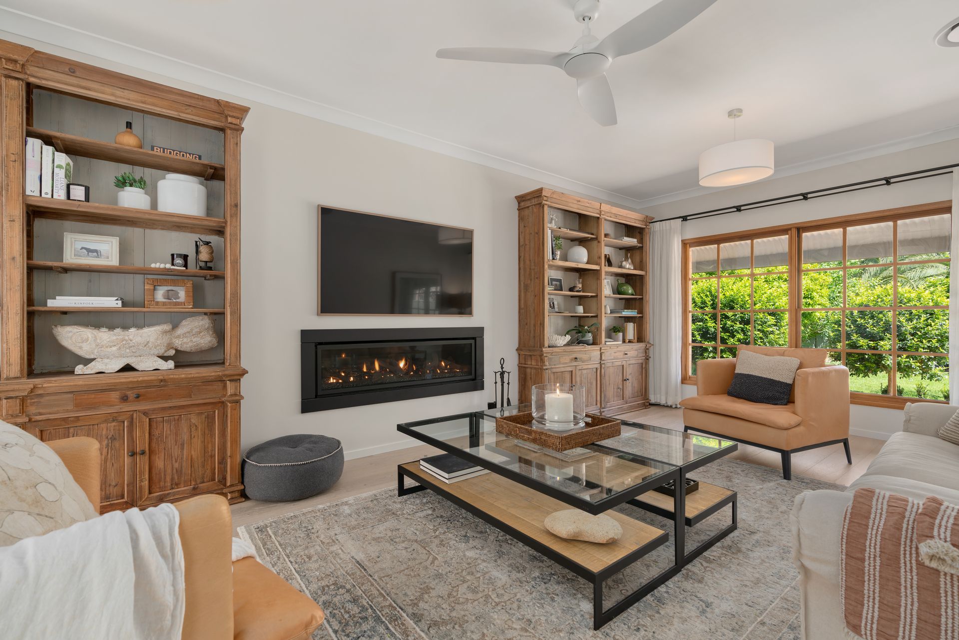 • The formal lounge area features a mounted Samsung 'The Frame' TV, 2x French provincial bookcases, linen curtains, and a 'Luminar' Inbuilt Gas Log Fire.