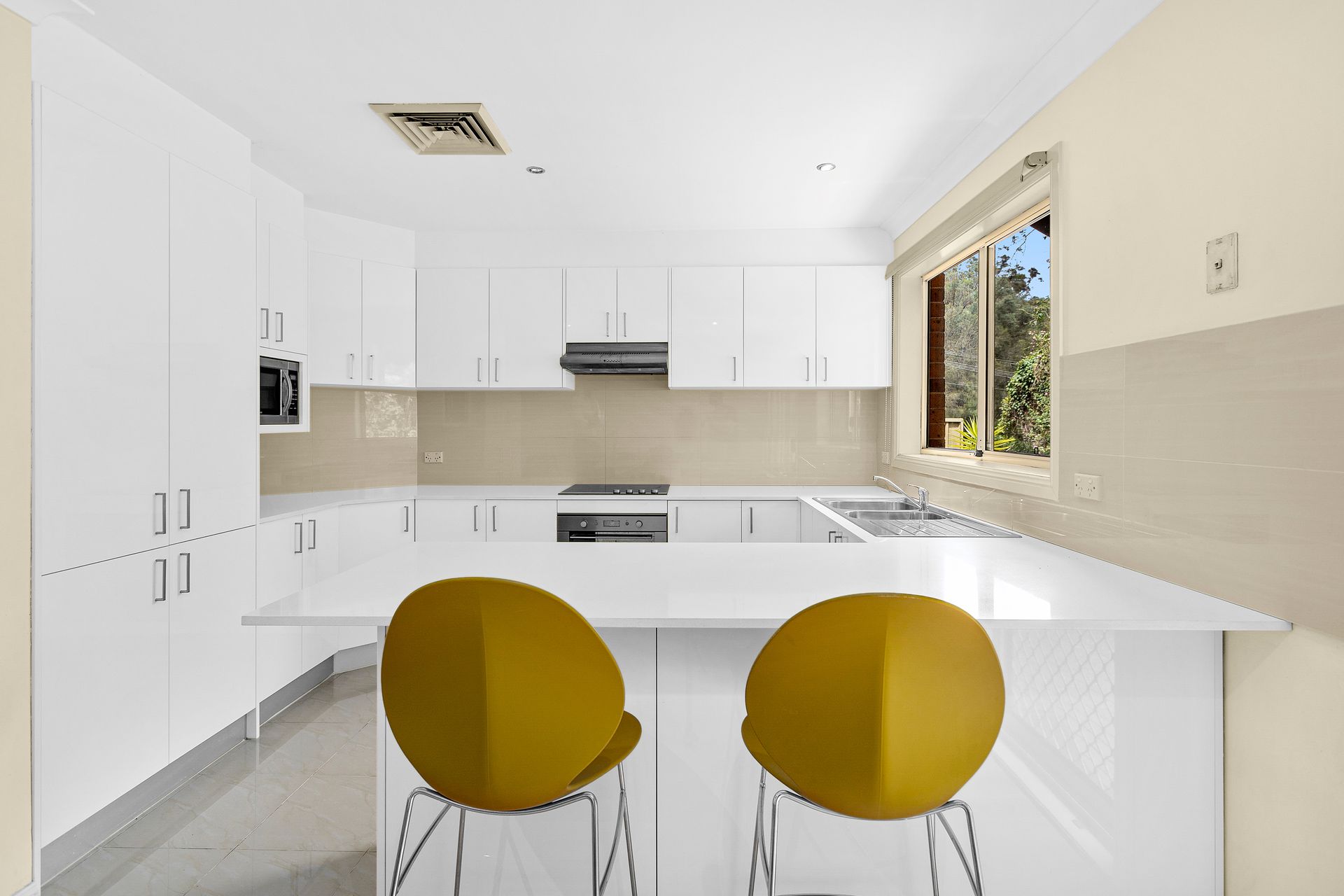 Presented in impeccable condition, the kitchen features stainless steel appliances, dishwasher and eat-in breakfast bar.