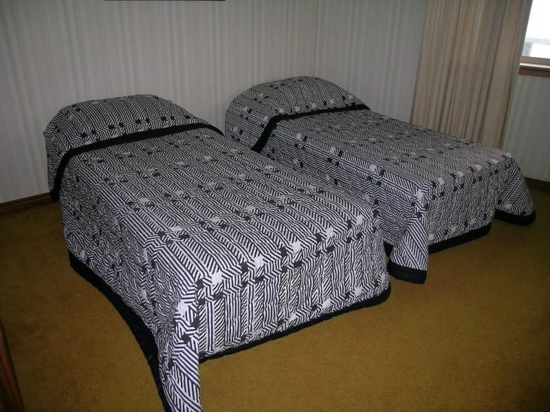 Queen bed in main bedroom and 2 X single beds in the second bedroom. Sleeps 4.