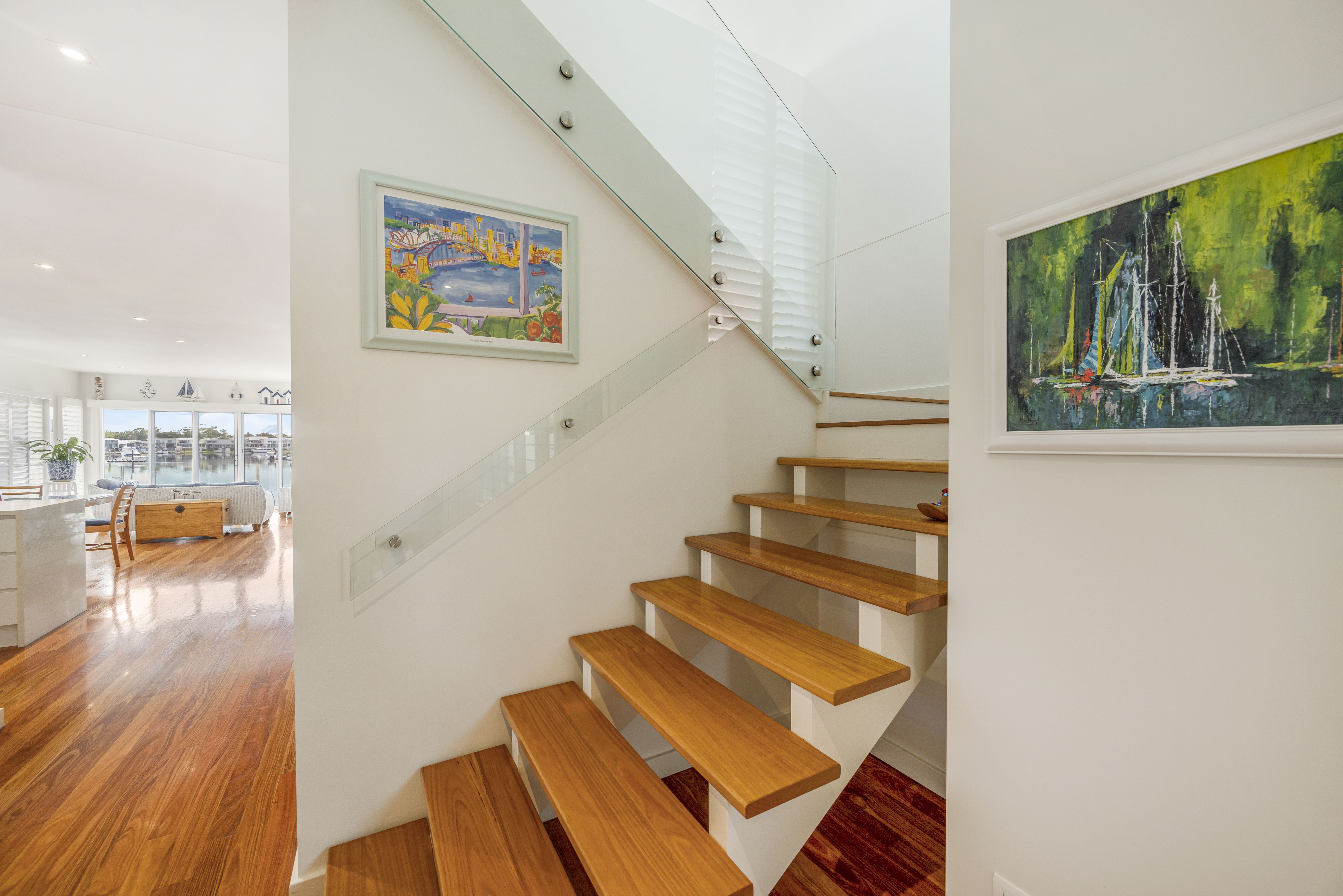 Upstairs, a light filled retreat awaits revealing a casual living area, a versatile space, ideal for a study or artists haven, two beautifully appointed guest bedrooms, sophisticated bathroom, and a restful master bedroom with a roomy ensuite and walk-in robe, offering elevated water views.
