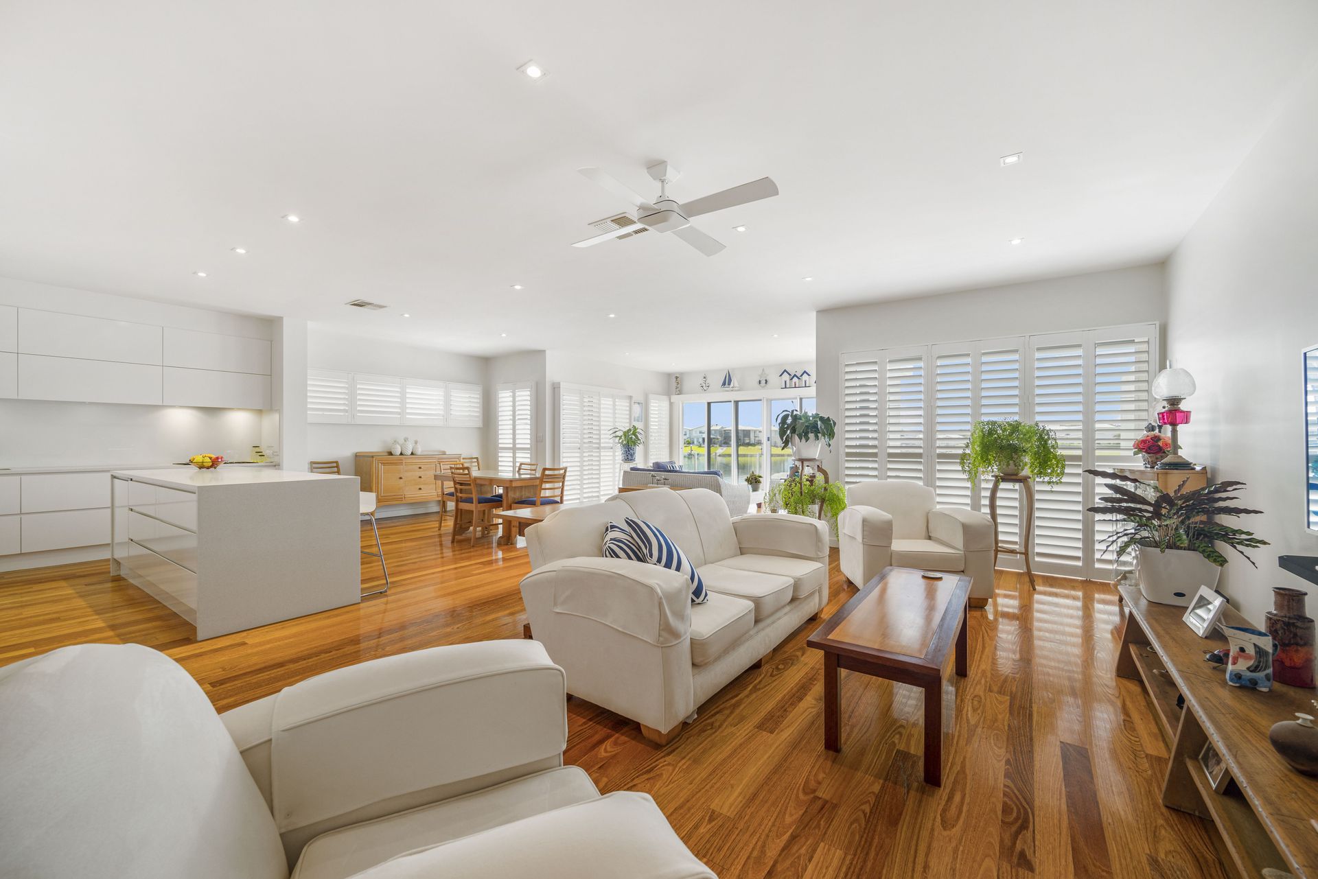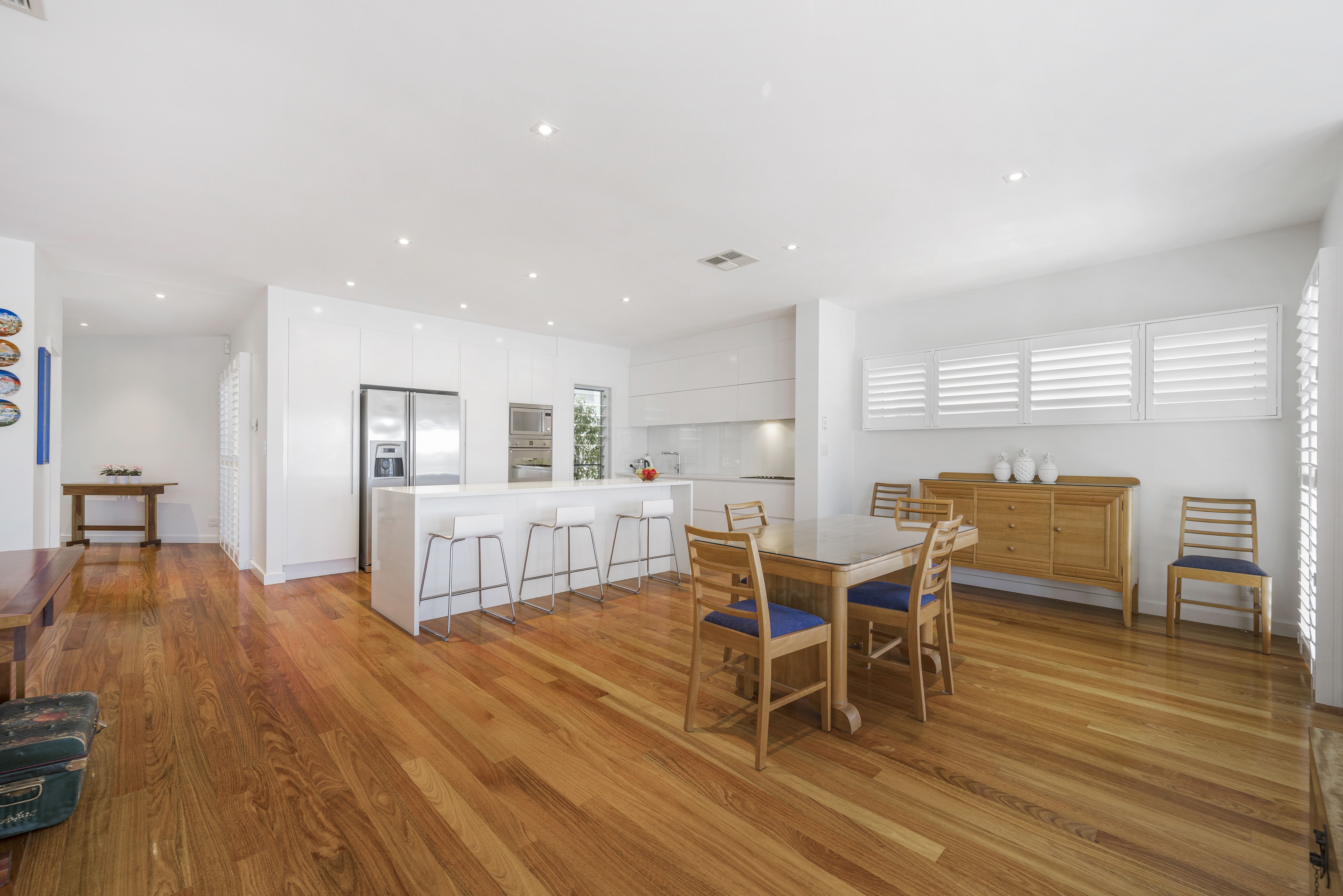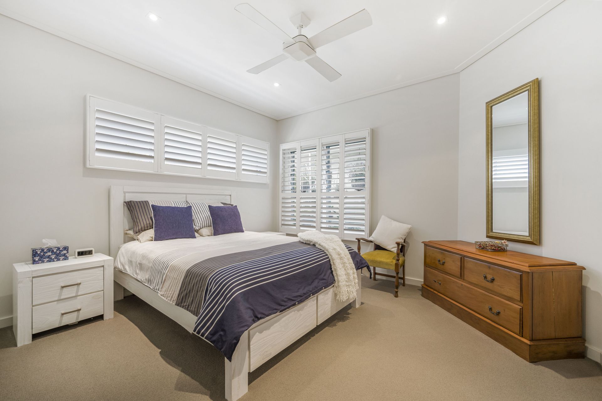 A multitude of windows furnished in plantation shutters invite natural light while maintaining privacy. A myriad of louvres ensure a cross flow breeze. New England Oak combo floors track throughout whilst the stairway is Blackbutt, complementing the soft neutral colour palette. Additional features include ducted vacuuming, ducted-zoned air conditioning, ceiling fans, a waterfall edge stone island, soft close cabinetry, abundant storage, Smeg appliances, and built-in security system for peace of mind.