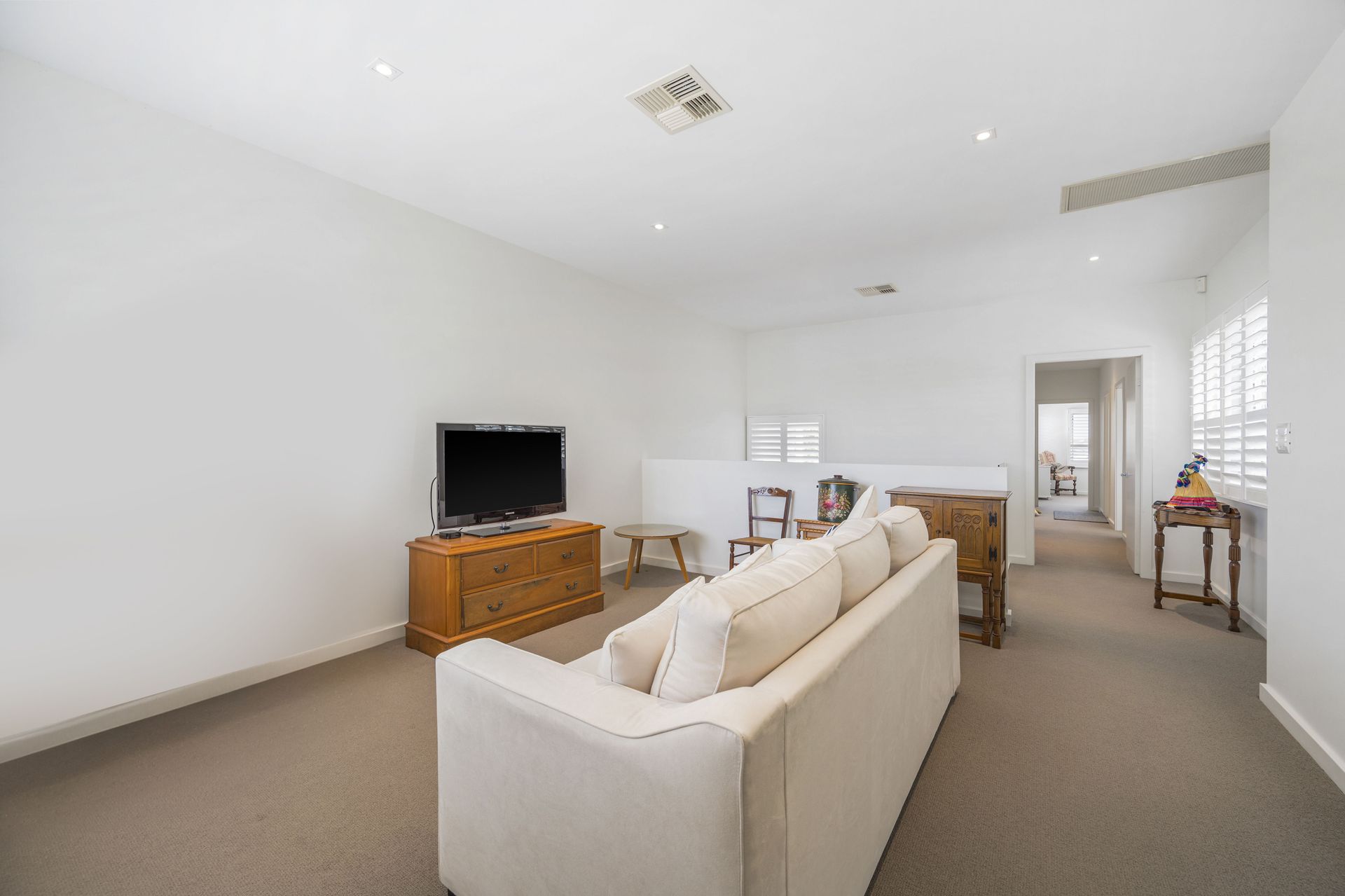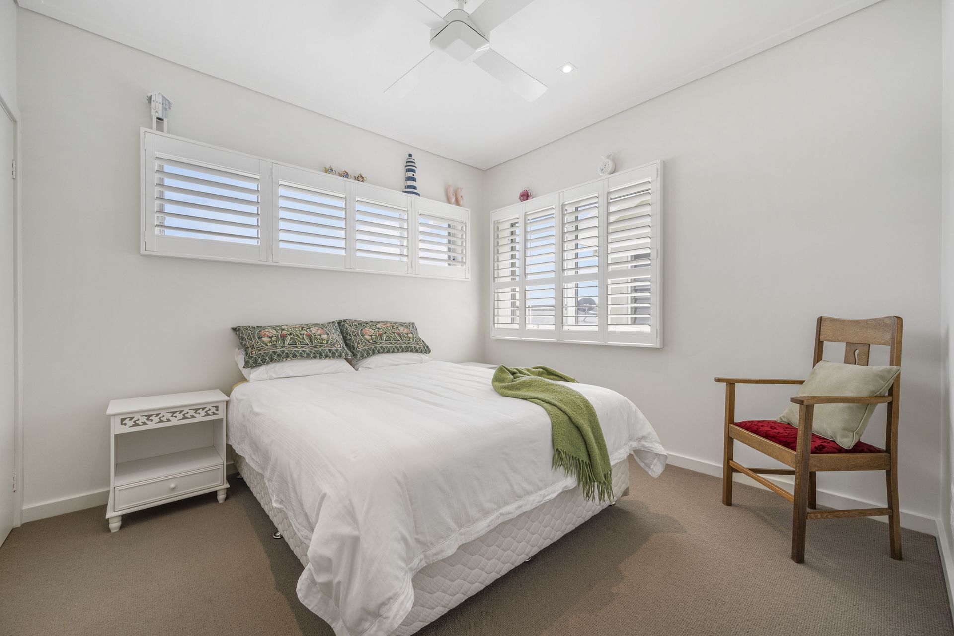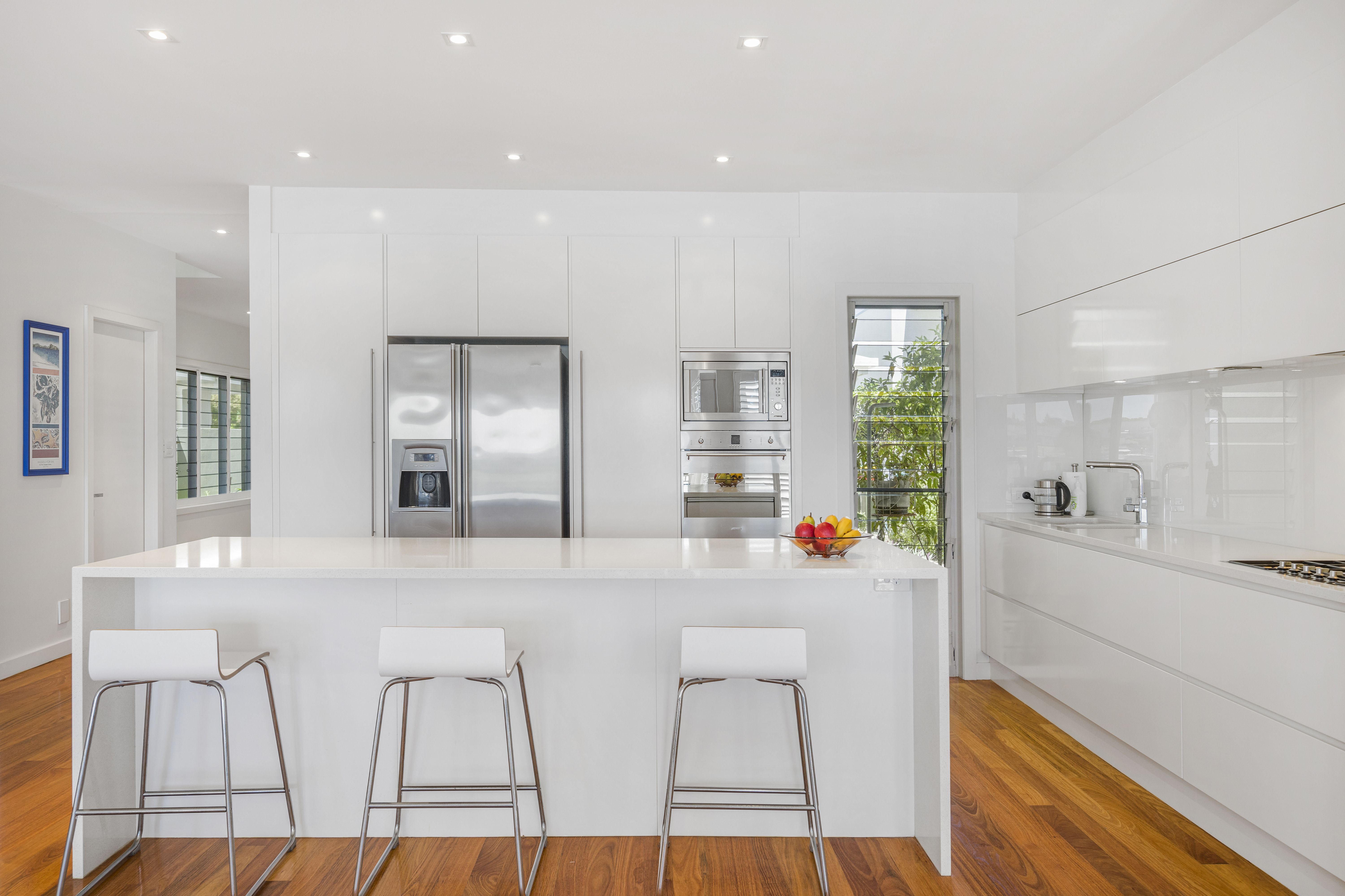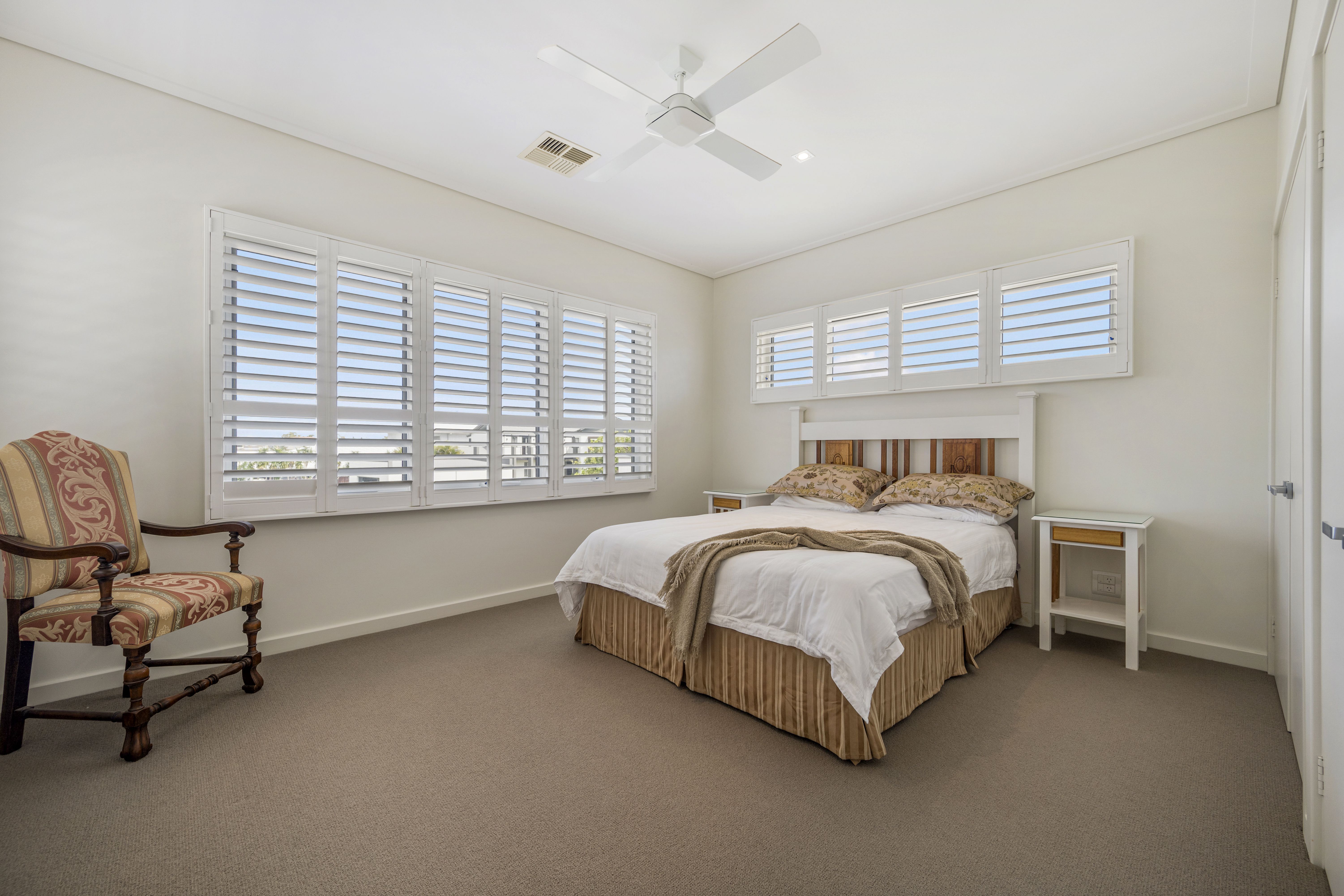 A multitude of windows furnished in plantation shutters invite natural light while maintaining privacy. A myriad of louvres ensure a cross flow breeze. New England Oak combo floors track throughout whilst the stairway is Blackbutt, complementing the soft neutral colour palette. Additional features include ducted vacuuming, ducted-zoned air conditioning, ceiling fans, a waterfall edge stone island, soft close cabinetry, abundant storage, Smeg appliances, and built-in security system for peace of mind.