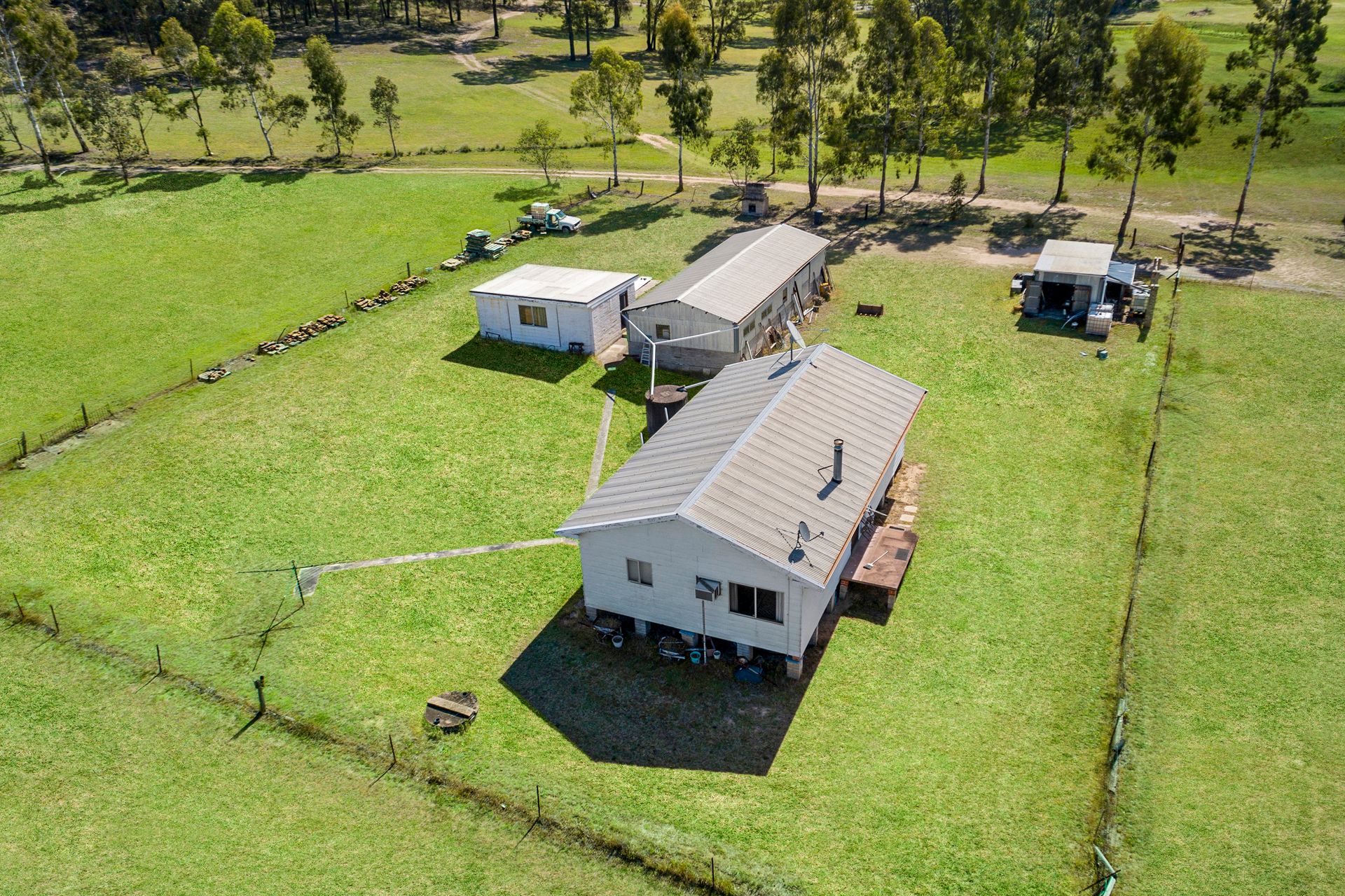 - 3 bedrooms; - Living & dining rooms; - Air conditioning; - Front verandah; - Foxtel connection available; - Bathroom with separate toilet; - 3 agricultural sheds with 3 phase power, - Shed 1 : 18 m x 6 m; - Shed 2: 6 m x 3 m; - Shed 3: 4 m x 8 m; - Charming stone outdoor fireplace; - Currently leased at $500 per week and on a fixed term until September 2025