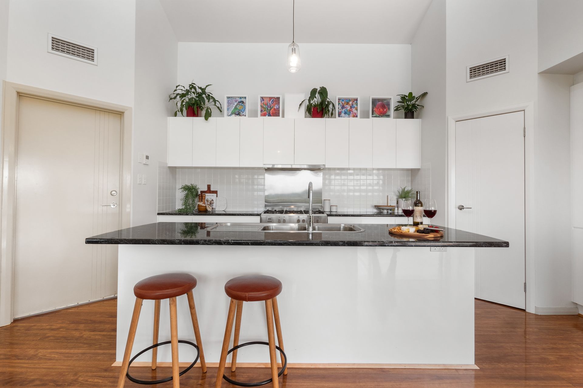 The modern kitchen is as functional as it is stylish, featuring a 900mm stainless steel oven, a gas stove and a range hood. It boasts a walk-in pantry with power outlets and plumbing for a fridge with a water/ice dispenser. Thoughtful touches like concealed appliance spaces, an abundance of power points and generous pot drawers add to its practicality. North-easterly facing clerestory windows, equipped with electrical controls for ventilation, bring abundant natural light into the space and enhance airflow.