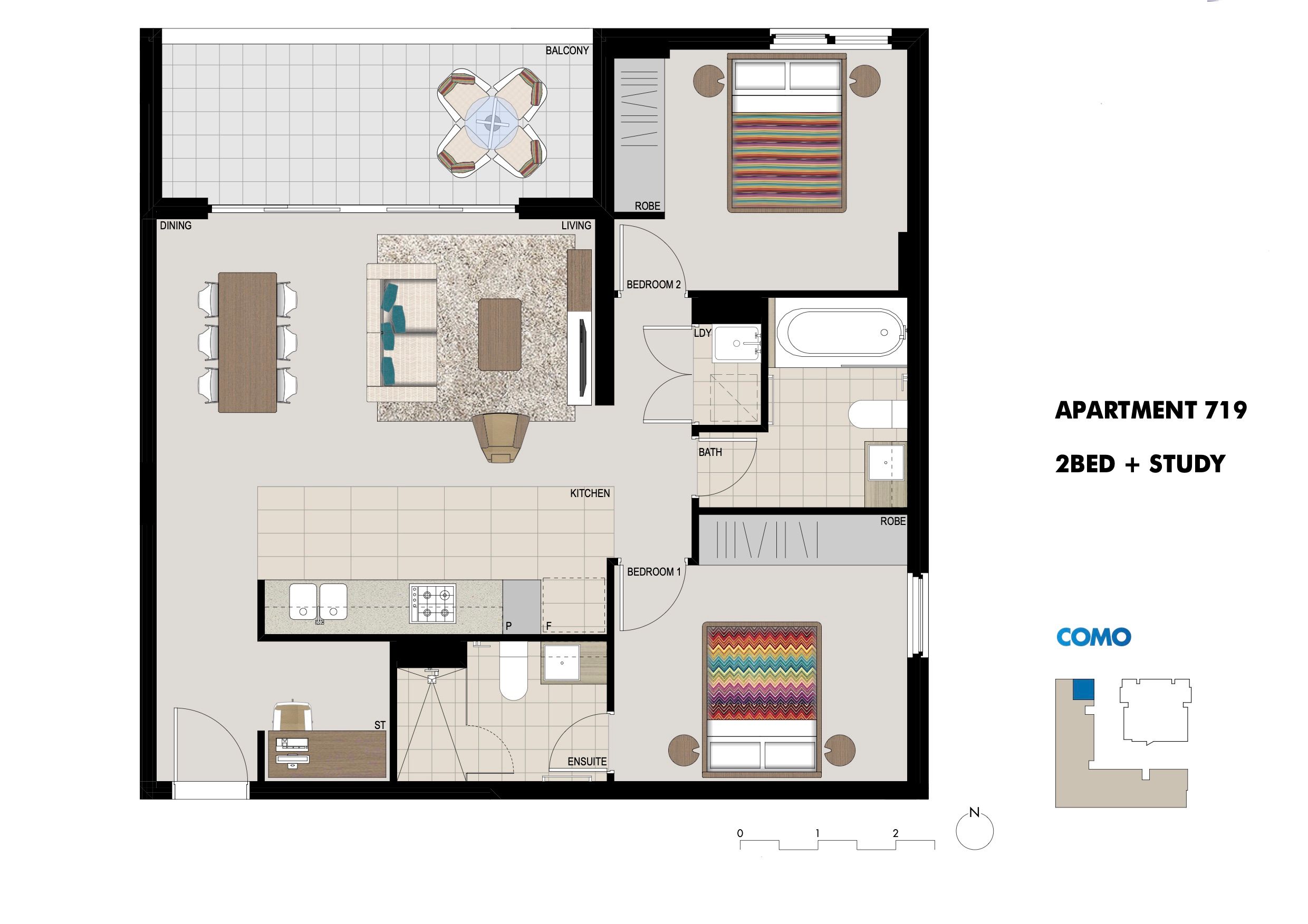 One of the best homey & functionally floor plan for the building 2 bedrooms both with mirrord built-in wardrobes plus study Total 105sqm (89sqm unit size + 14sqm car space + store cage) North facing on Level 7 (top floor) with area view and privacy