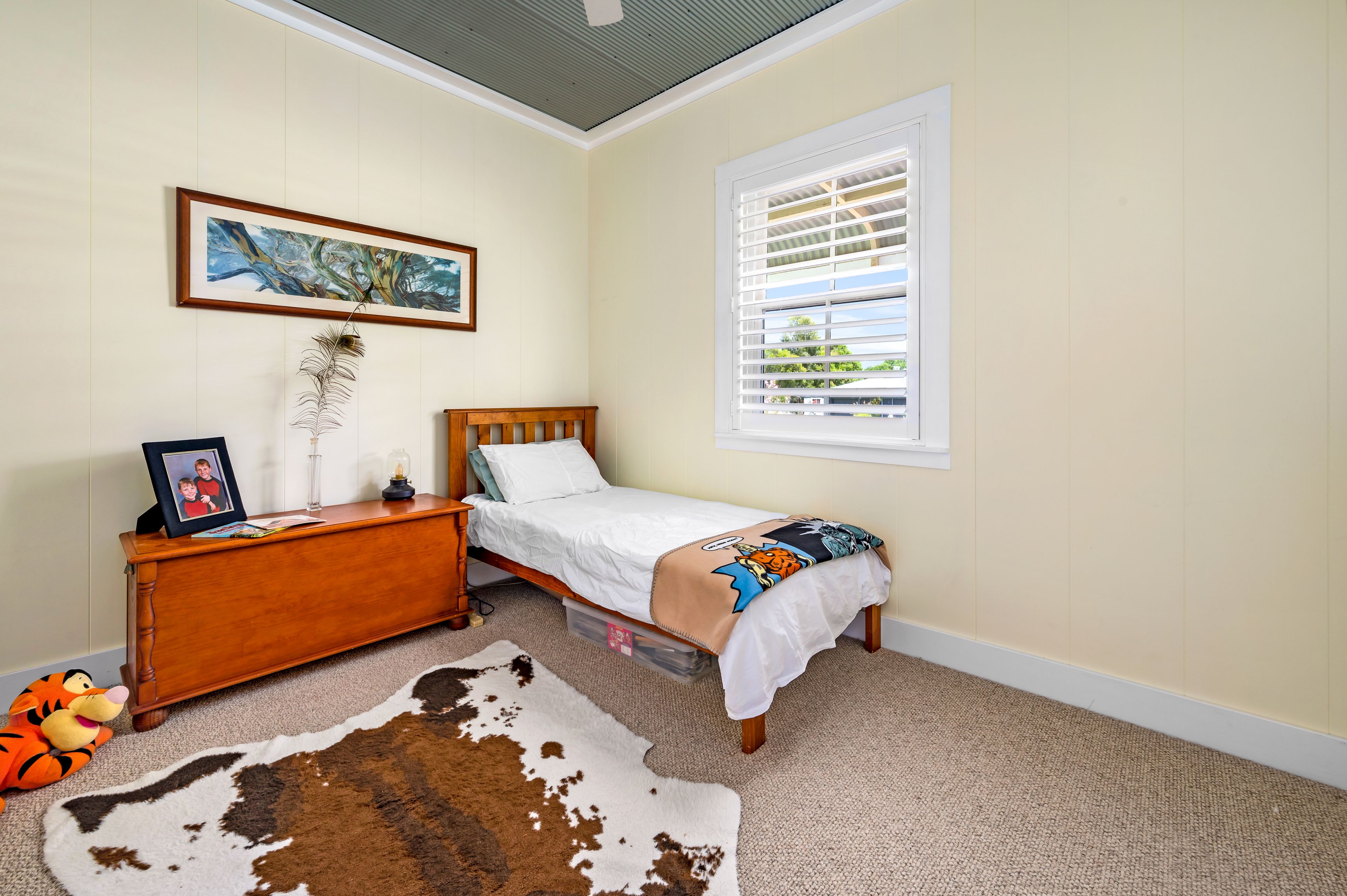 This stunning property has been lovingly renovated throughout, keeping the charm and the history, while breathing new life and character all of its own. From the moment you arrive, you are greeted by manicured gardens and wrap around verandahs. As you enter through the front door you will find high ceilings and original hardwood floorboards. There are three bedrooms, two with built in robes, all with carpet and ceiling fans.
