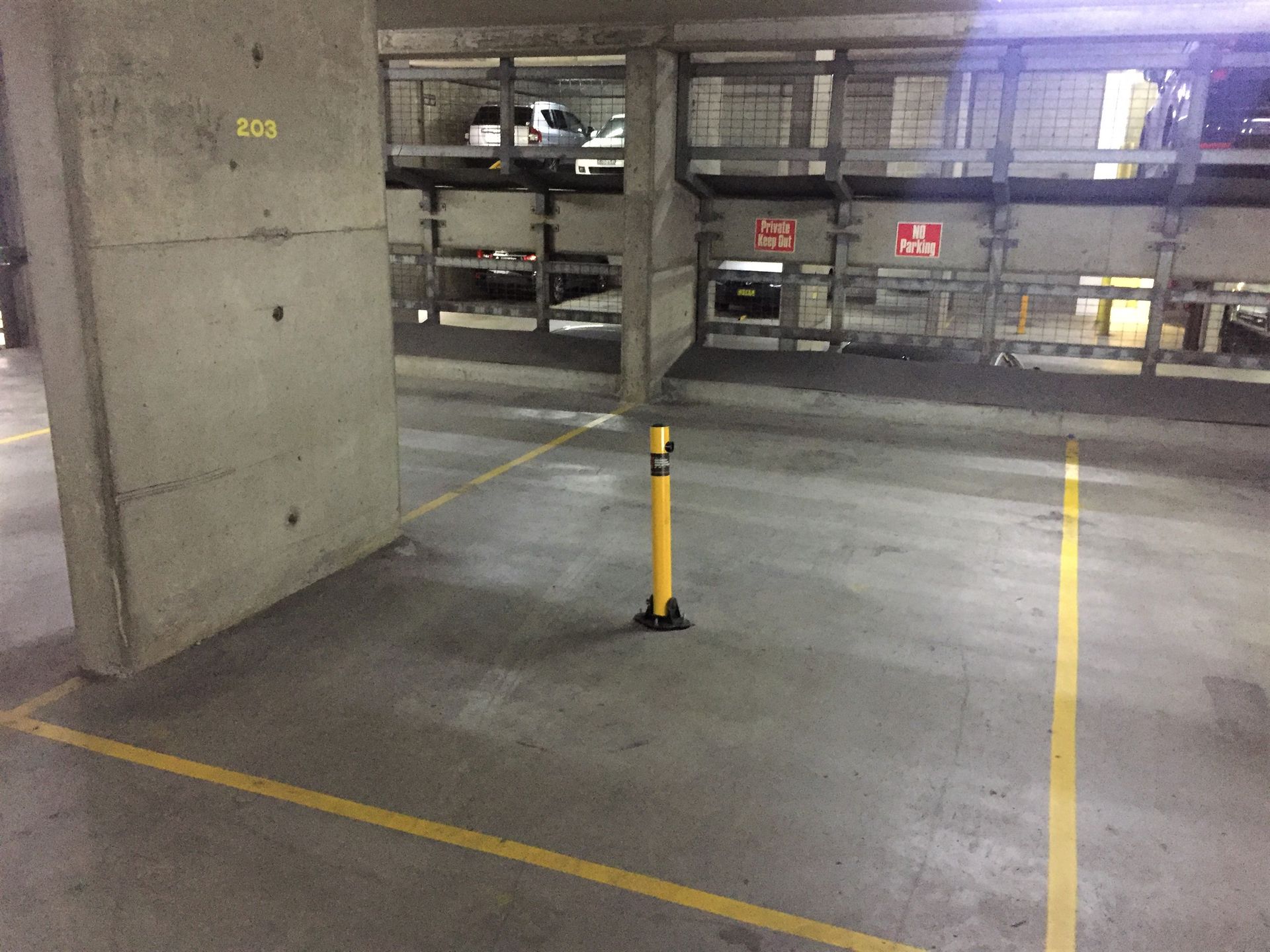 The car park is located within this gated multi-storey car park in the city. The strata plan states that the car space measures 14 square metres.