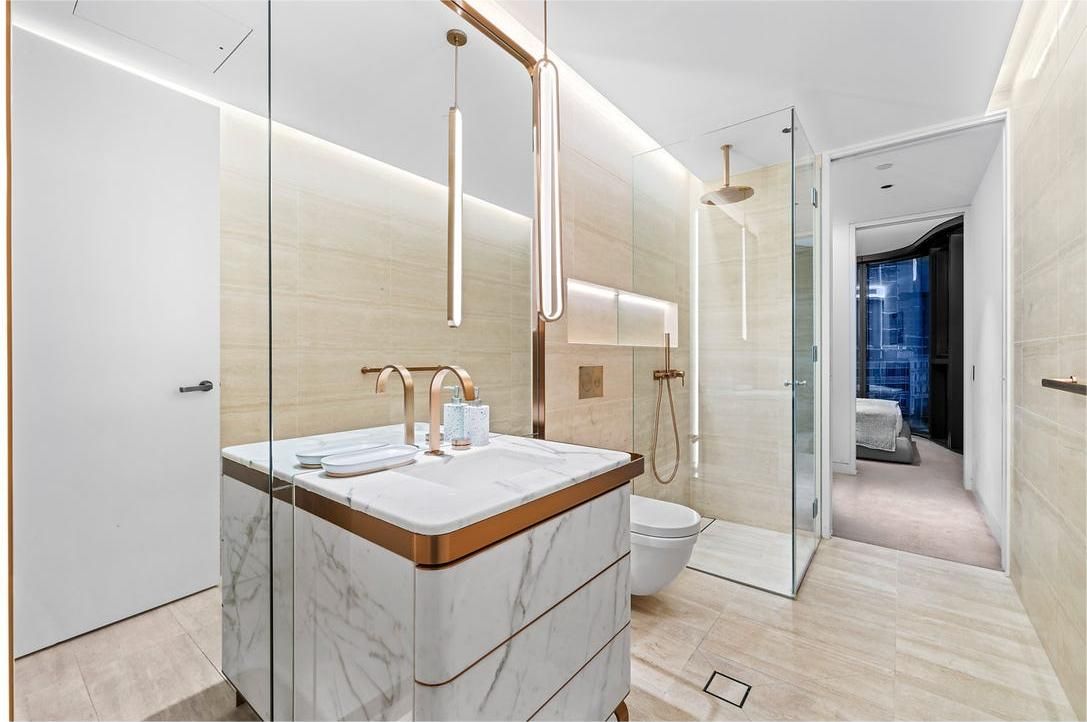 The apartment features a sleek design with high-quality finishes and fixtures throughout. The bedroom is generously sized and comes with built-in wardrobes for ample storage space. The bathroom is modern and stylish, with a large shower and contemporary fittings.