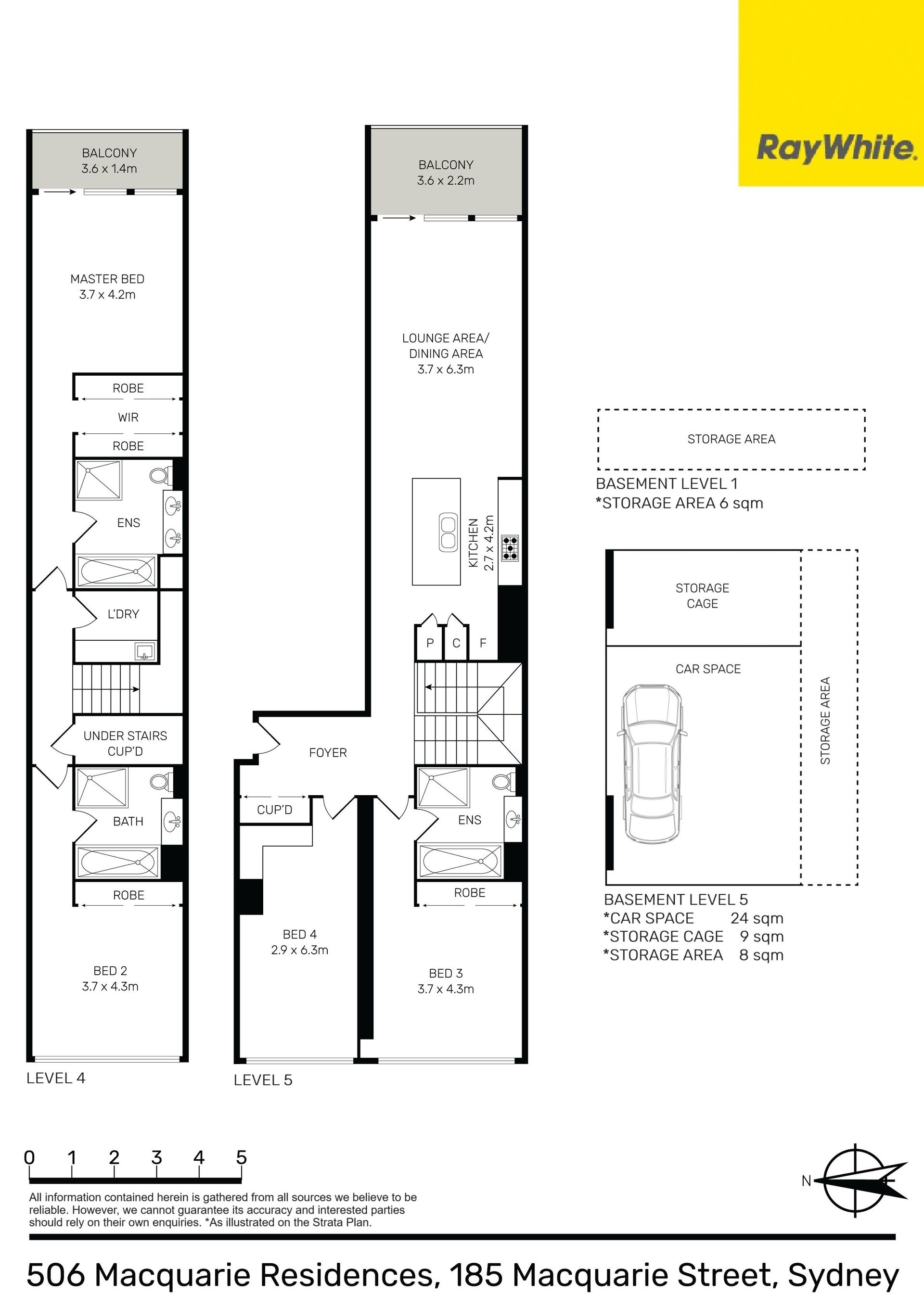 On basement level 5 there is an enormous 24 square metre parking space, with a rear 9 metre storage cage plus 8 square metre adjacent storage area. There's an additional 6 square metre storage area on basement level 1.
