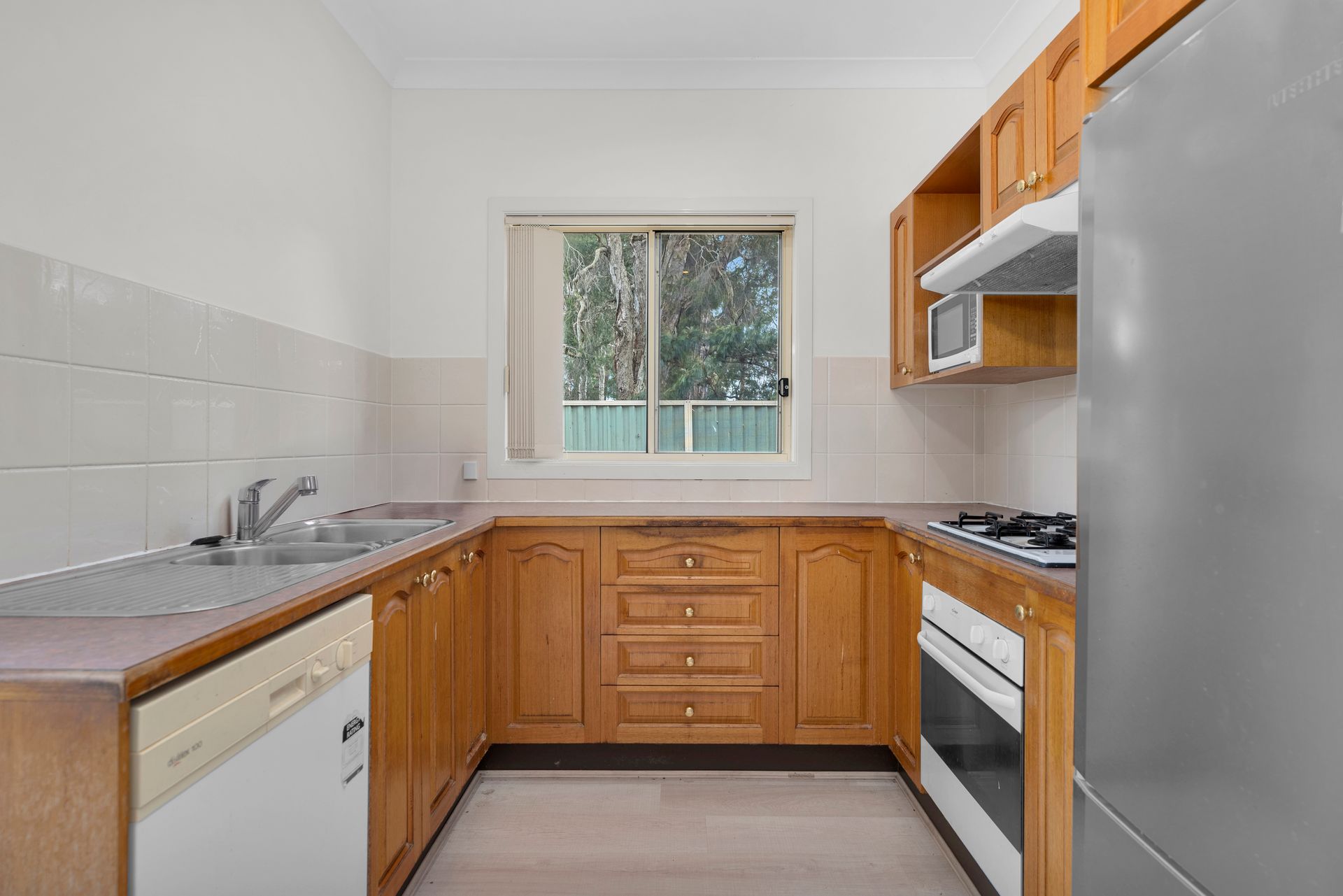 The modern kitchen features a natural gas cooktop and dishwasher. enjoy your own well-sized private courtyard, perfect for relaxing, plus a single garage for secure parking.
