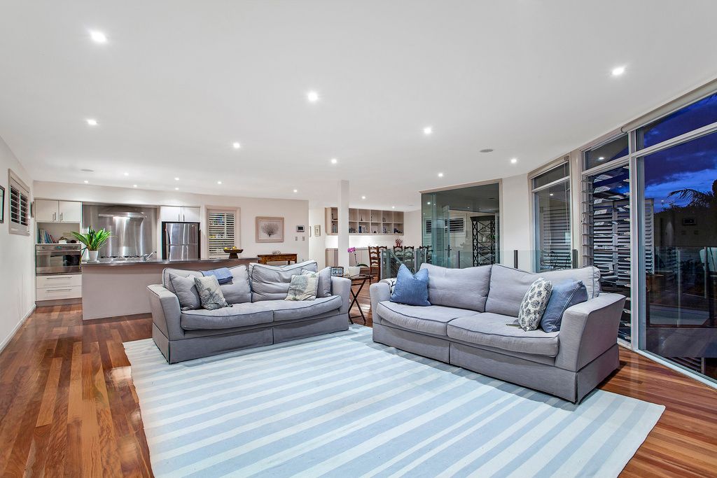 Sprawling light filled interiors flow over the two levels with multiple open plan living areas and a master bedroom that enjoy the panoramic ocean views from oversized feature windows. The rooms capitalise on natural light, providing an abundance of space, along with the surrounding private gardens provides a sophisticated coastal hideaway. Level street entry through a front courtyard, with bedrooms on both levels creating a versatile layout, to accommodate a couple, or family and guests in exceptional comfort, while the fluid open plan allows effortless indoor/outdoor entertaining.