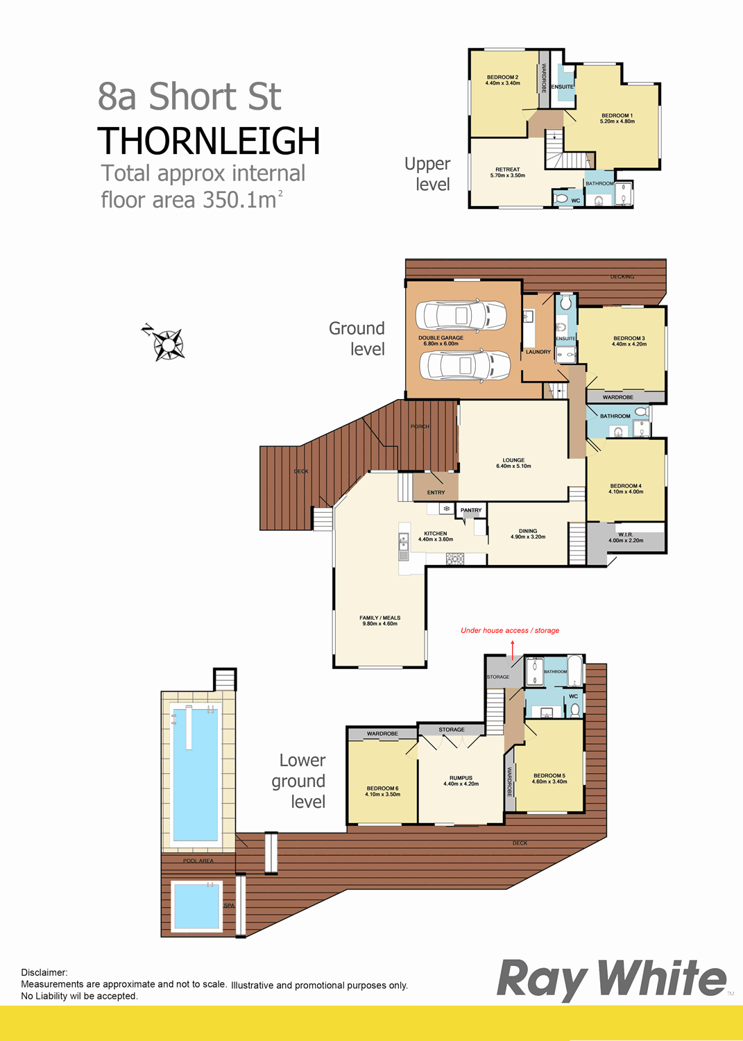 In a Nutshell - 6 bedrooms, 4 bathrooms, 2 car garage with internal access - Master with ensuite and private terrace area. All bedrooms double in size, 2nd with walk in robes - Private driveway access, secluded position, approx. 850sqm of tranquil living - Modern open plan kitchen with free standing 5 burner 900mm gas cooker with plate warmer, stone benches and glass splash back - Merbau polished floor boards in your casual lounge/dining overlooking your pool and BBQ courtyard area - Lower level lounge with access to deck and across to your 7 seat heated spa and pool area - Solar heated swimming pool with glass panelling and water feature - Ducted vacuuming, down lights through out, 2 x ducted air conditioning units - 2 x (approx.) 15,000L rainwater tanks and an abundance of under house storage