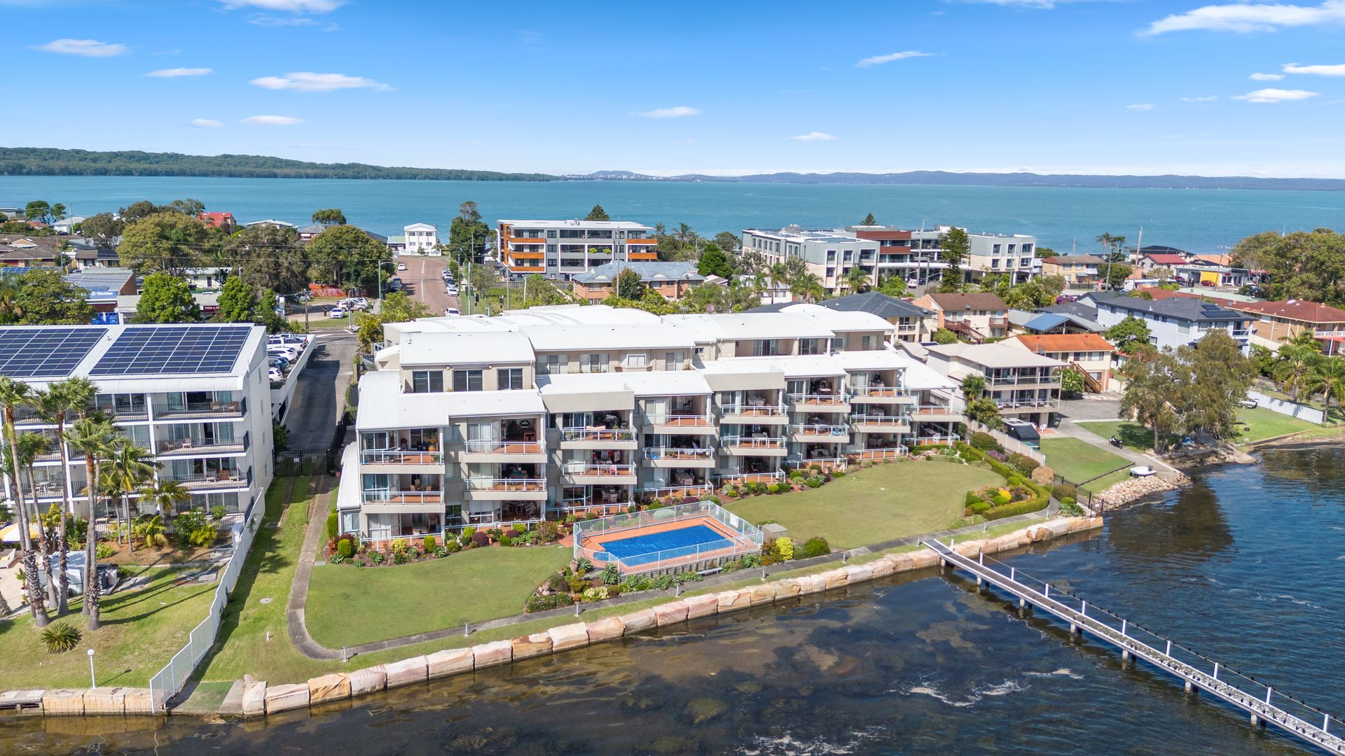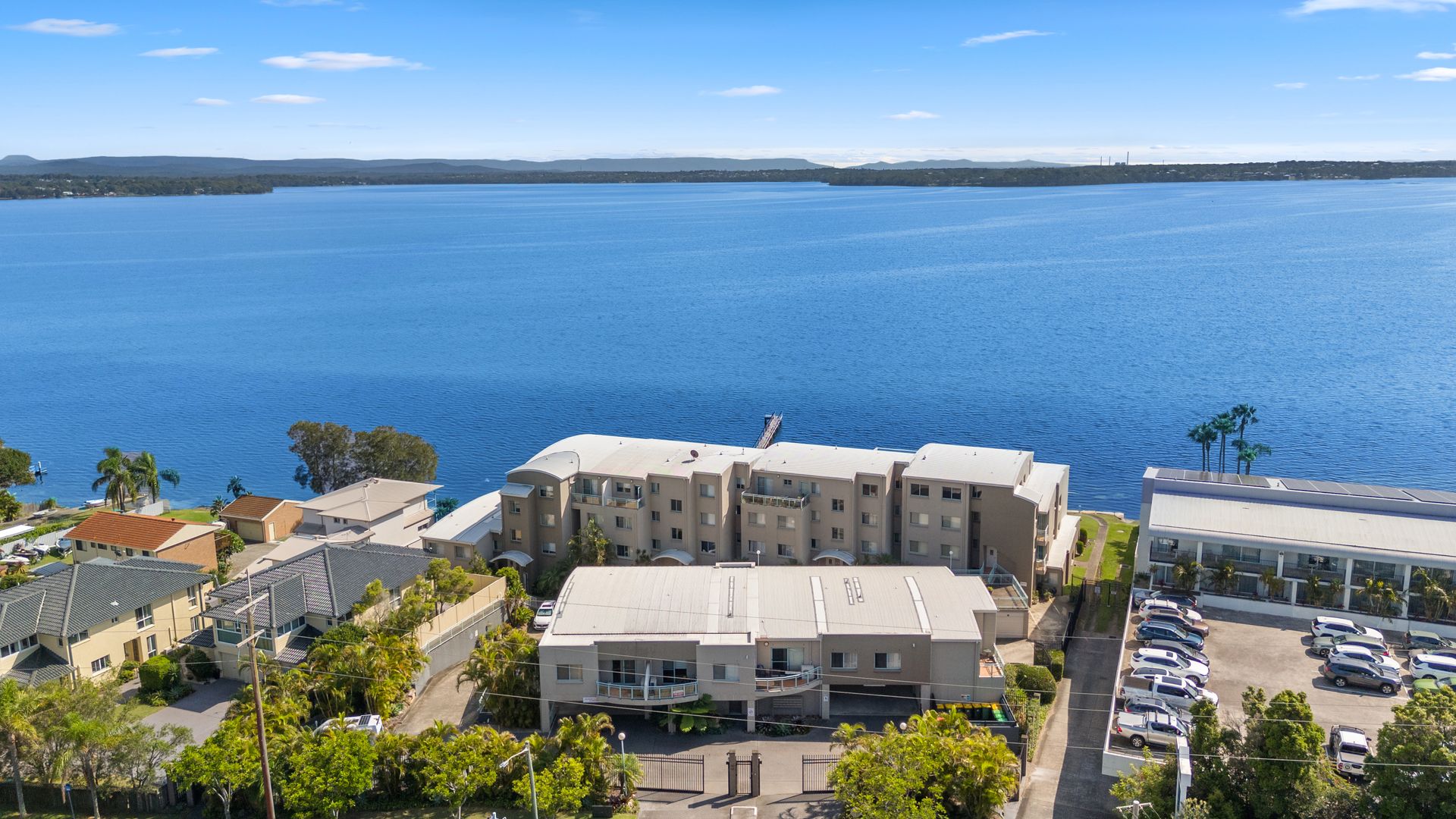 Highlights include stone bench tops in the kitchen, ensuite to the main suite, remote garage plus an extra undercover car space on title. The complex is secure and beautifully maintained, featuring manicured gardens, a sparkling lakeside pool, seawall, and private jetty.
