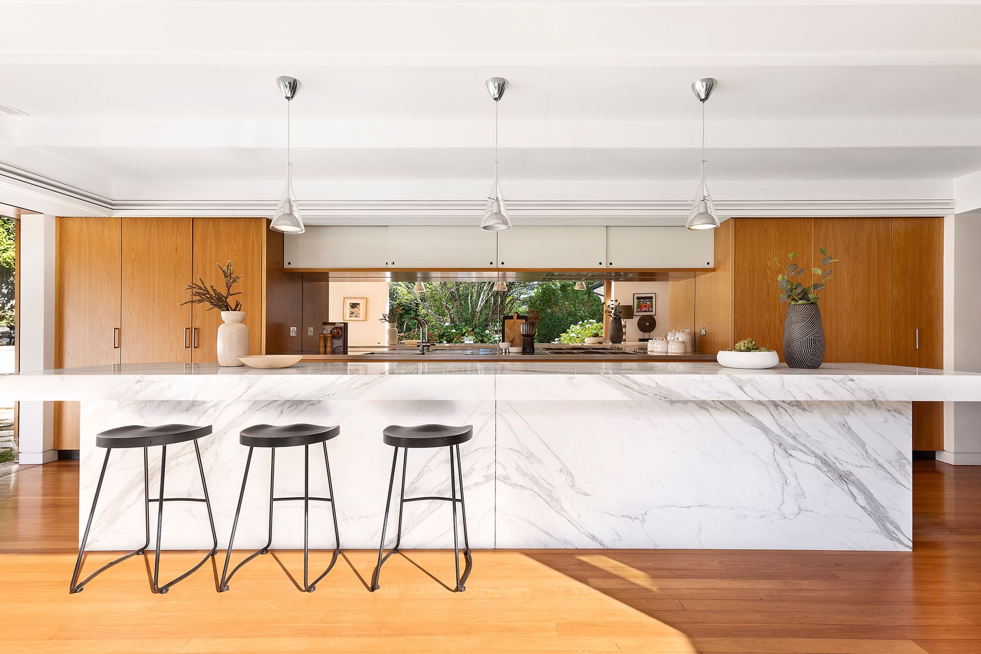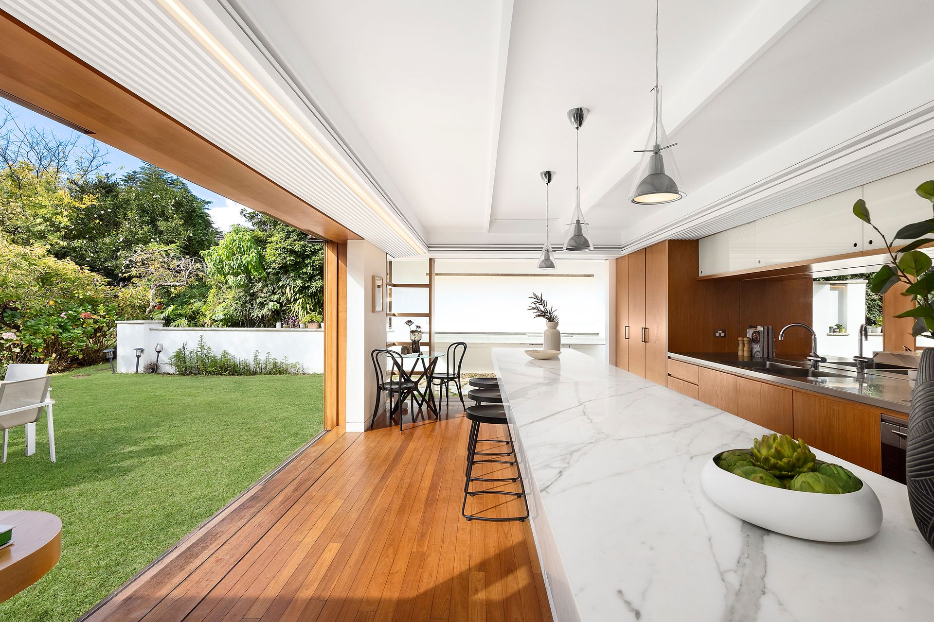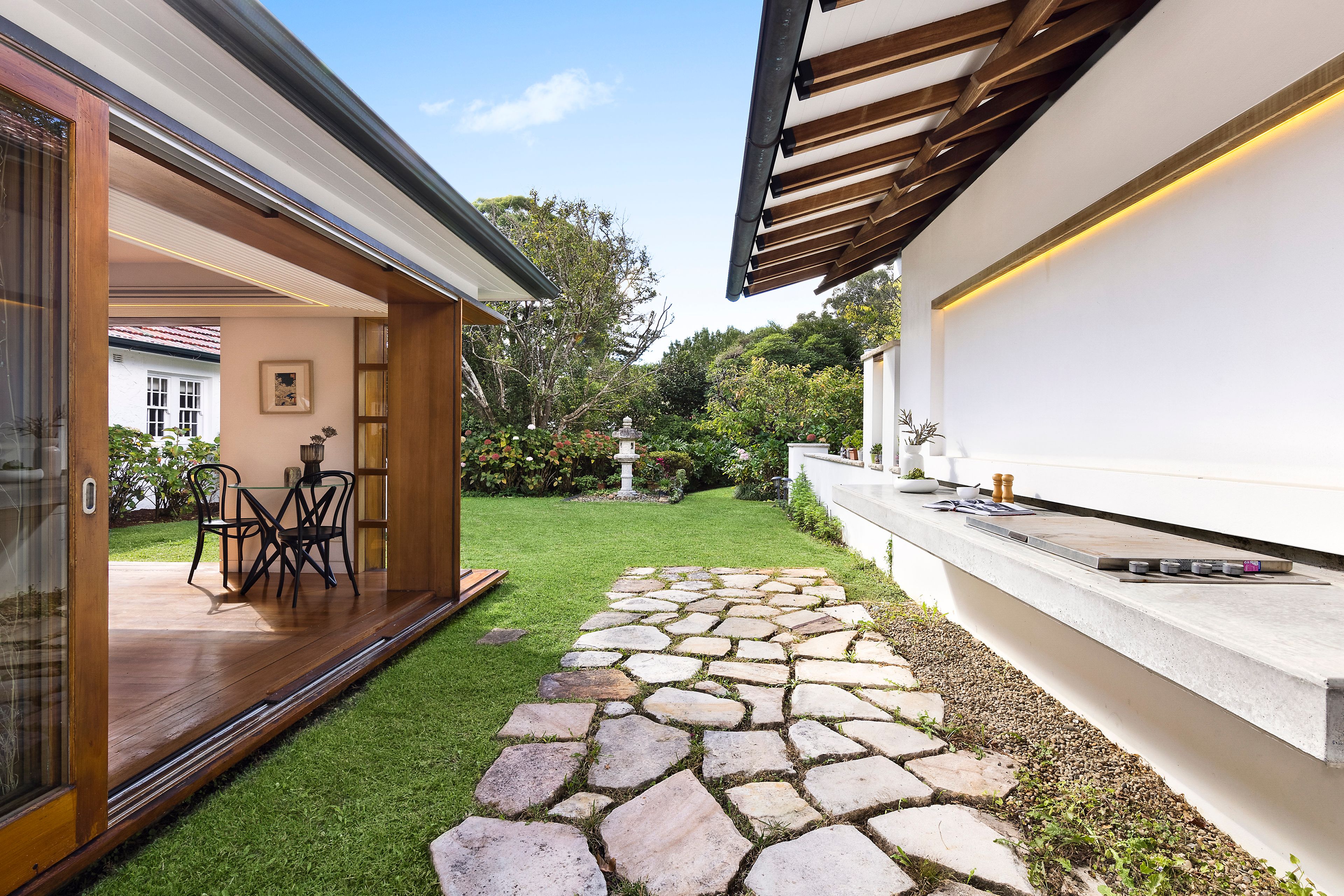 East meets west here effortlessly. Elegant living zones are adjoined by a sunroom and the dining flows through to a stunning Calcutta marble kitchen with a Japanese aesthetic, demonstrated in its extensive timber cabinetry and galleries of glass where stackable sliders open directly to the north facing garden.