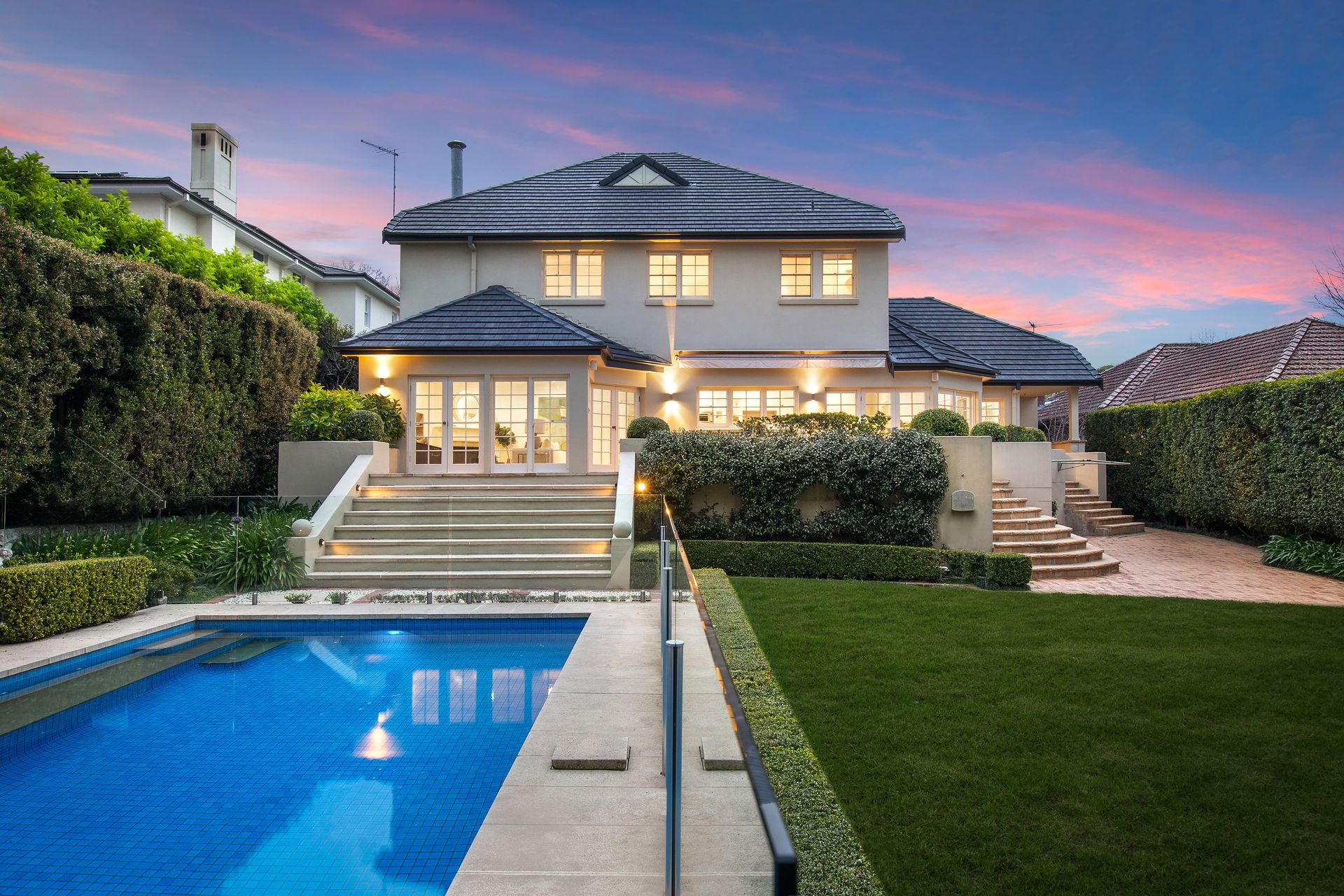 * Solid double brick construction both upstairs and down * Alfresco entertaining terrace, fully tiled swimming pool * Lush level lawns, complete privacy, gated and secure * Sunny east-to rear aspect with backyard bathed in northerly sunlight * East to rear 1136sqm block