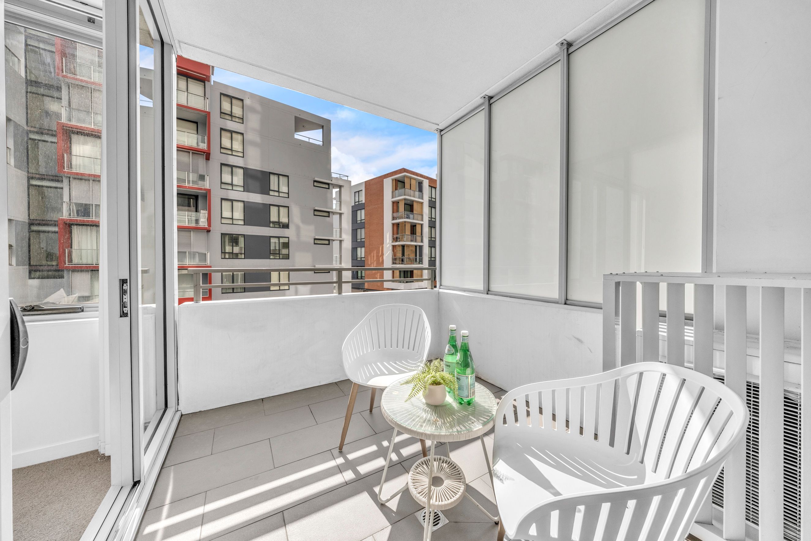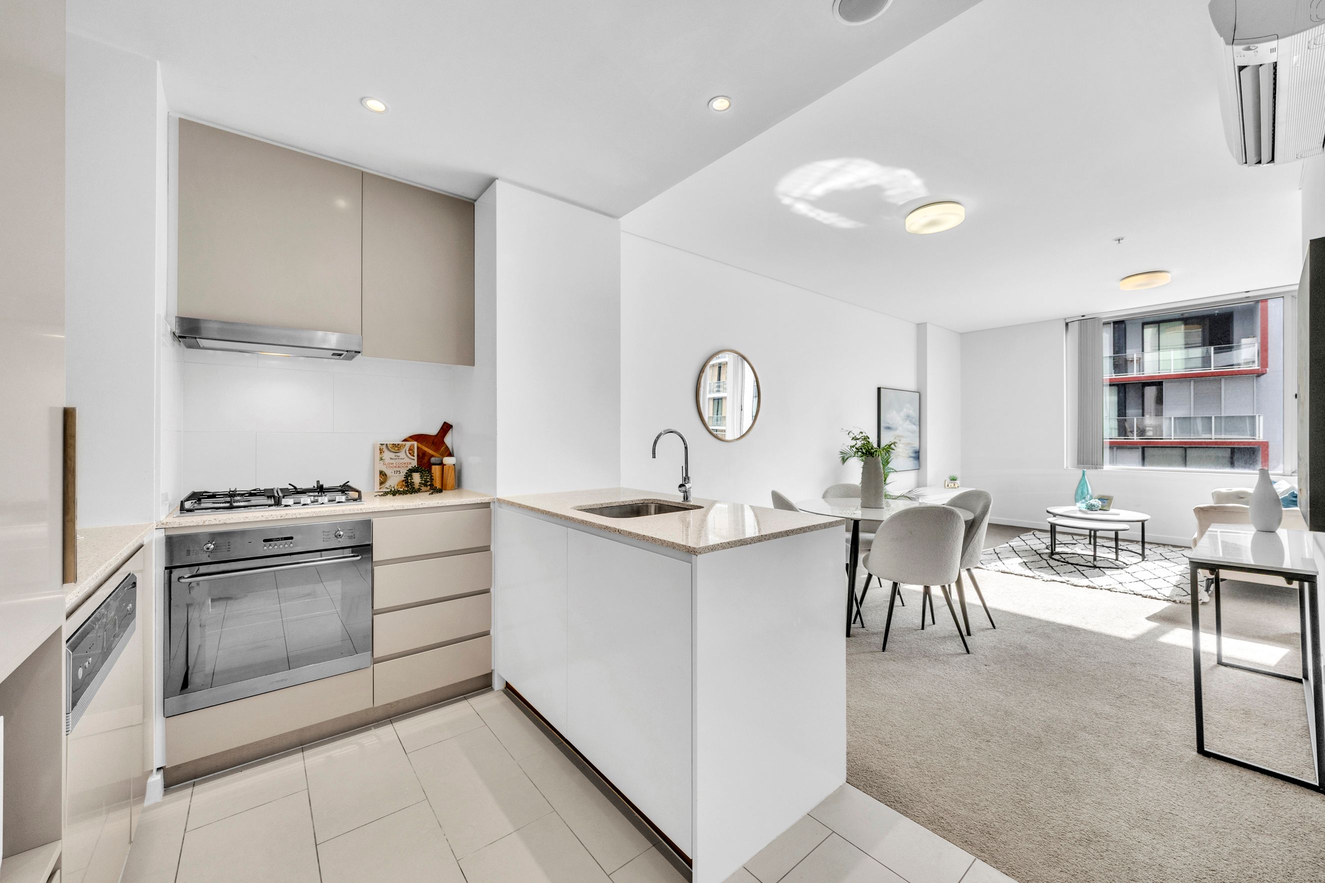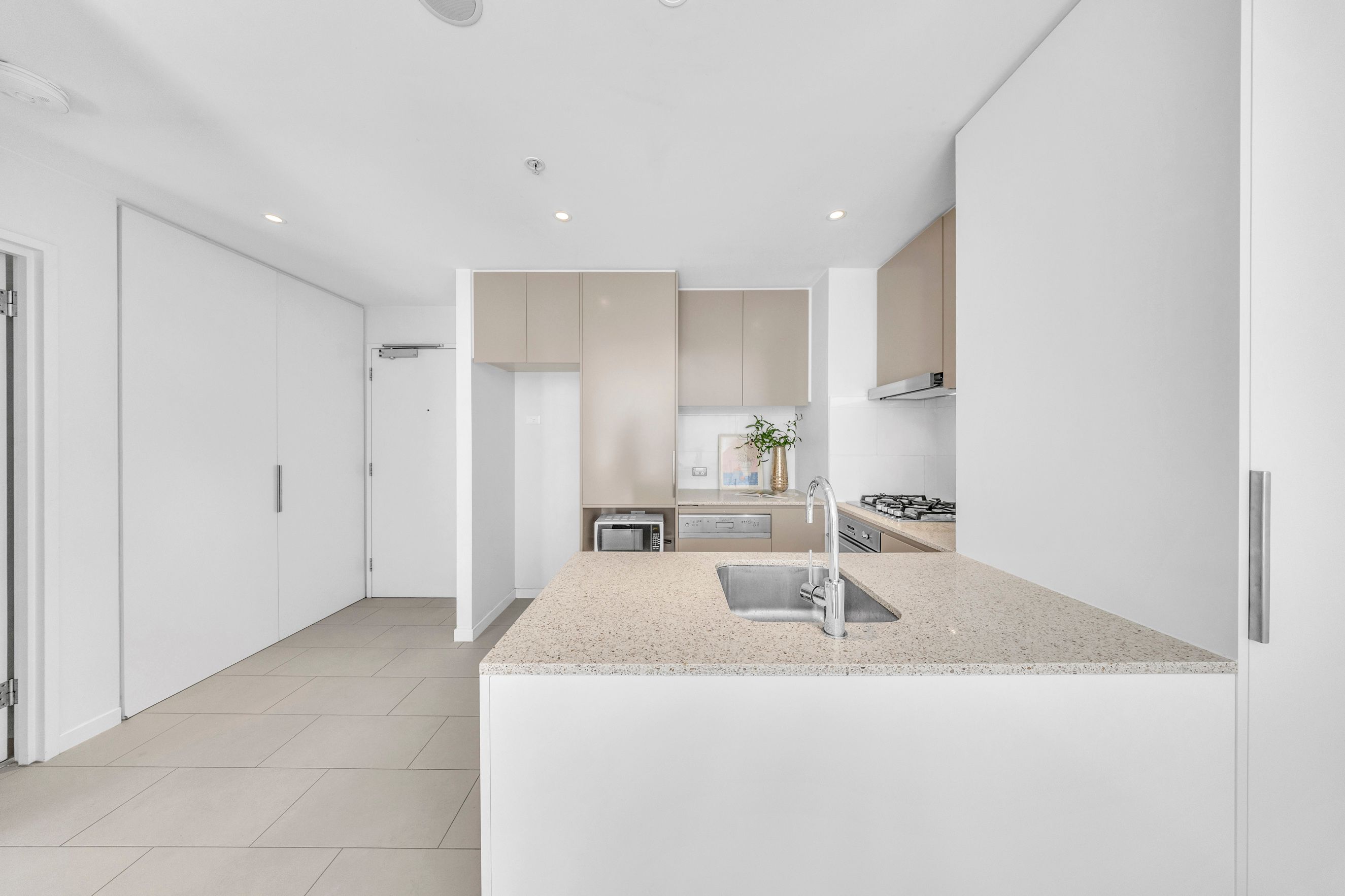 Featuring a light-filled open-plan living and dining area, the apartment showcases a sleek modern kitchen with stainless steel appliances and gas cooktop. The generous bedroom includes a built-in wardrobe and flows seamlessly to a covered private balcony, perfectly positioned to overlook the vibrant heart of Discovery Point.