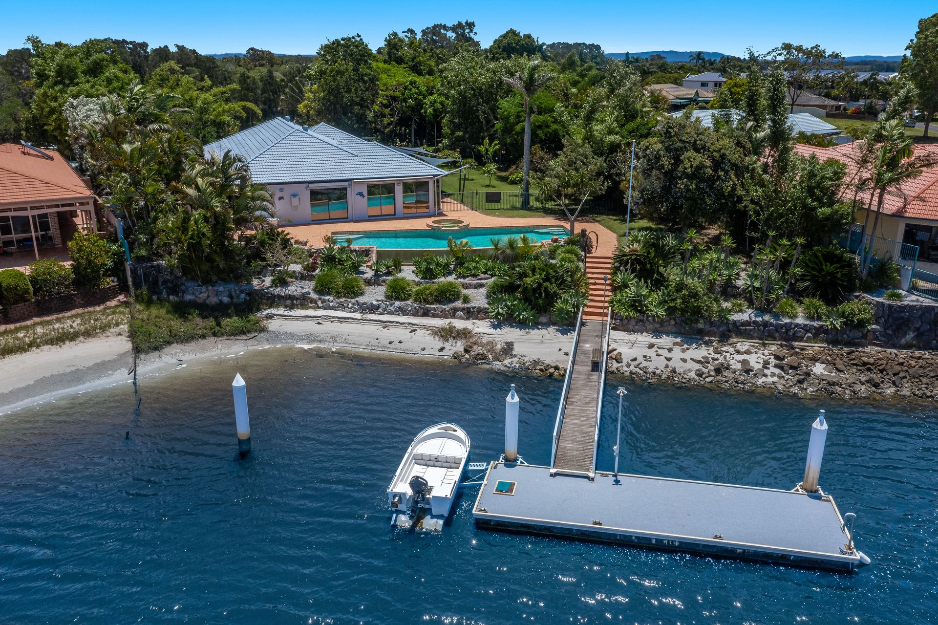 On the waterfront, there is a large pontoon enjoying deep water, making this the perfect location to moor larger vessels. The wide bay makes manoeuvring larger craft a breeze here and with the ocean less than 5 minutes away by boat, you can be out cruising or chasing your daily catch in no time.