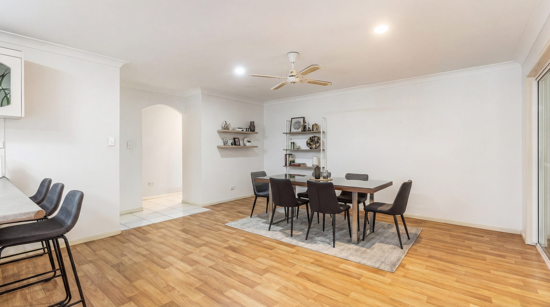 Stepping inside, the layout is functional and family-friendly. A generous lounge room sits toward the front of the home, flowing through to a central dining area that connects seamlessly with the kitchen. The kitchen itself is well-sized and positioned to overlook the main living zones, making everyday living easy and connected.