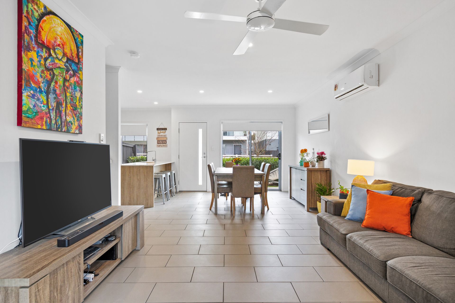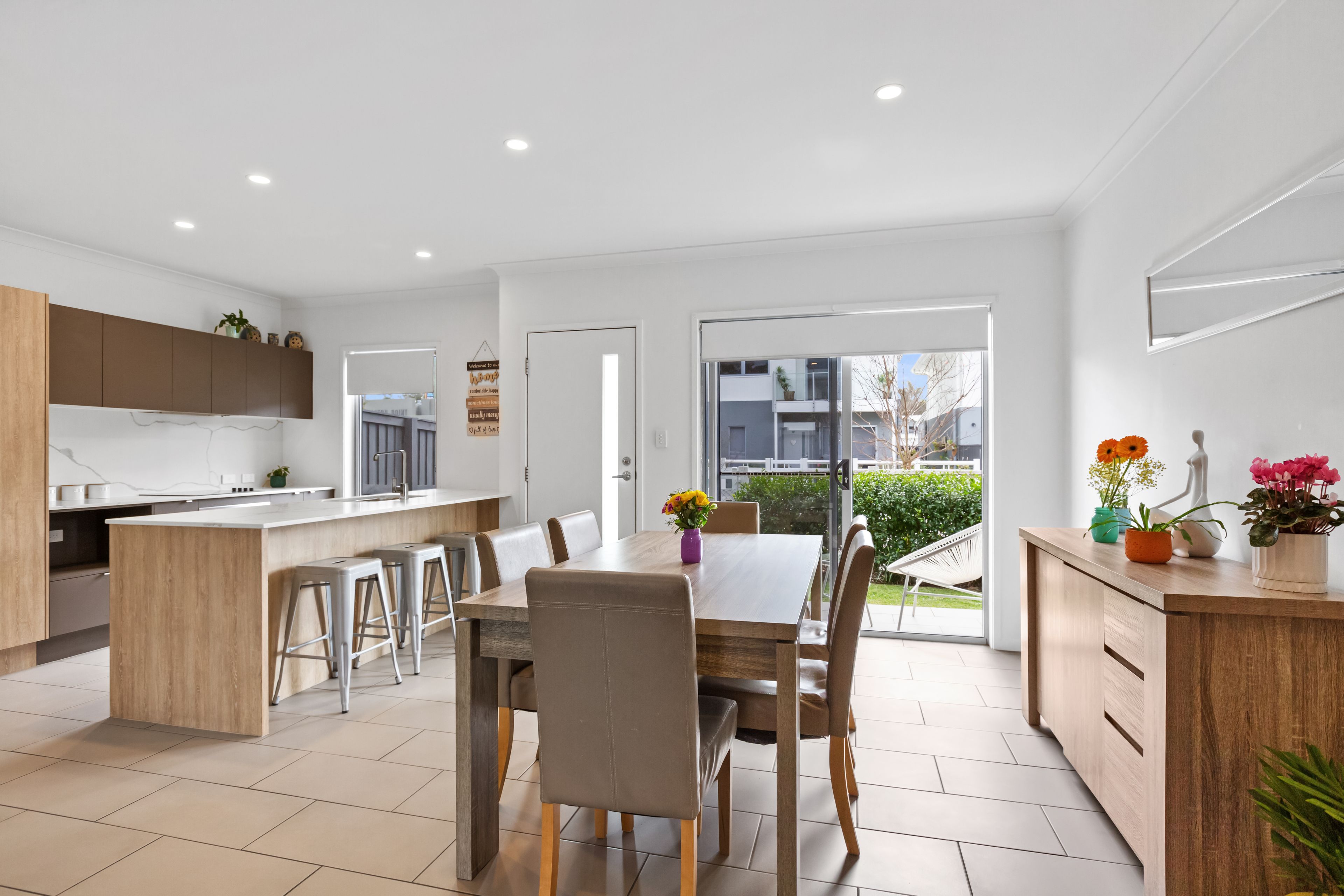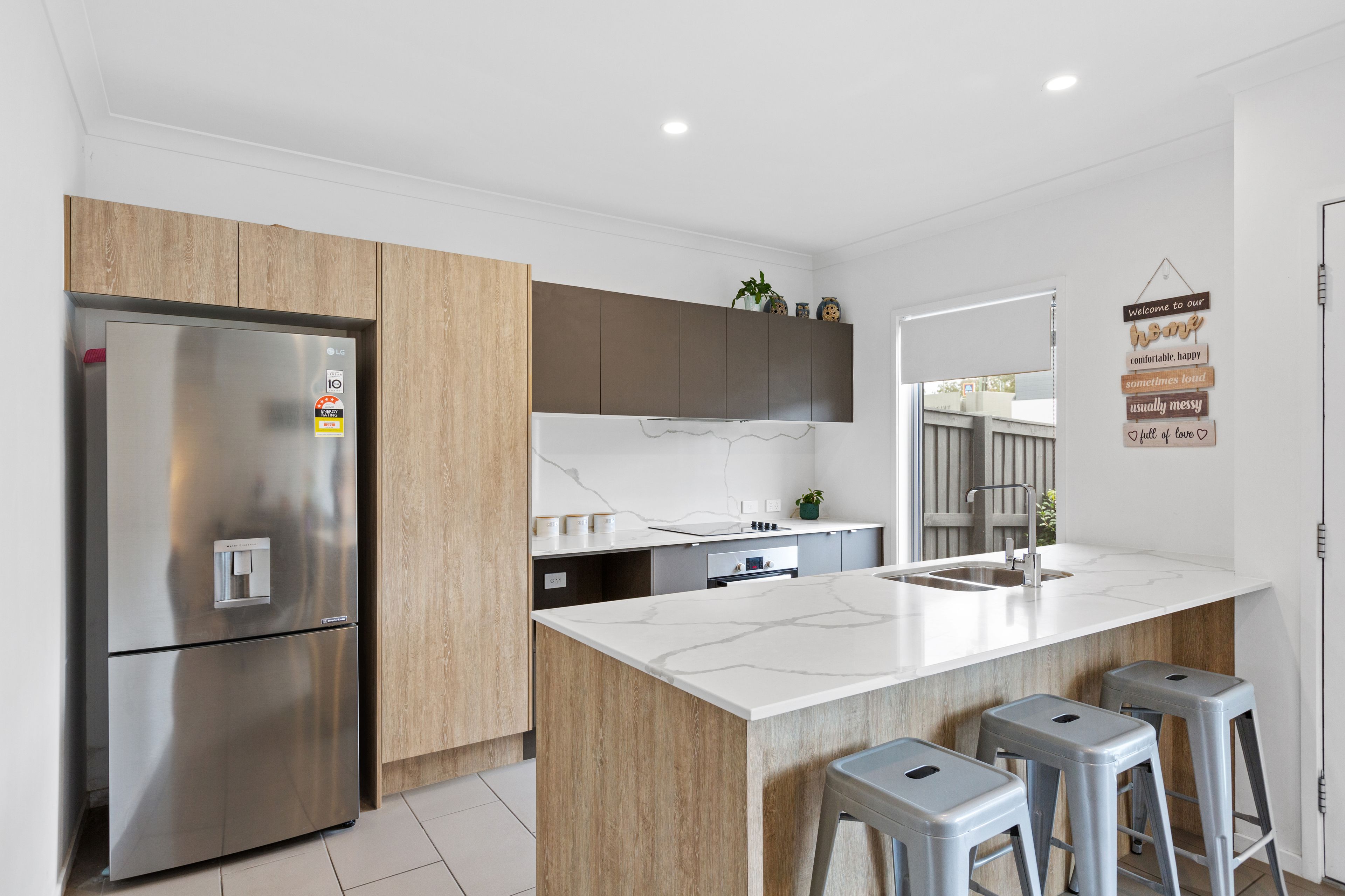 The front courtyard with cute white fence provides a very welcoming entrance, head inside and the layout is family friendly with a tiled open-plan lounge and dining area which overlooks the designer kitchen. Functional and chic, the kitchen with stone benches is complete with luxe finishes providing a high level of sophistication and one you will enjoy cooking in.