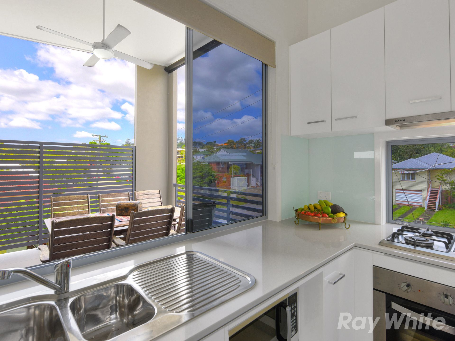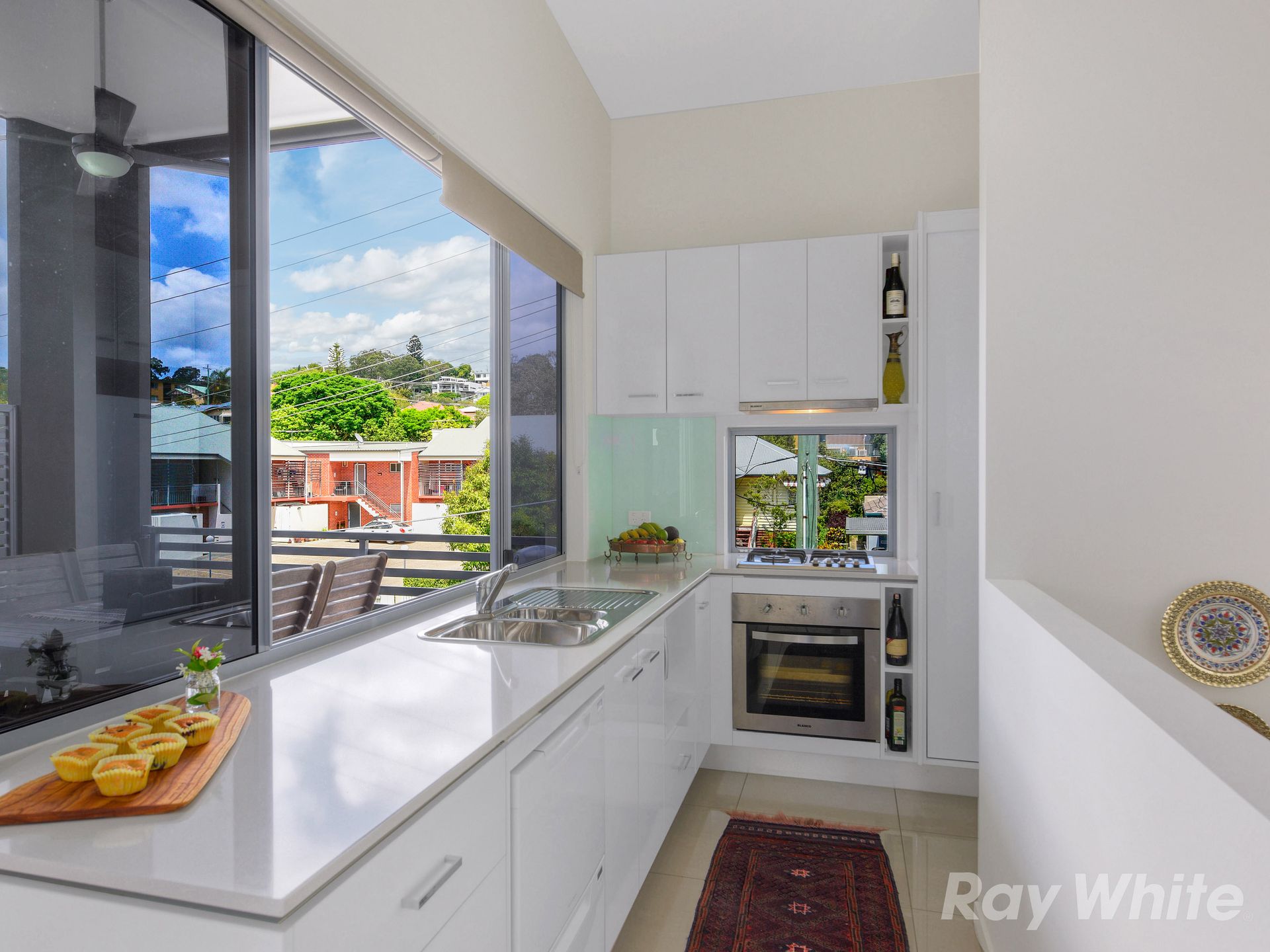 - Caesar stone bench top and glass splashback with servery to balcony
