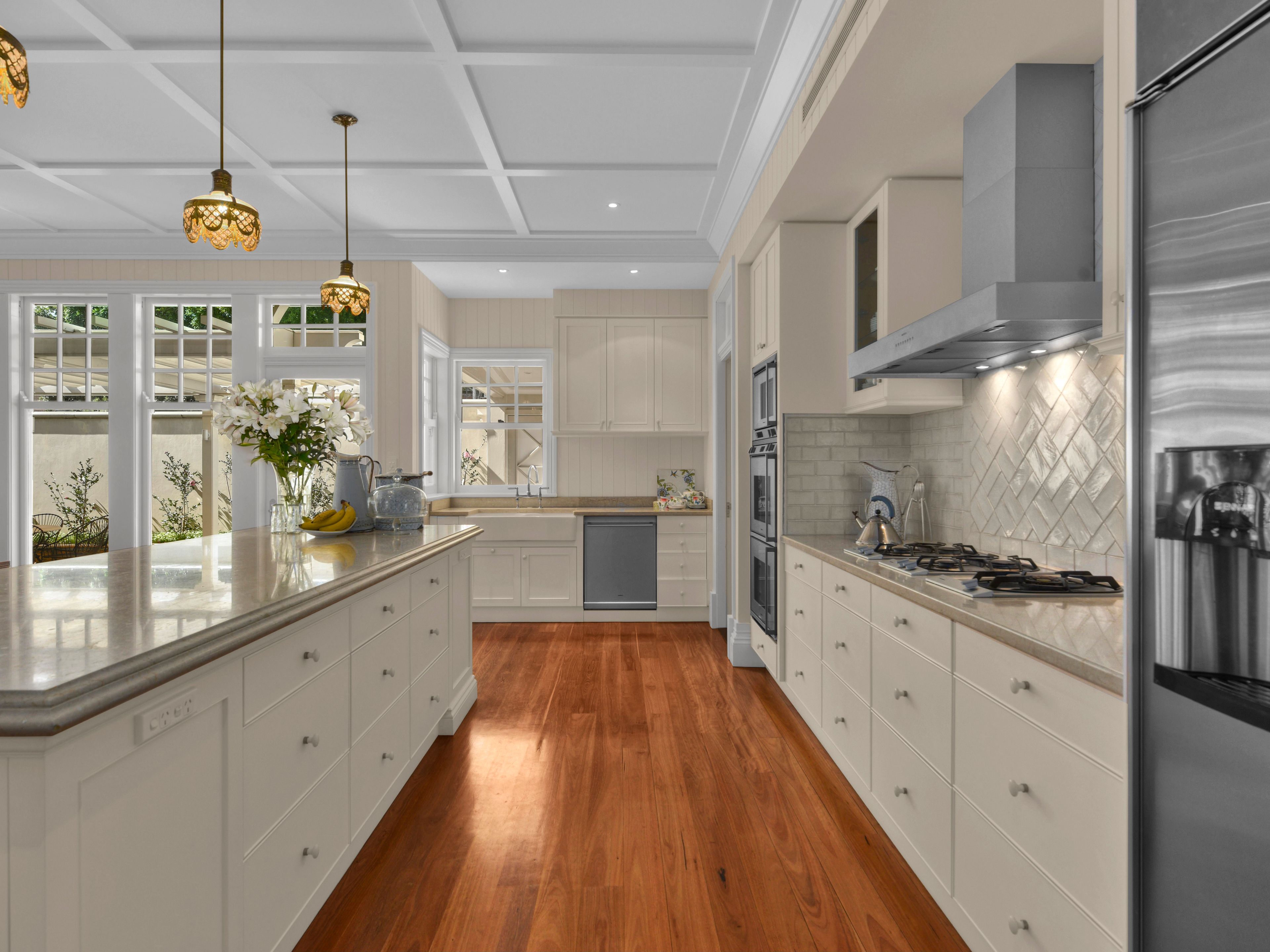 On emerging from the formal area of the home you will be greeted by a vista incorporating the impressive family living area and kitchen through to the private estate like grounds and tennis court at the north facing rear of the property. The oversized kitchen and butler's pantry has Italian marble and Gaggenau appliances, including double oven, steam oven, and two sinks and dishwashers.
