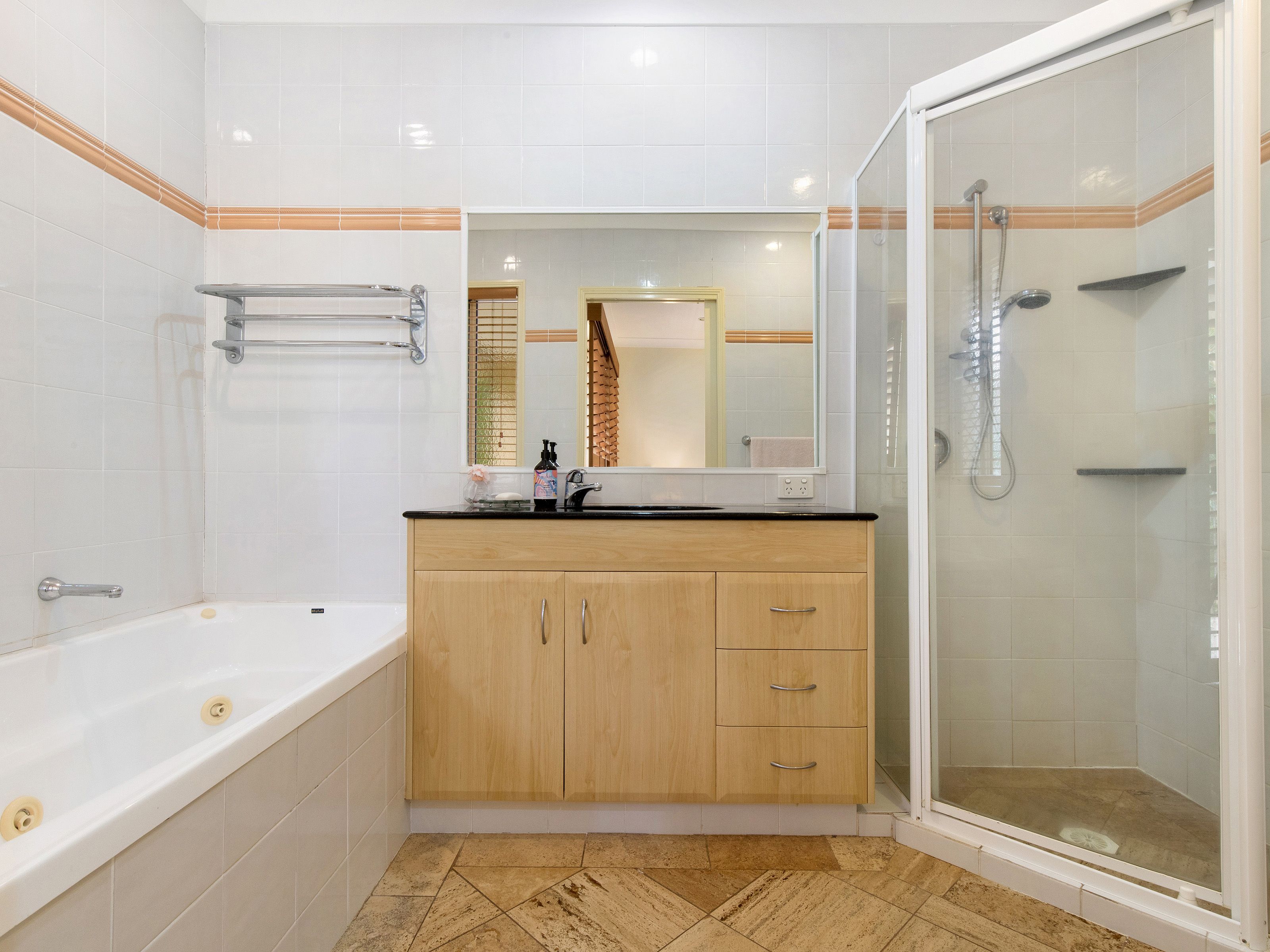 Main residence upstairs • Master bedroom with walk-in robe, ensuite with bath • 3 Spacious guest bedrooms with built in robes & ceiling fans • Stone bench tops • Electric cooking • Dishwasher • Split system air conditioning • Ceiling fans • Plantation shutters • Timber look flooring • Separate laundry with storage • Expansive open plan living & dining spaces