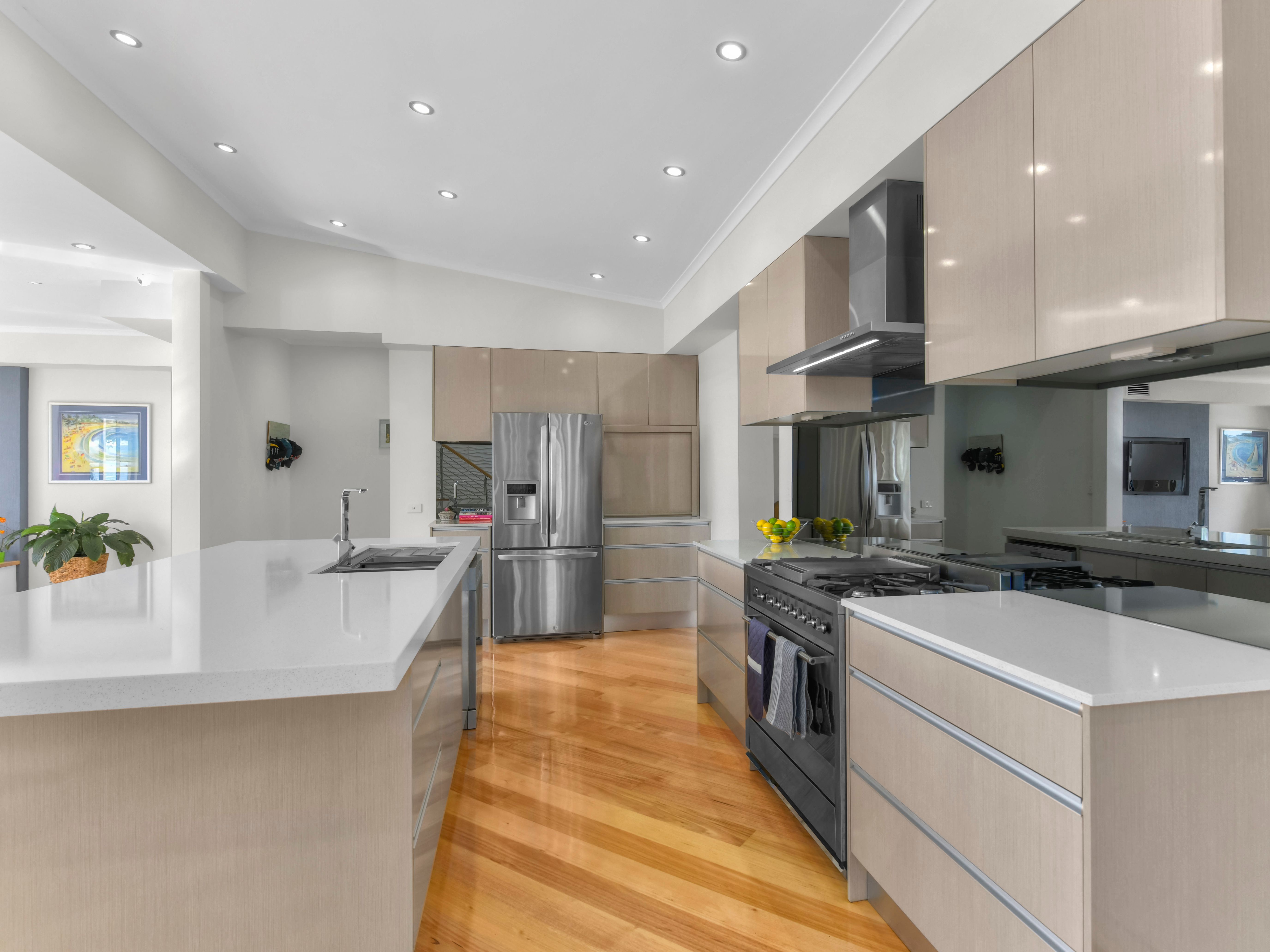 First class appliances throughout, with a 900 wide gas cooktop and fan forced oven, stainless steel rangehood, dishwasher and double fridge space, appliance cabinet, stone benchtops, first class, handleless cabinetry with glass splashbacks, and masses of downlights. Tucked away out of sight is a butlers pantry for all the prep.