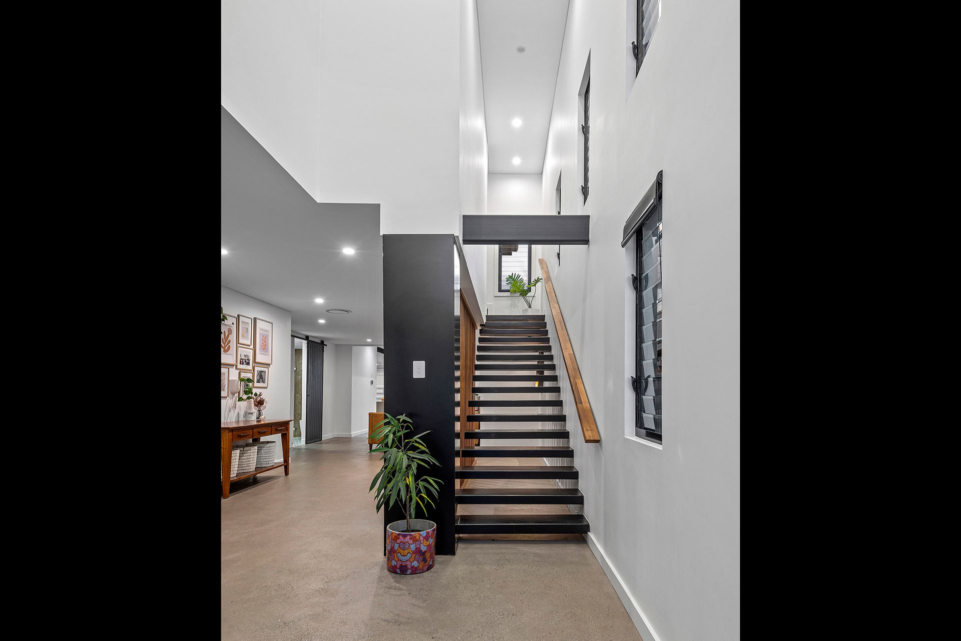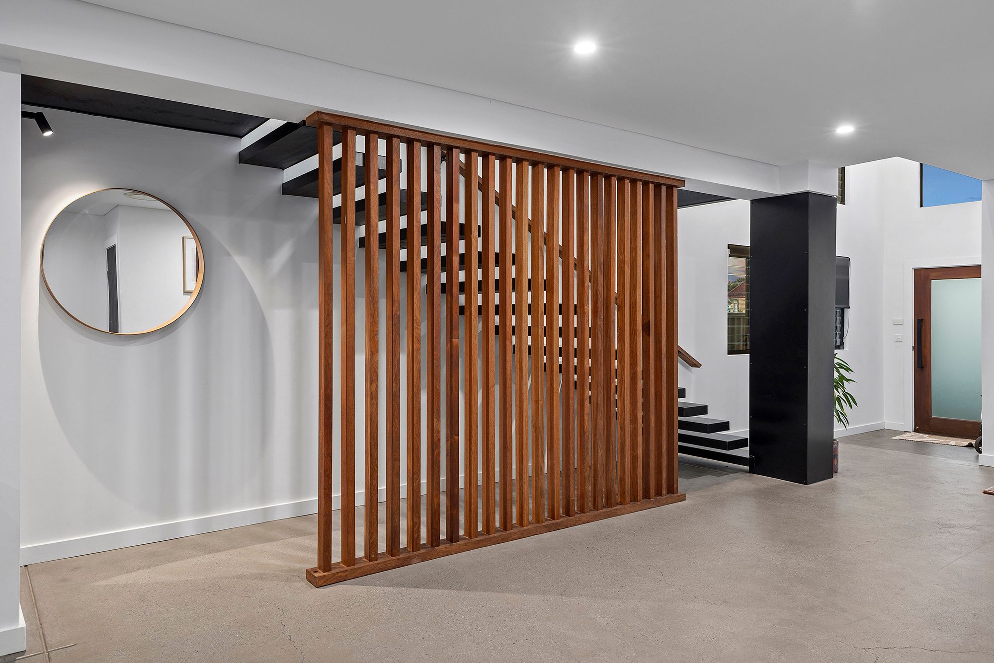 This main entrance is graced with soaring high ceilings, a sleek and stylish palette offset by contrasting rich timber panelling, splashes of black detailing and gorgeous pendant lighting.