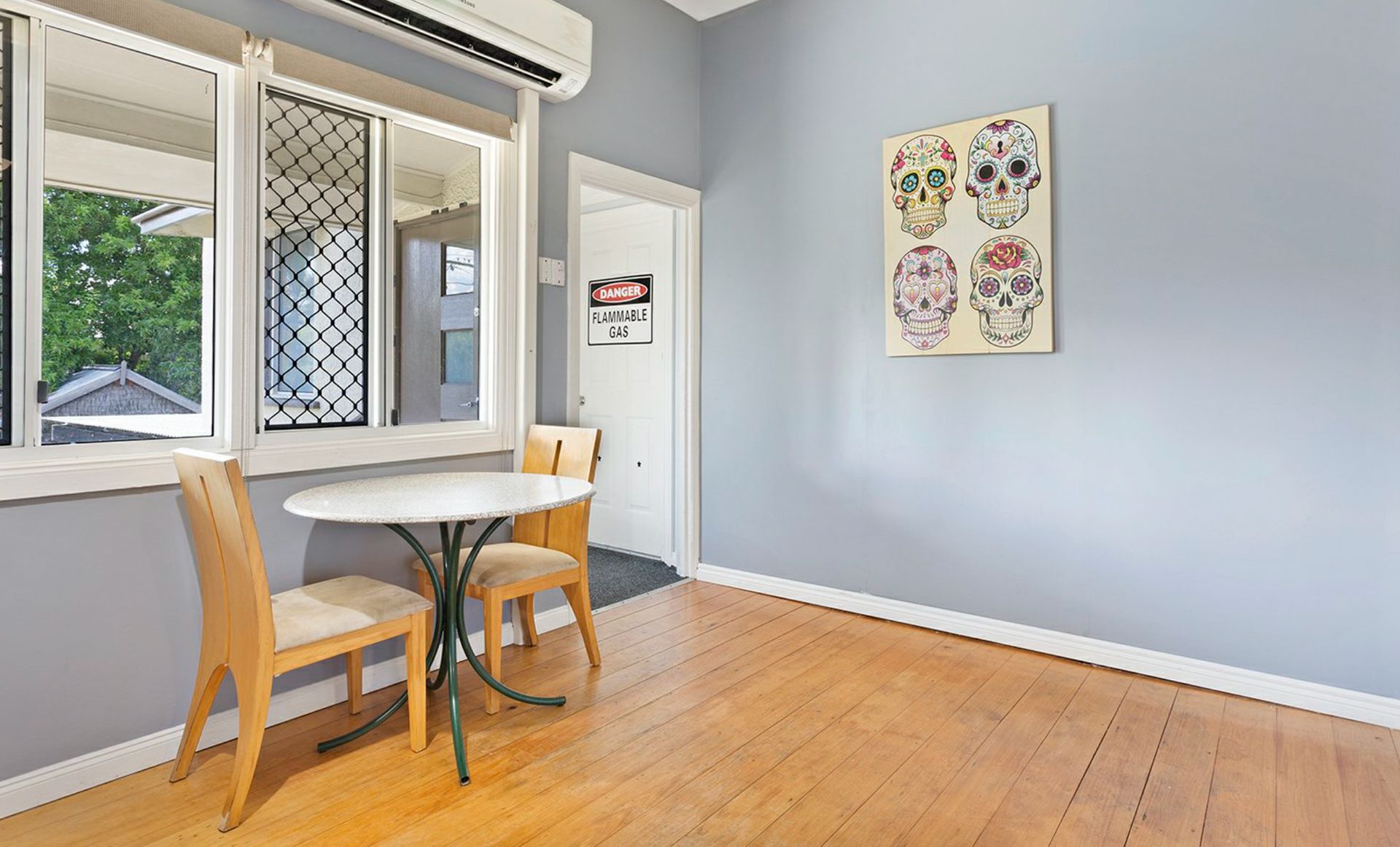 Large open plan living, dining and kitchen with polished floor boards, fans and split system air conditioner.