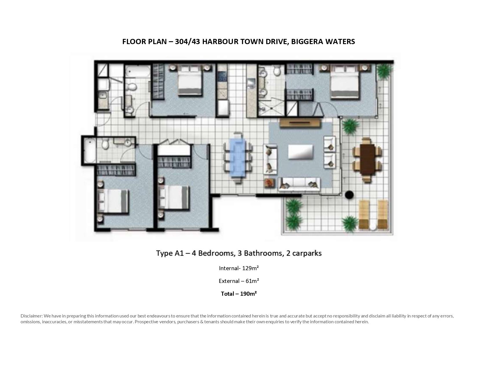 • 4 large bedrooms, 3 en-suite • Corner unit with large outdoor balcony • Quality modern kitchen and bathrooms • Open plan living with zoned ducted air conditioning • 2 Secure basement car parks • Low Body Corporate Fees • Close to Harbourtown, cafes cinema and transport