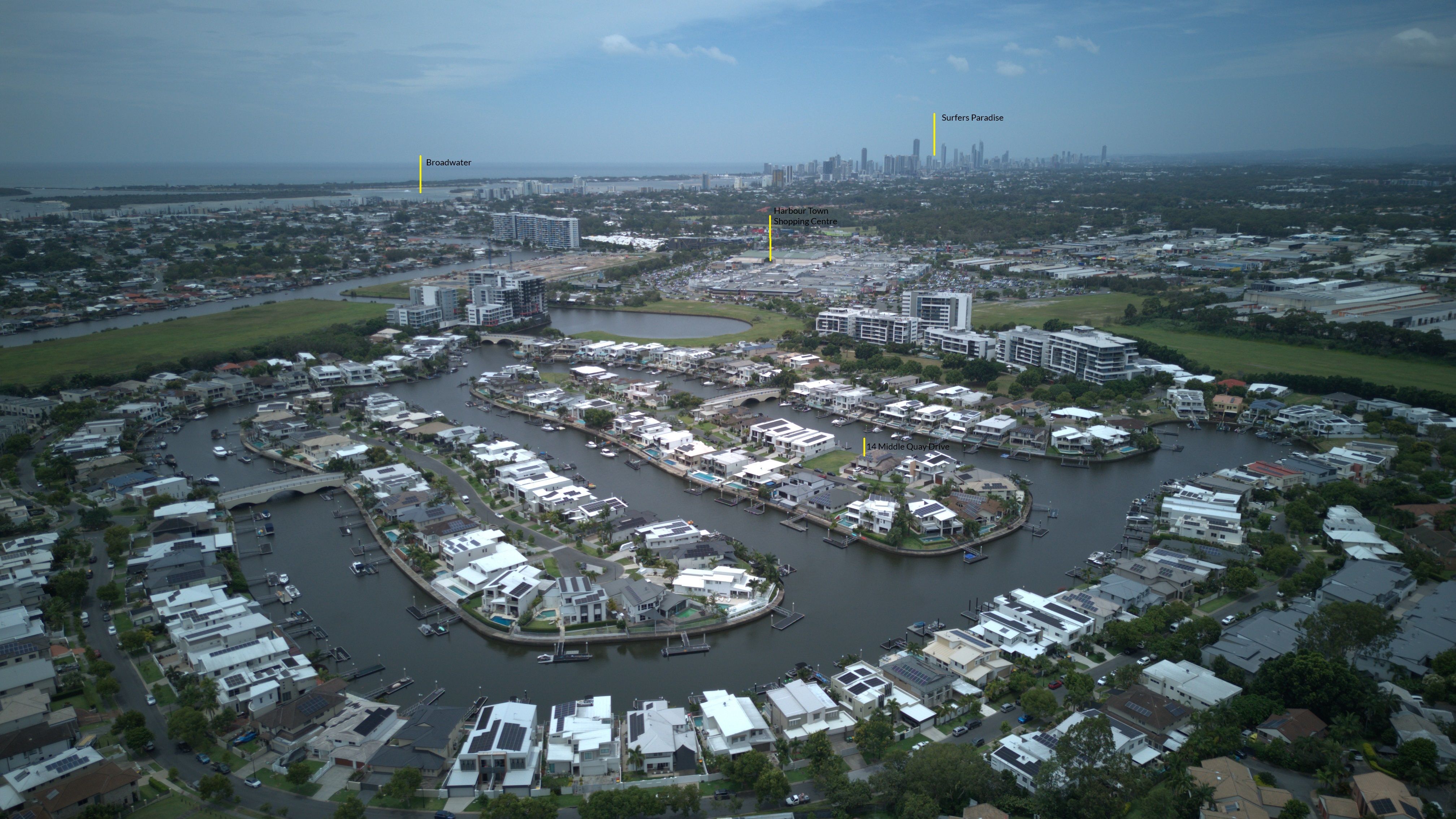 • Multiple living areas, Upstairs informal living area/teenager retreat • Fully equipped modern kitchen with quality appliances, stone bench tops, extra large central island bench. • All bi-fold doors with retractable fly screens • Three car garage with ample off-street parking • Reverse-cycle ducted air-conditioning, • 10,000L rainwater tank • Fully fenced, low maintenance tropical gardens • 13.4kw solar panels • Fully equipped large pontoon • Walking distance to well renowned Harbour Town Shopping Centre and HarbourSide Markets. Harbour Quays development provides street natural gas supply, optic fibre network, over 1.4 hectares of park.