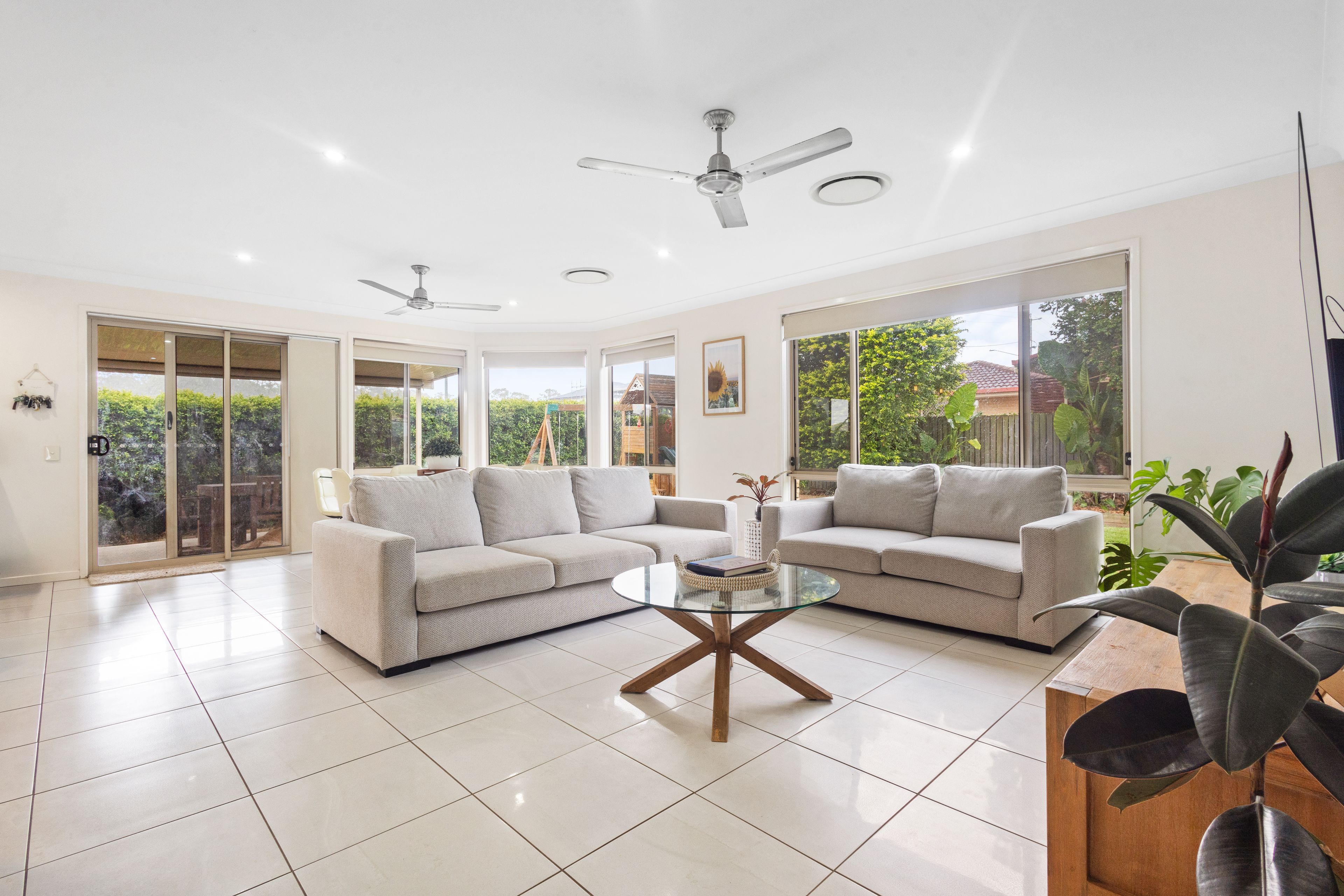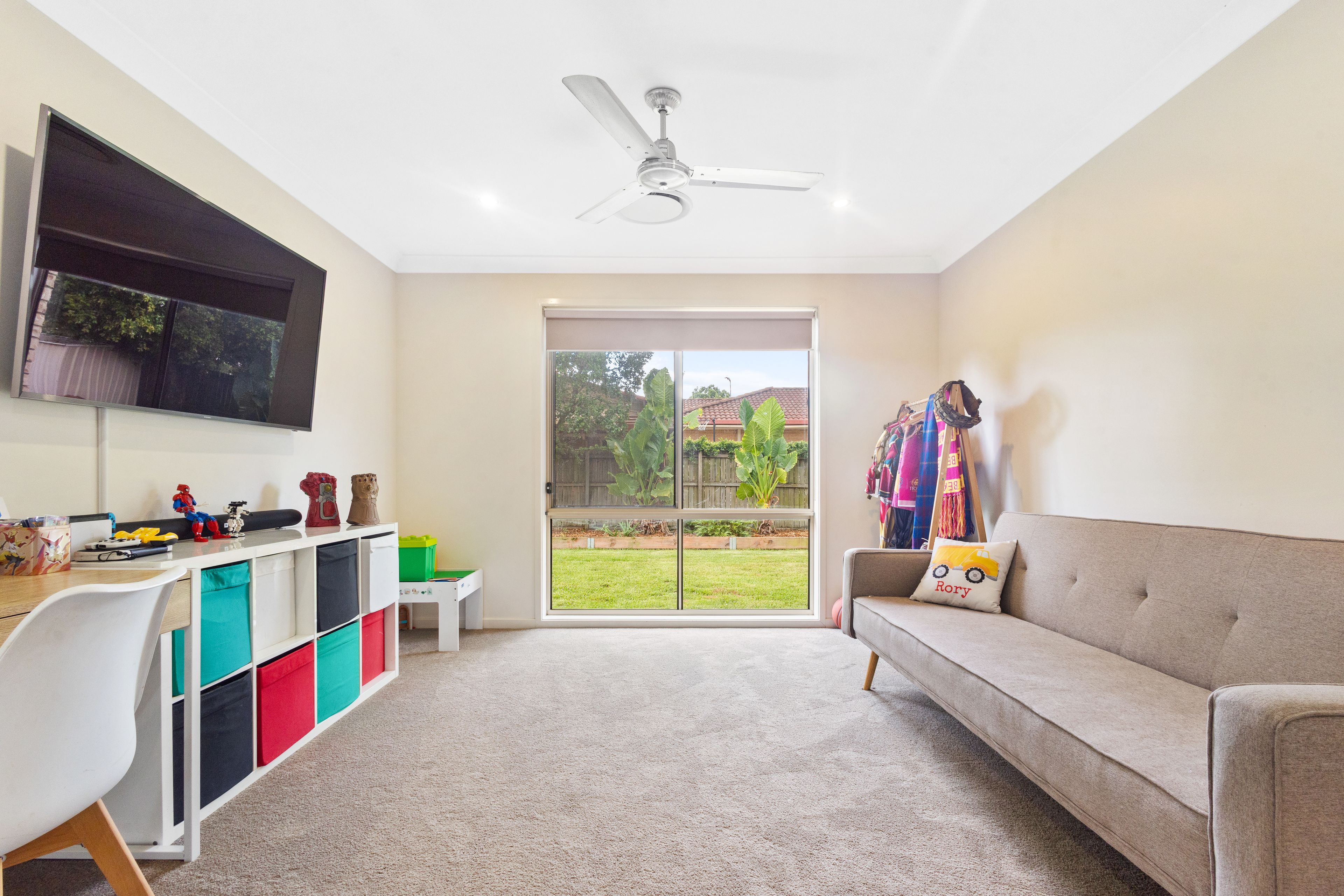 Featuring three carpeted bedrooms, each equipped with ceiling fans and air conditioning. The master bedroom also includes a walk-through robe and an elegant ensuite, featuring clean lines, a timber vanity, and an oversized shower. The main bathroom mirrors this sophistication and refined style, showcasing a luxurious feature bath tub.
