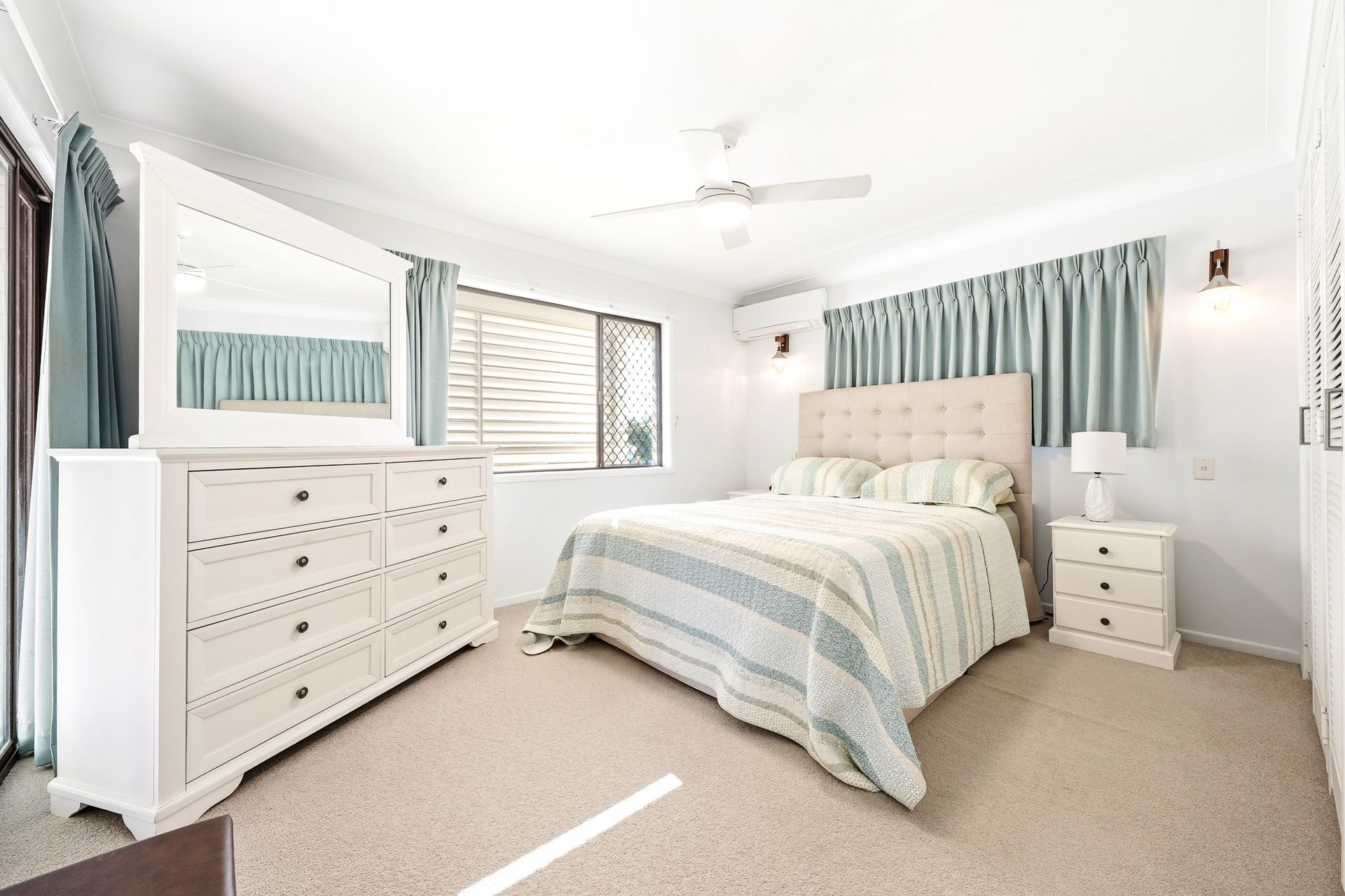 The upper level comprises three bedrooms, all fitted with built-in wardrobes, providing comfortable space for the family. The master bedroom features air conditioning and direct access to the front balcony, creating a private retreat to enjoy the elevated outlook. These bedrooms are serviced by a family bathroom, complete with a separate toilet for added convenience.