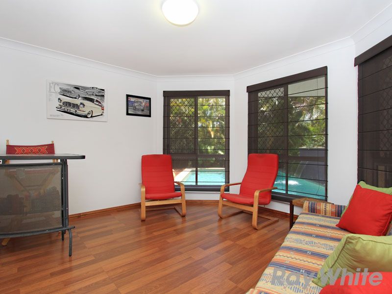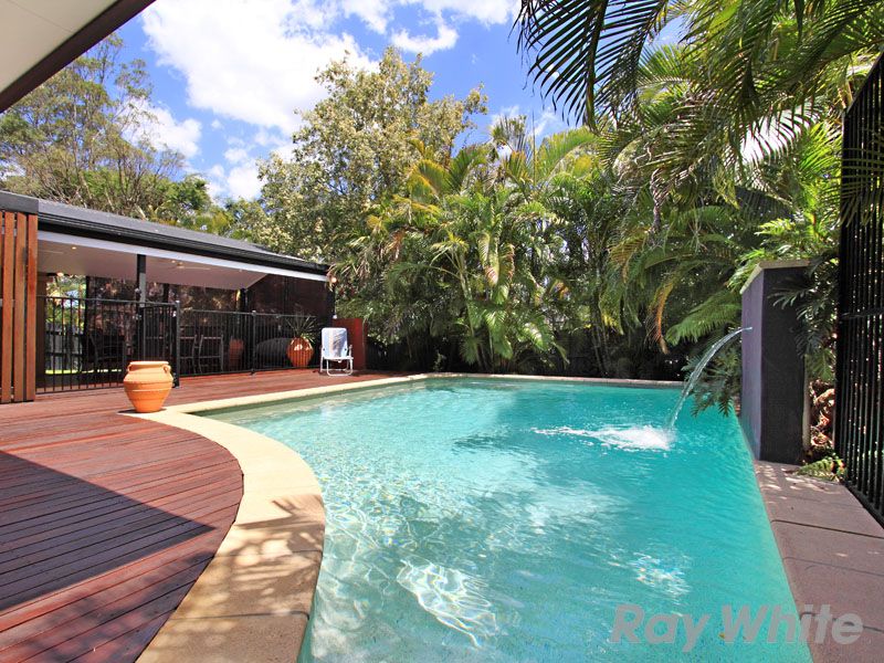 These areas lead out through sliding glass doors to the timber decked, covered and fully lined alfresco and entertainment area at the rear of the home, complete with ceiling fans and modern downlighting. Adjacent is the palm fringed in ground salt water pool and waterfall, fully fenced and very private creating a superb enviroment for relaxing, entertaining and enjoyment.