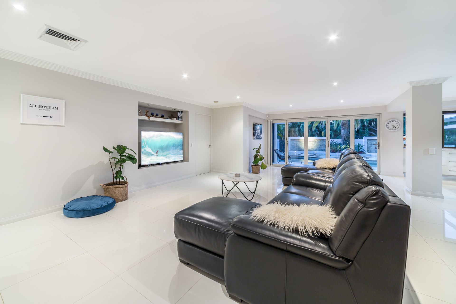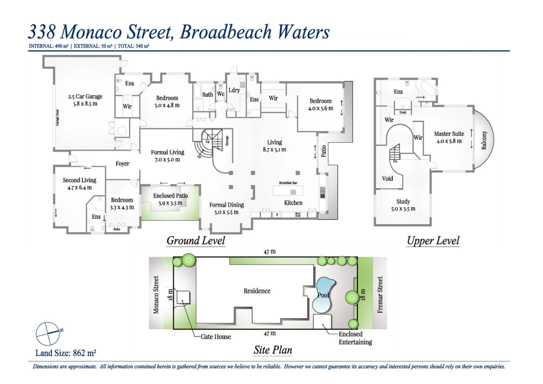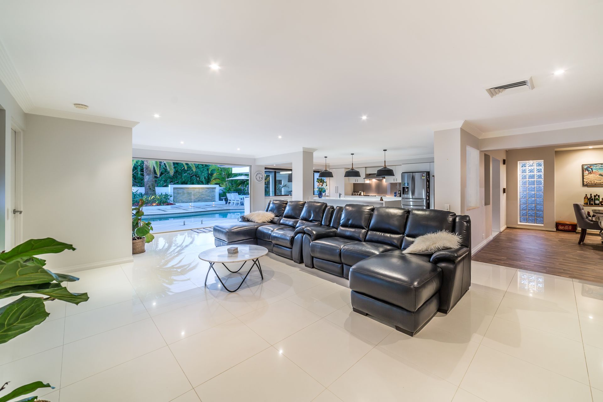 Bedrooms 2,3, and 4 all feature ensuites with bedroom 5 offering its own entrance for easy conversion to a home office. Privacy is assured with no adjoining bedroom walls. A feature ornate staircase leads to the Master Suite, complete with its own living room and study nook and large walk in robe leading into the modern master ensuite. Double sliding doors open onto a balcony overlooking the sparkling pool with direct views to the Gold Coast Skyline.