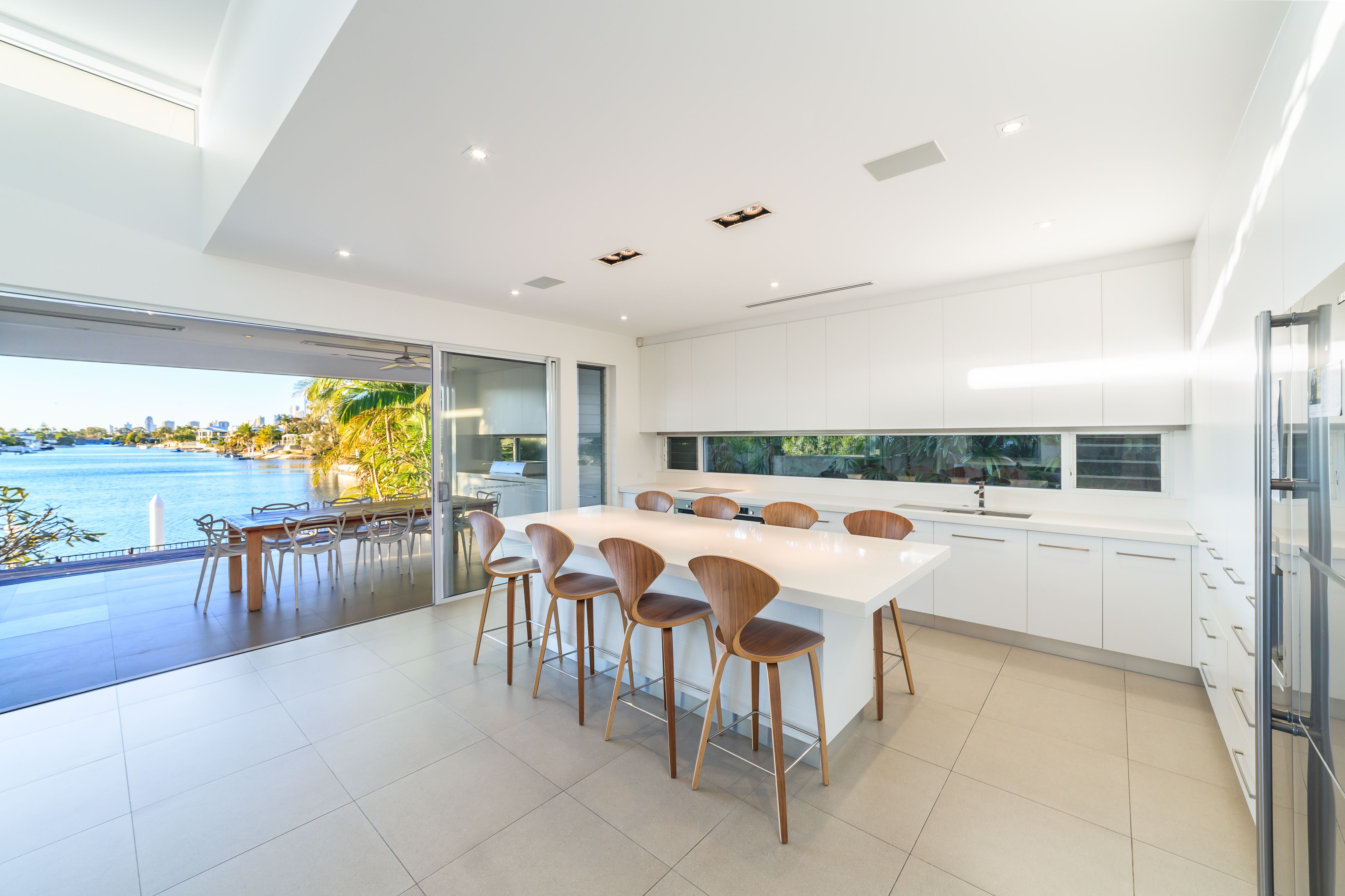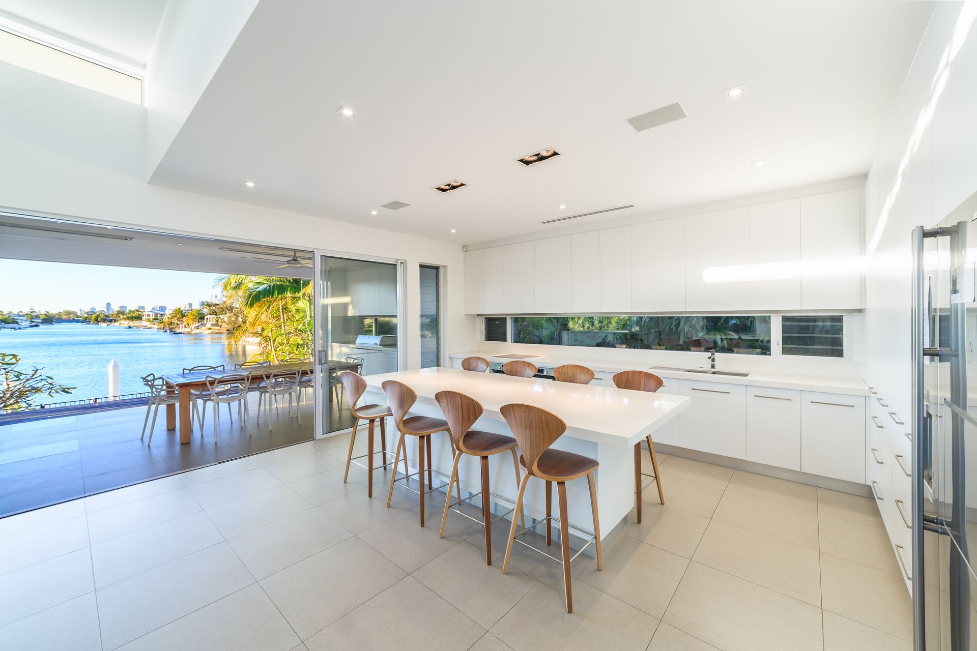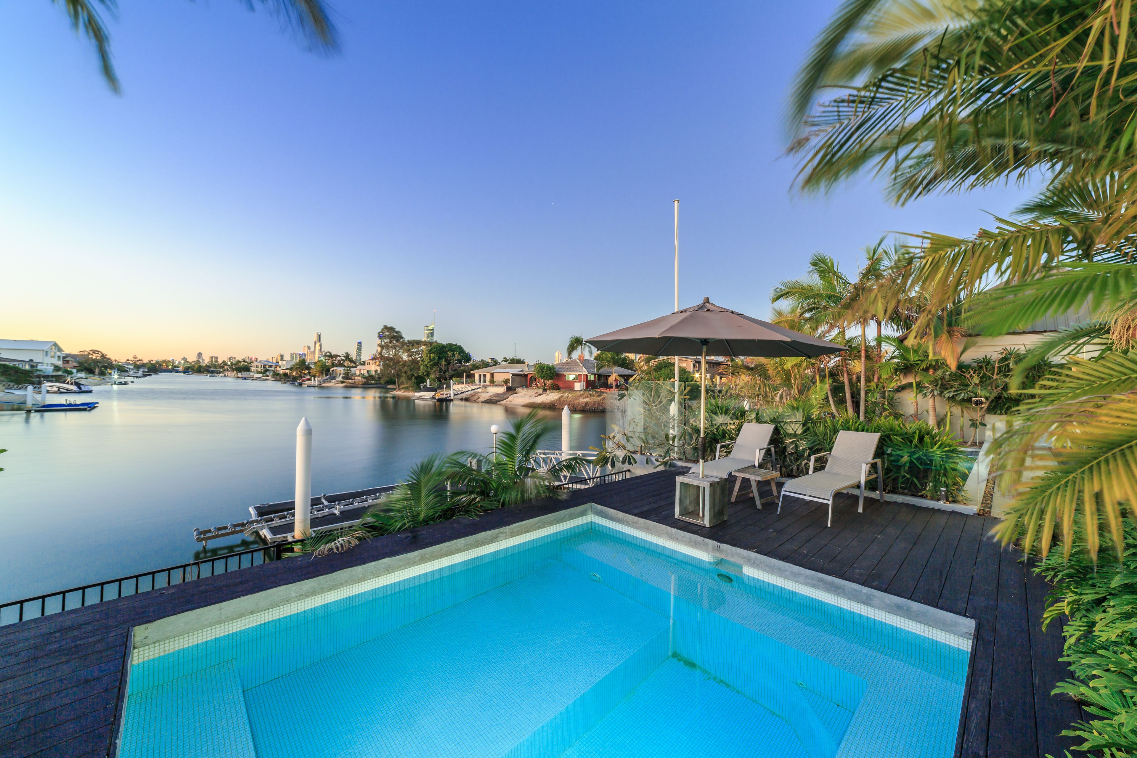 • North to water, single level, luxury waterfront haven with three bedrooms, three bathrooms • Sun-infused living spaces, showcased by an internal atrium, glimpses of greenery and crisp white interiors • Perched at the end of a wide expanse of water which stretches down the mouth of the canal • Kitchen perfection awaits, with stainless steel double ovens, induction cooktop and an integrated Miele dishwasher • A supersized island bench, able to accommodate 12 people, doubles as a dining area • Living room is flanked by custom cabinetry and integrates seamlessly with the alfresco area • All bedrooms with their own alfresco area and serviced by deluxe bathrooms • Master suite with water views, electronic exterior louvres, walk-in robe and ensuite with rain shower • Alfresco area with views of the Gold Coast skyline, kitchen with gas BBQ and fridge drawer, in-roof heaters and Bose speakers • Manicured, low maintenance gardens, fringed by fragrant frangipanis and mature palms • Heated plunge pool plus a 18m private sandy beach and a large floating pontoon • Double garage, multiple storage rooms, ducted and zoned air-conditioning, Crimsafe screens • Video intercom, security system and ceilings which range from approx. 9ft to 12ft • Less than 5 minutes from vibrant Broadbeach, Pacific Fair and Star Casino
